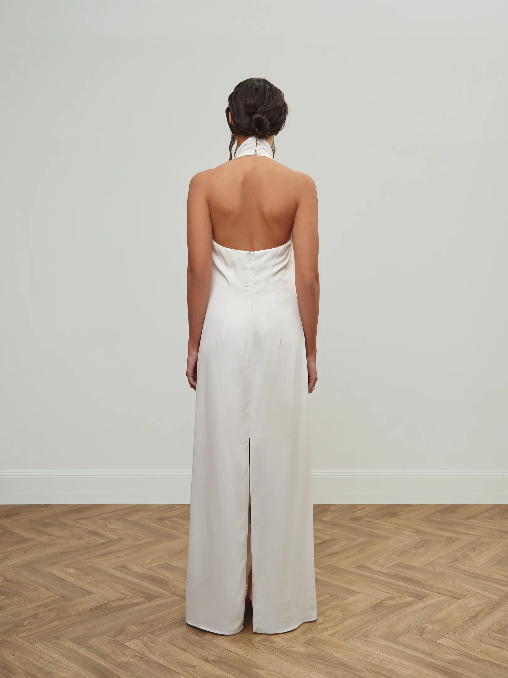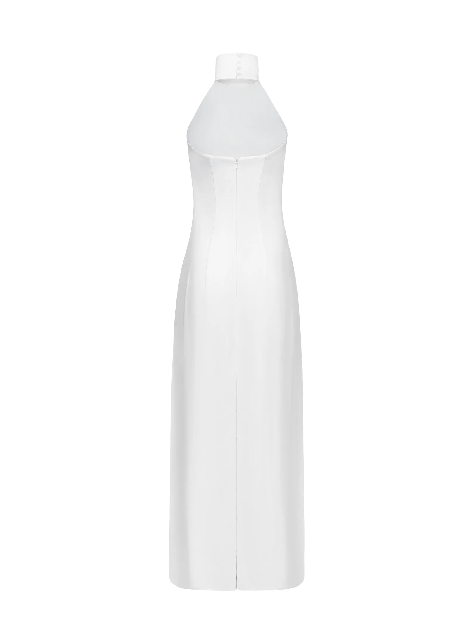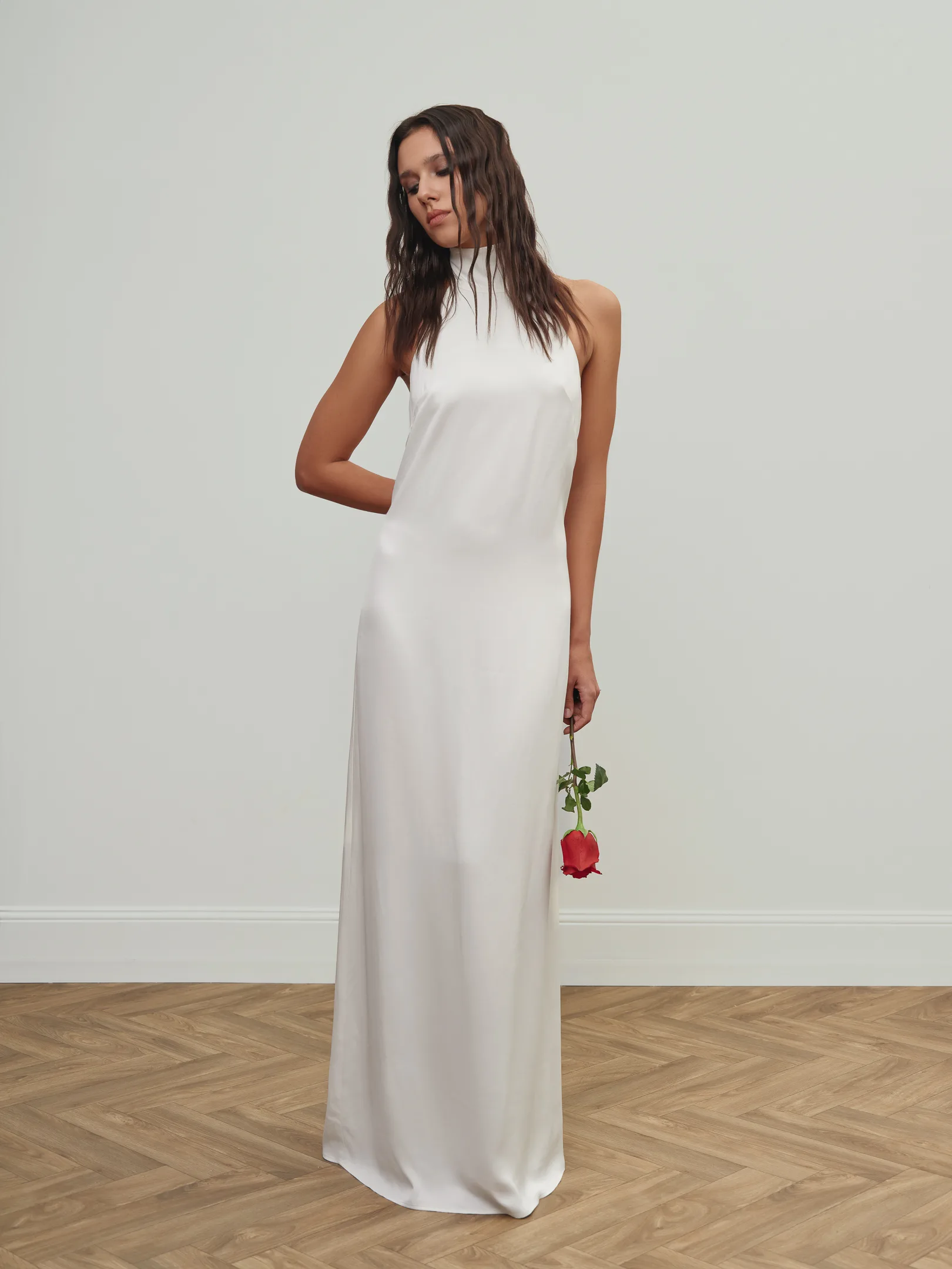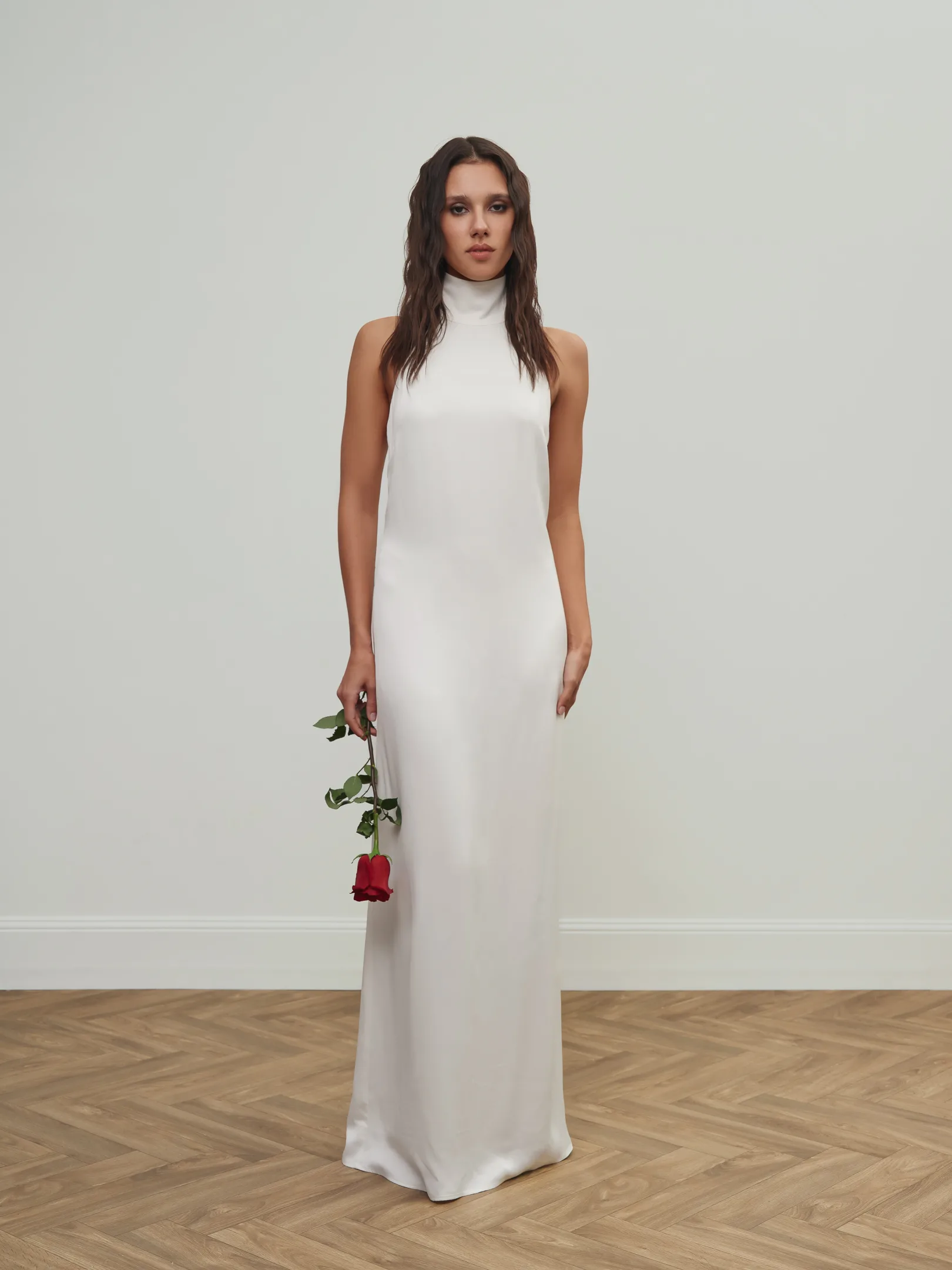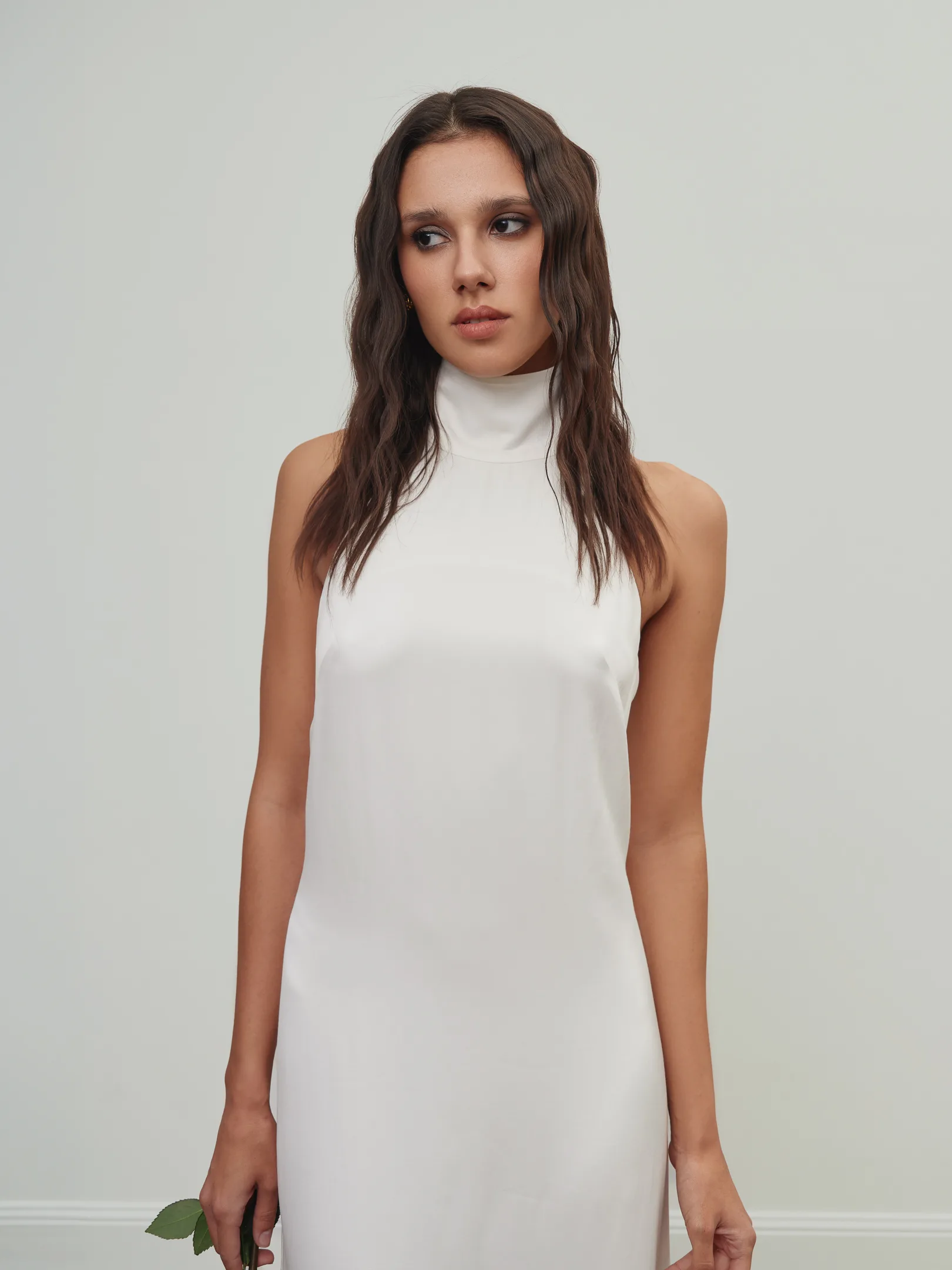 The milk halter dress that we have been dreaming about for a long time, and finally found the same fabric. Natural viscose with delicate gloss, pleasant to the body. The dress has an open back and a soft fit: it fits the chest and hips, but leaves a free tummy without succo. Ideal for receipts and milk dress codes.