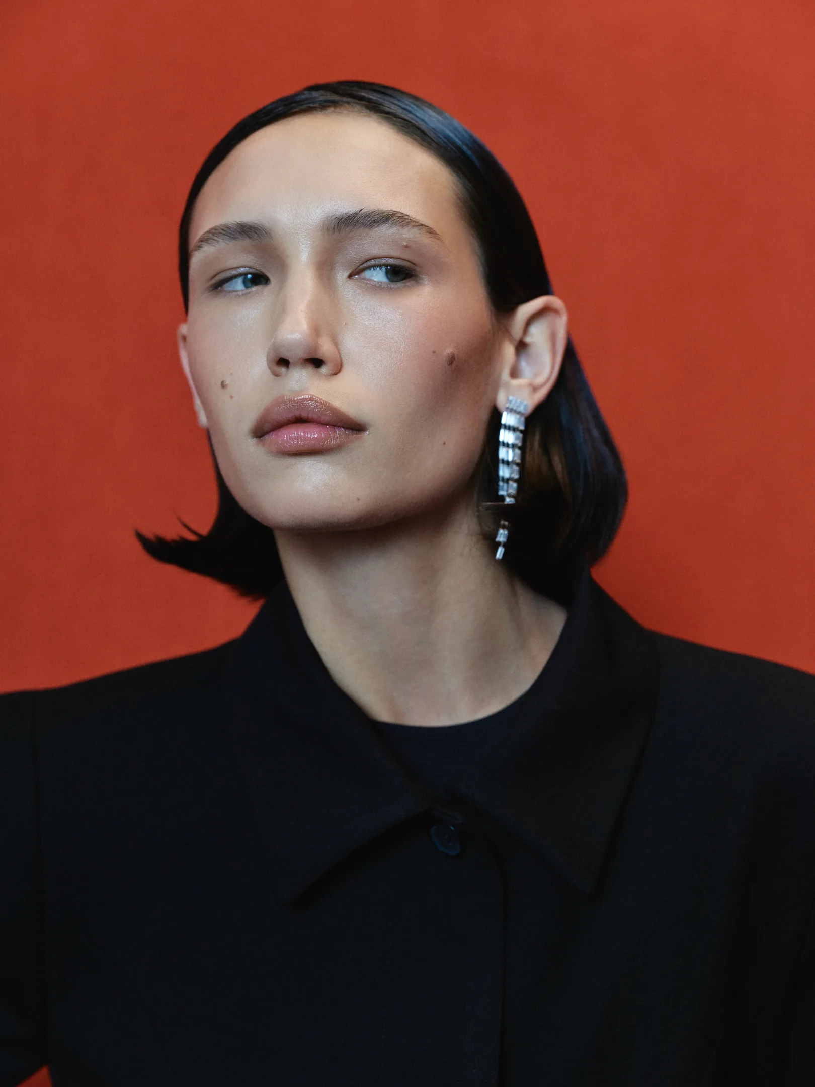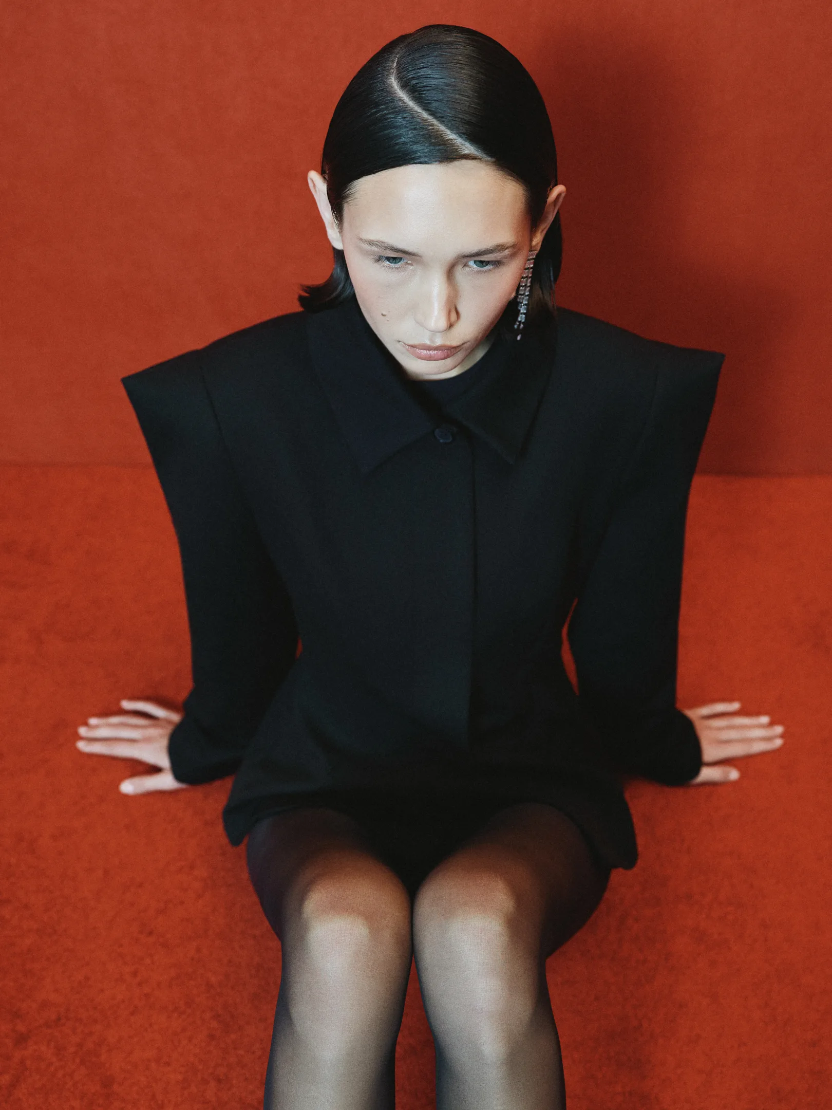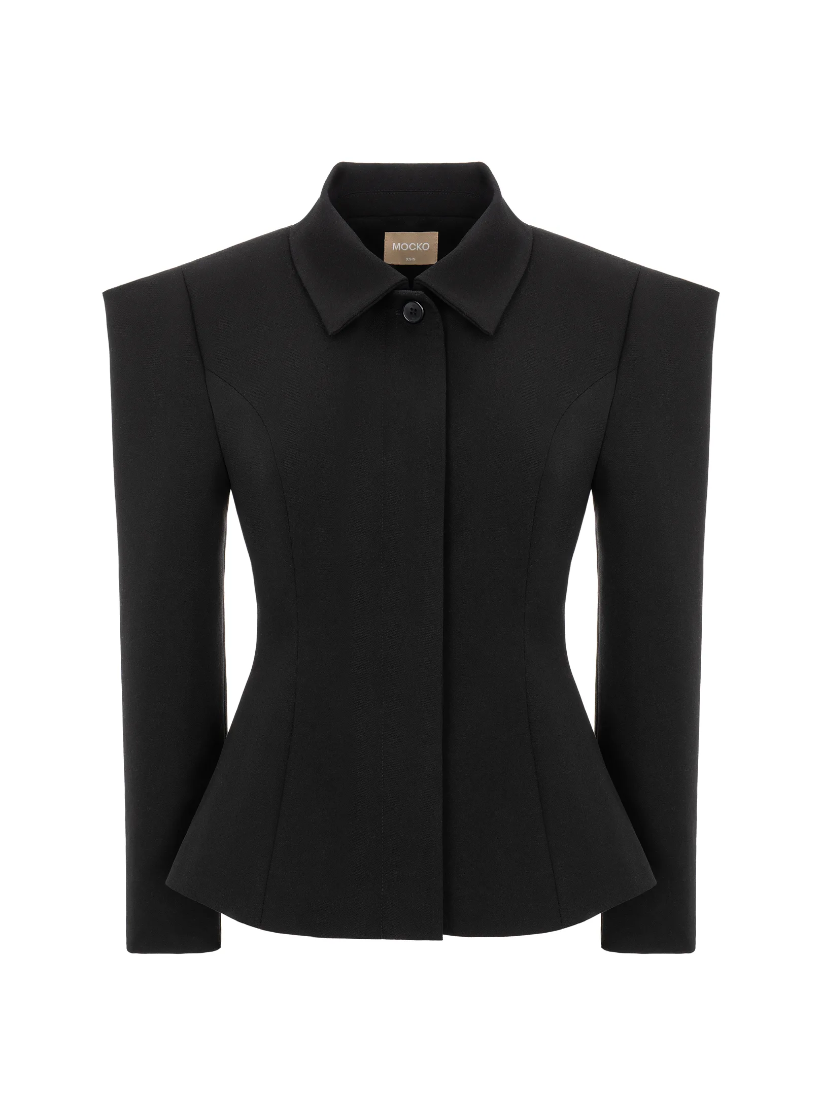 The silhouette jacket features bold shoulders that add drama and confidence to any look. Its fitted cut perfectly emphasizes the figure, while the classic collar introduces a touch of restrained elegance.