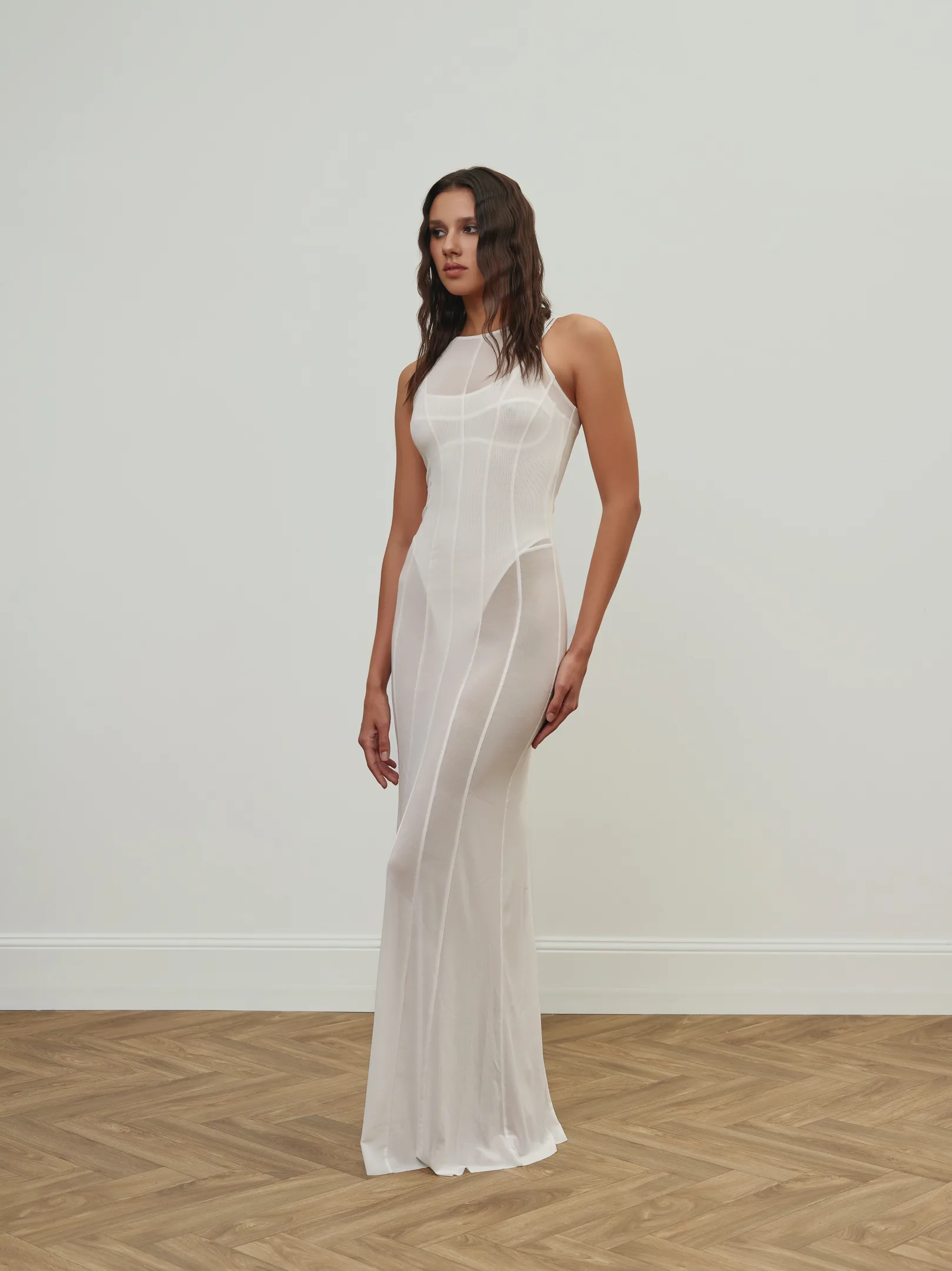Maxi-length mesh dress featuring vertical shaping stripes, a closed neckline, and open arms.