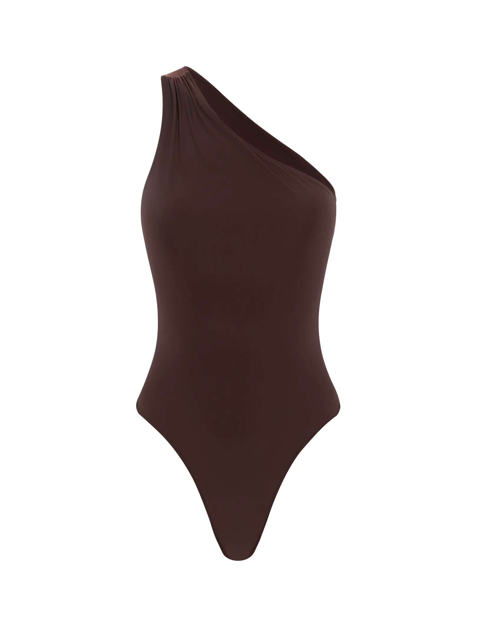 Thanks to the asymmetrical design, the swimsuit visually stretches the figure and makes the silhouette slimmer.