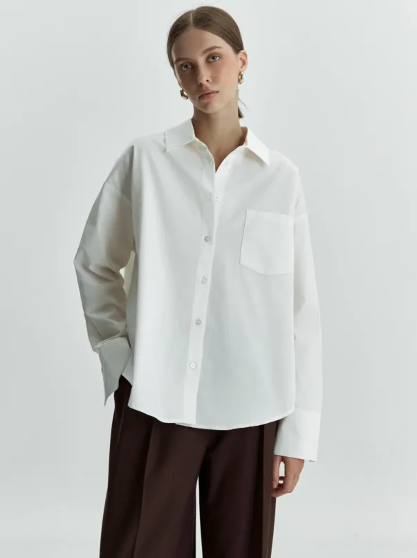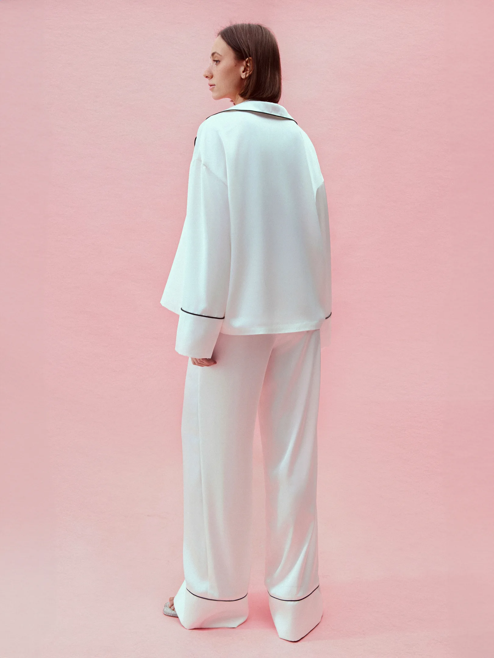 The milky-colored satin fabric set combines elegance and comfort. The loose-fitting shirt allows for lightness and freedom of movement, while the soft sheen of the fabric adds a touch of luxury to the overall appearance. The pants complement the top, creating a stylish harmony that is suitable for any occasion.