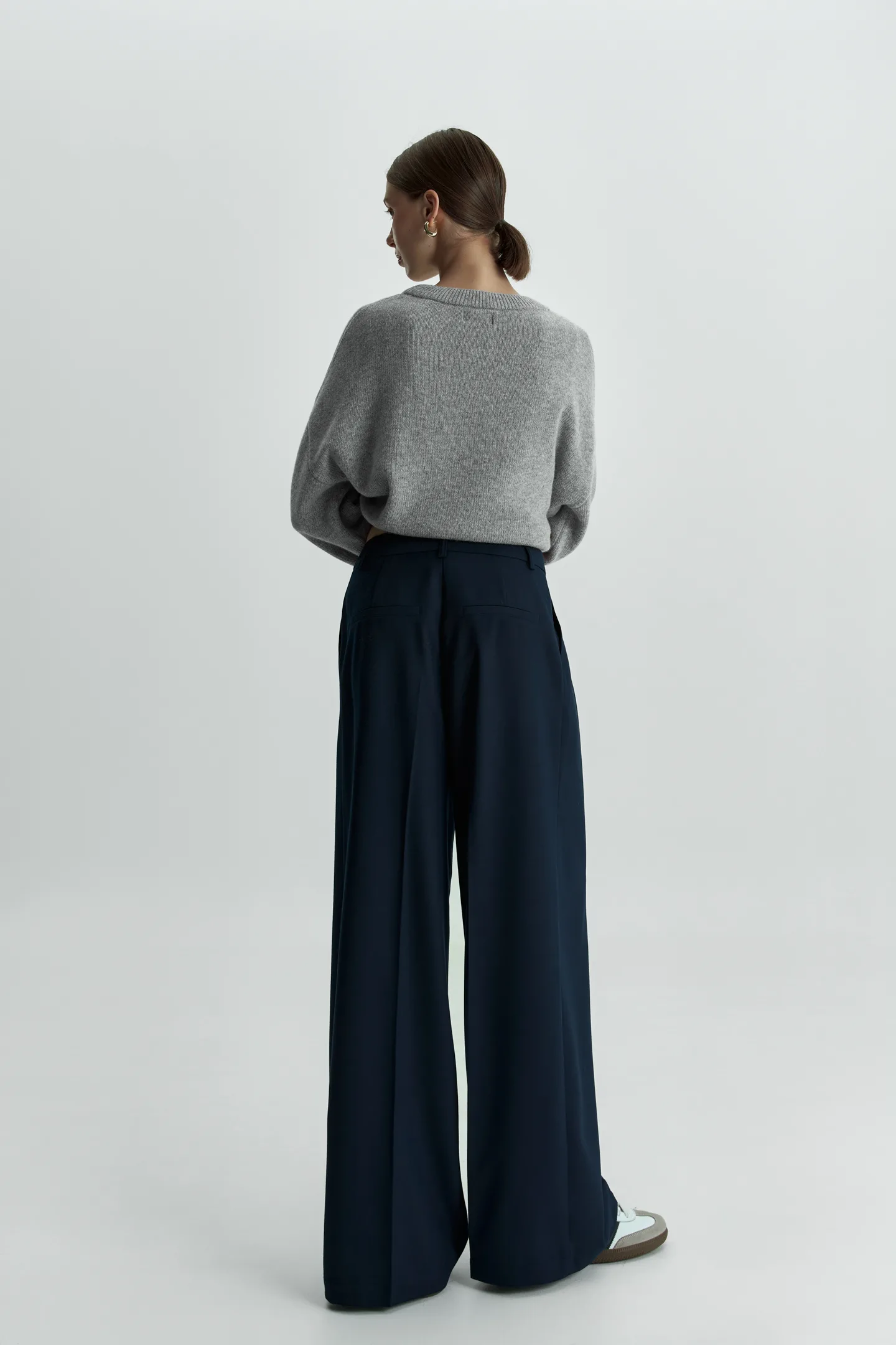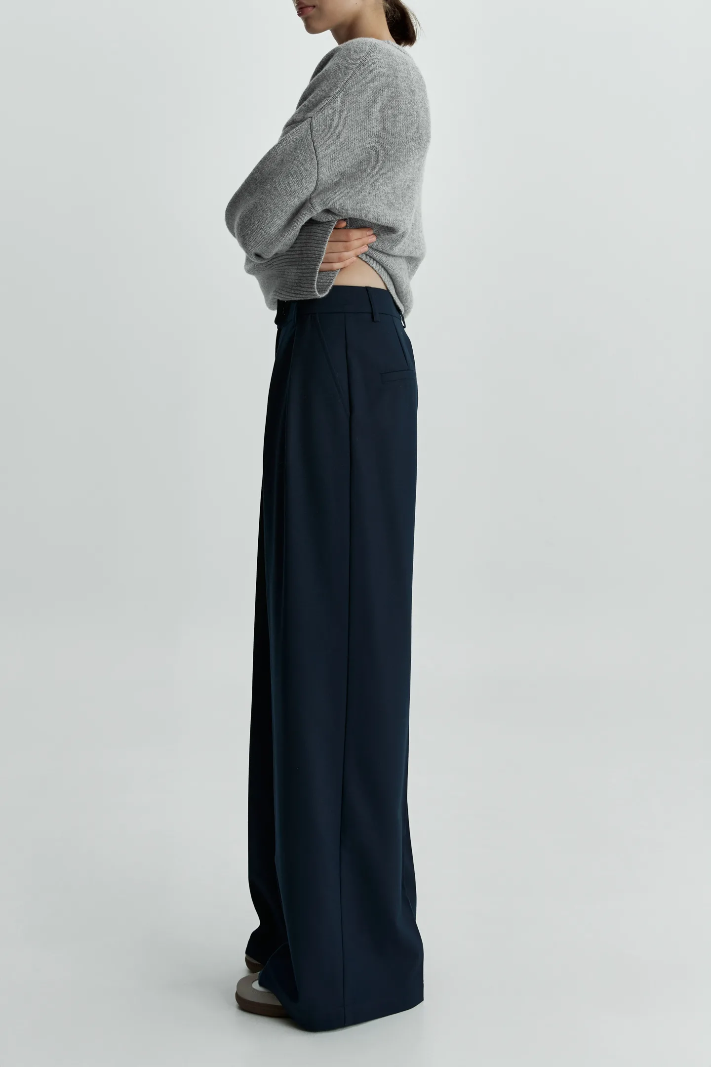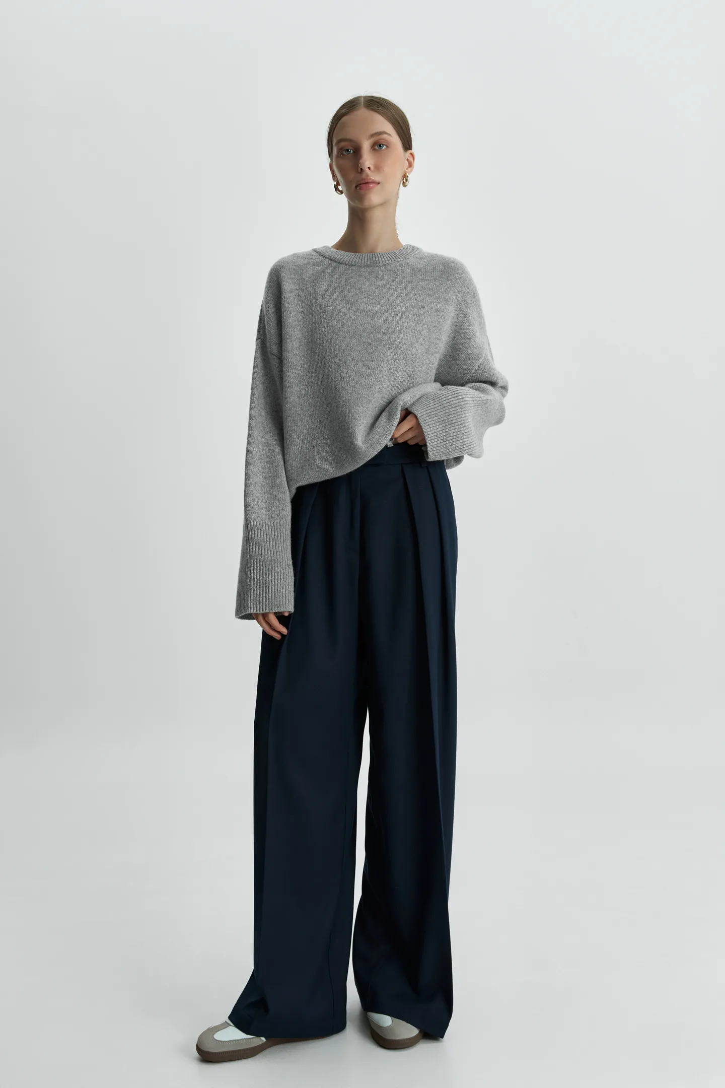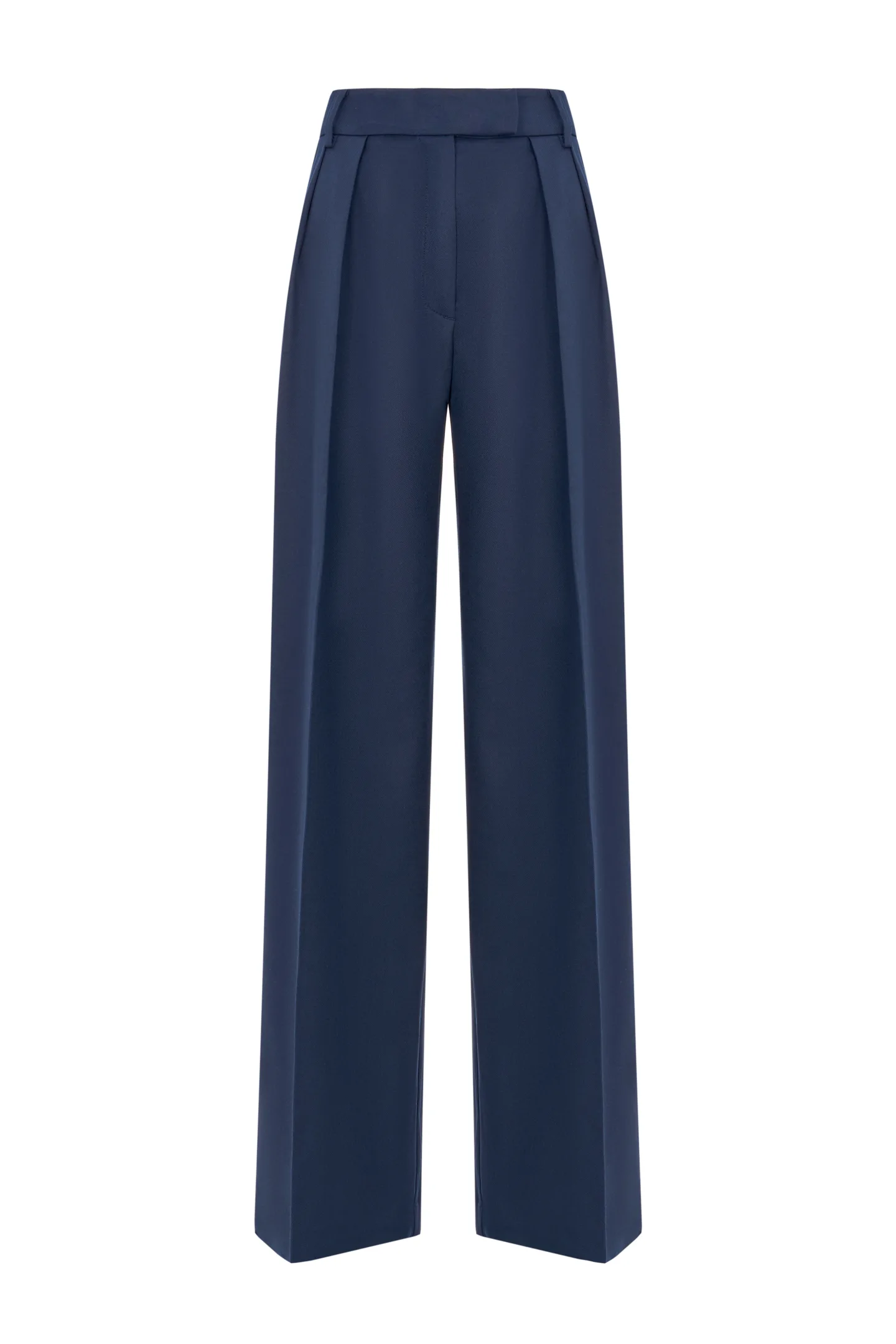 An elegant model with a high fit that visually lengthens the legs and narrows the waist thanks to deep folds and smoothed edges. Comfortable laconic pants with pockets in the side seams. The thing on which the wardrobe is based.