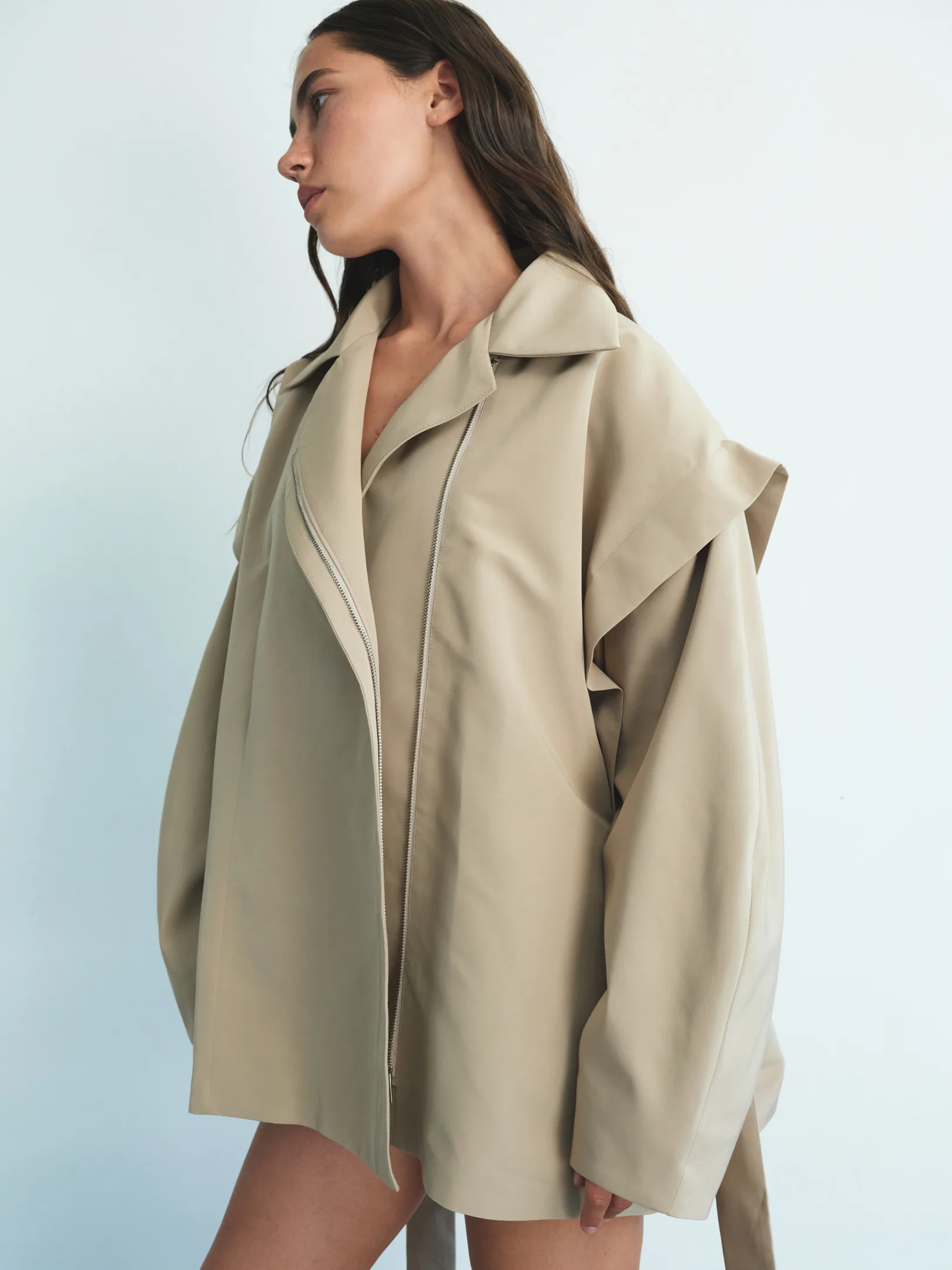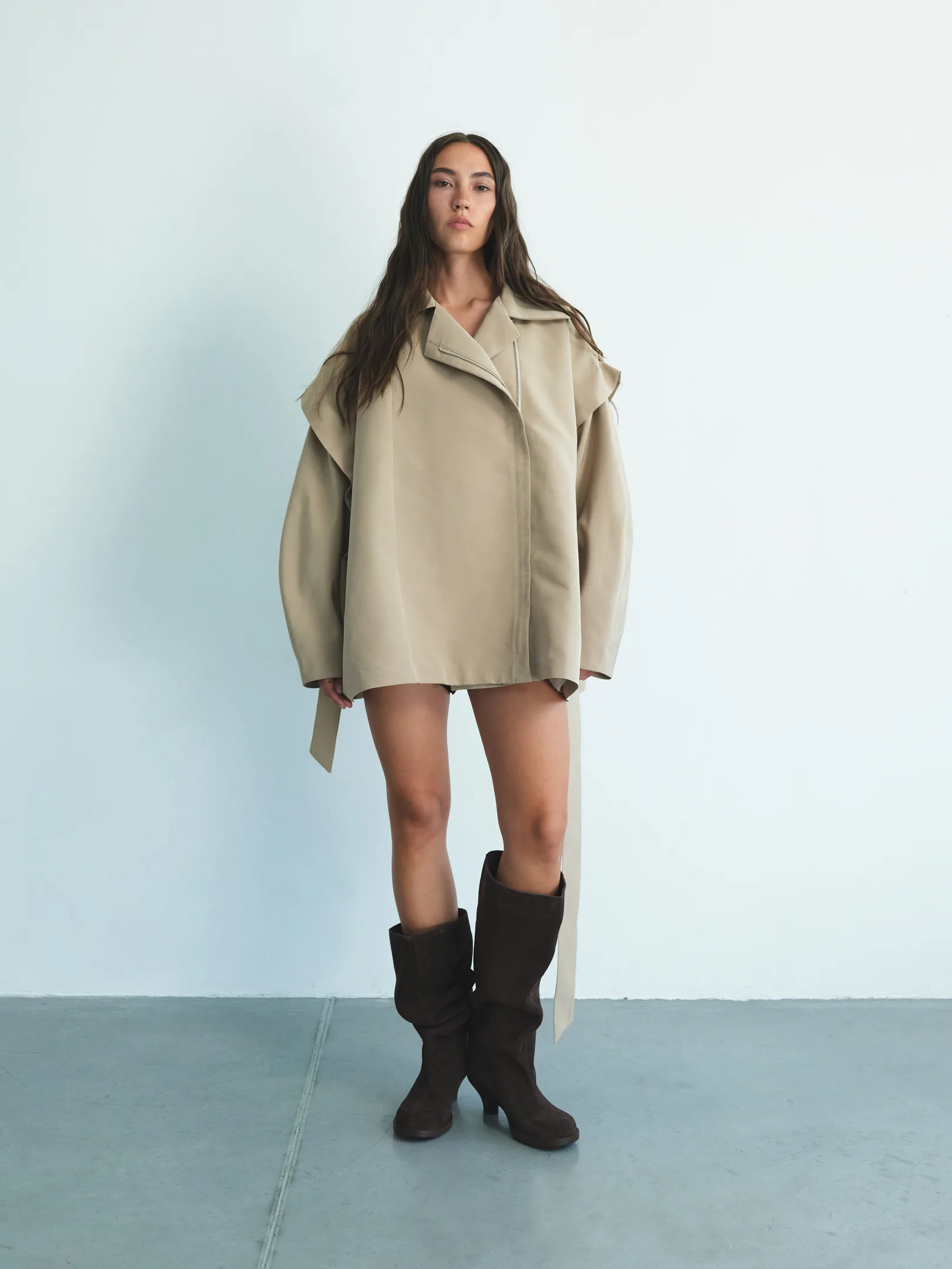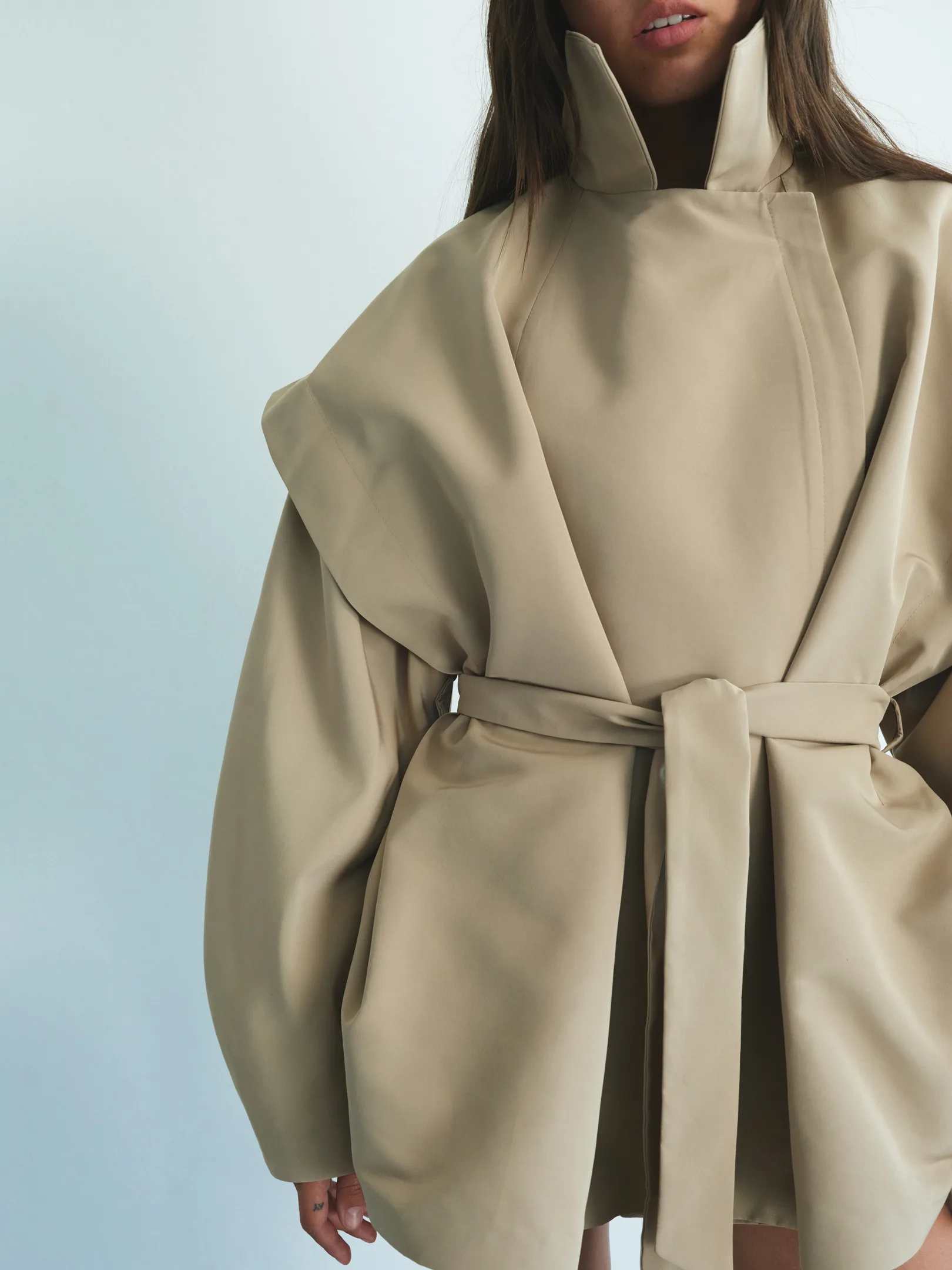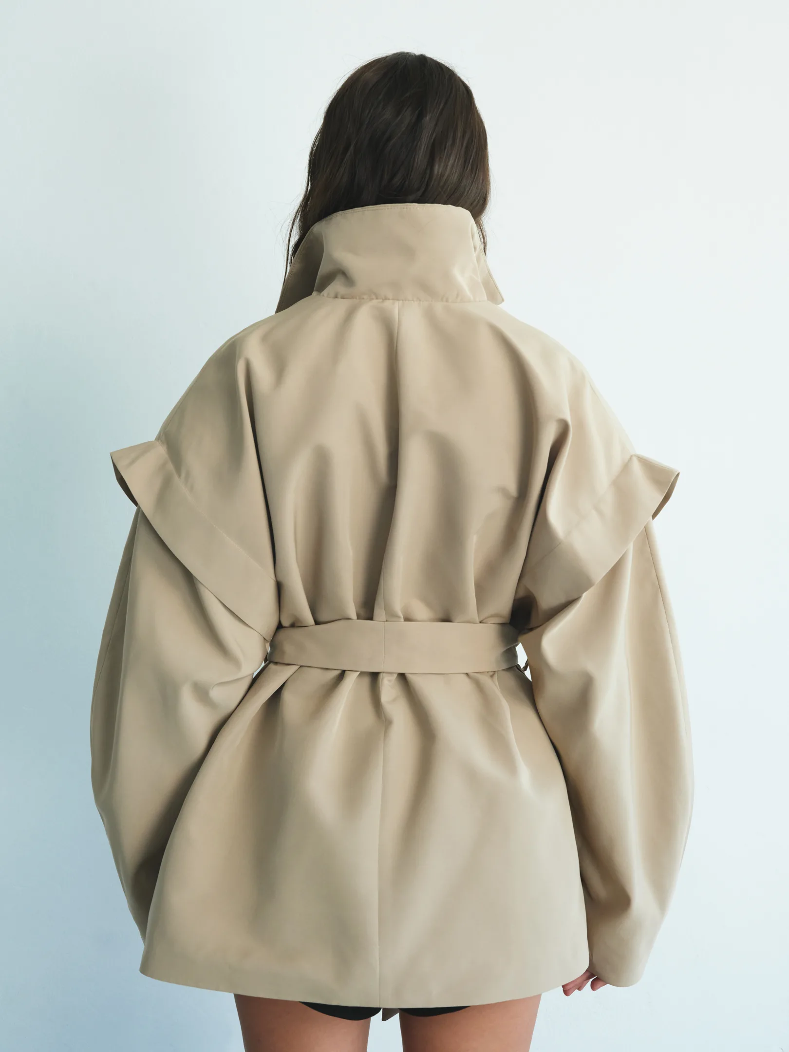 A shortened trench coat is a versatile outerwear piece that meets seasonal needs. The stand-up collar adds structure and enhances the overall look. The model is available in three colors: camel, graphite, and khaki – classic shades that easily blend into any wardrobe.