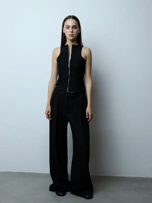A double-sided top made of dense elastic fabric combines comfort and versatility. The model can become both a base in everyday outfits and an addition to evening ones. The fabric has a special structure that gives it a thickness similar to the thickness of corsets and holds the shape well. There is a metal zipper on the back of the top, so it can be worn backward. The trendy neckline of the top emphasises the chest. Style with jeans, skirts, or pants.