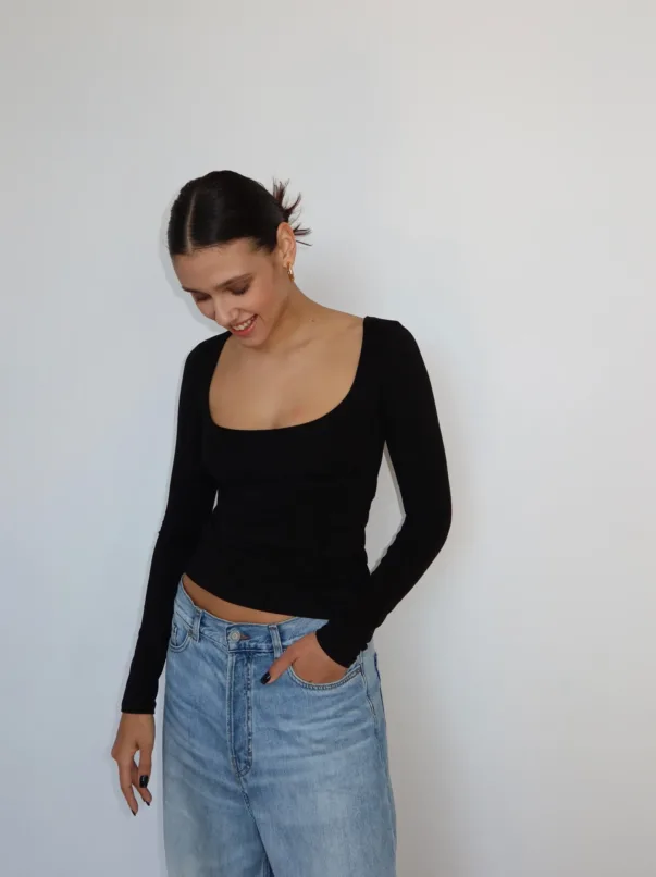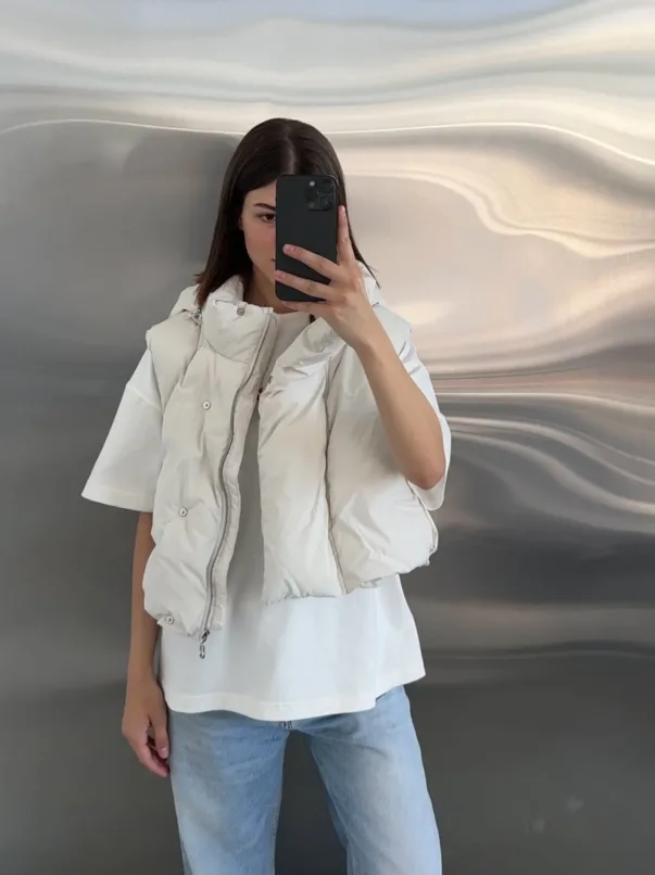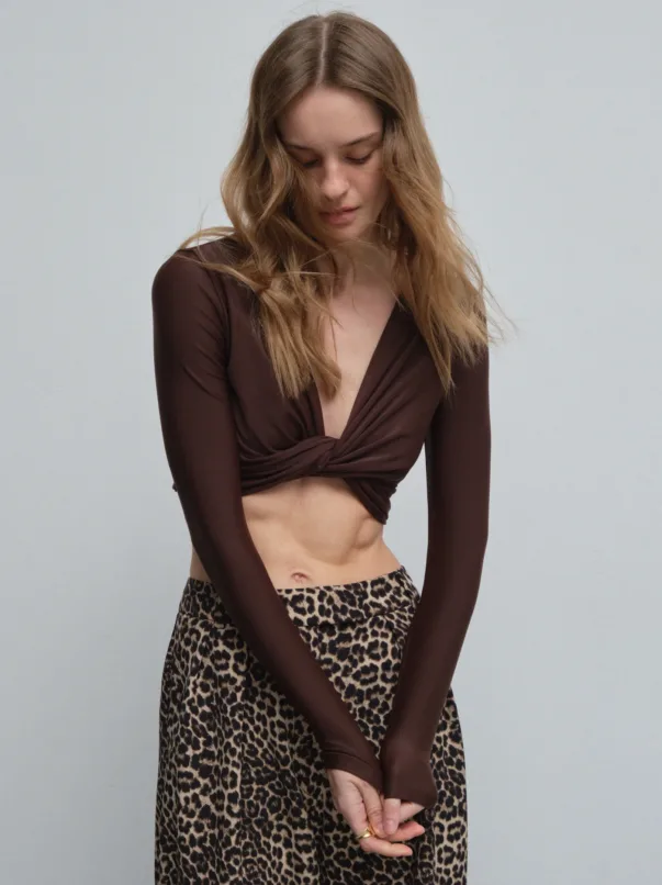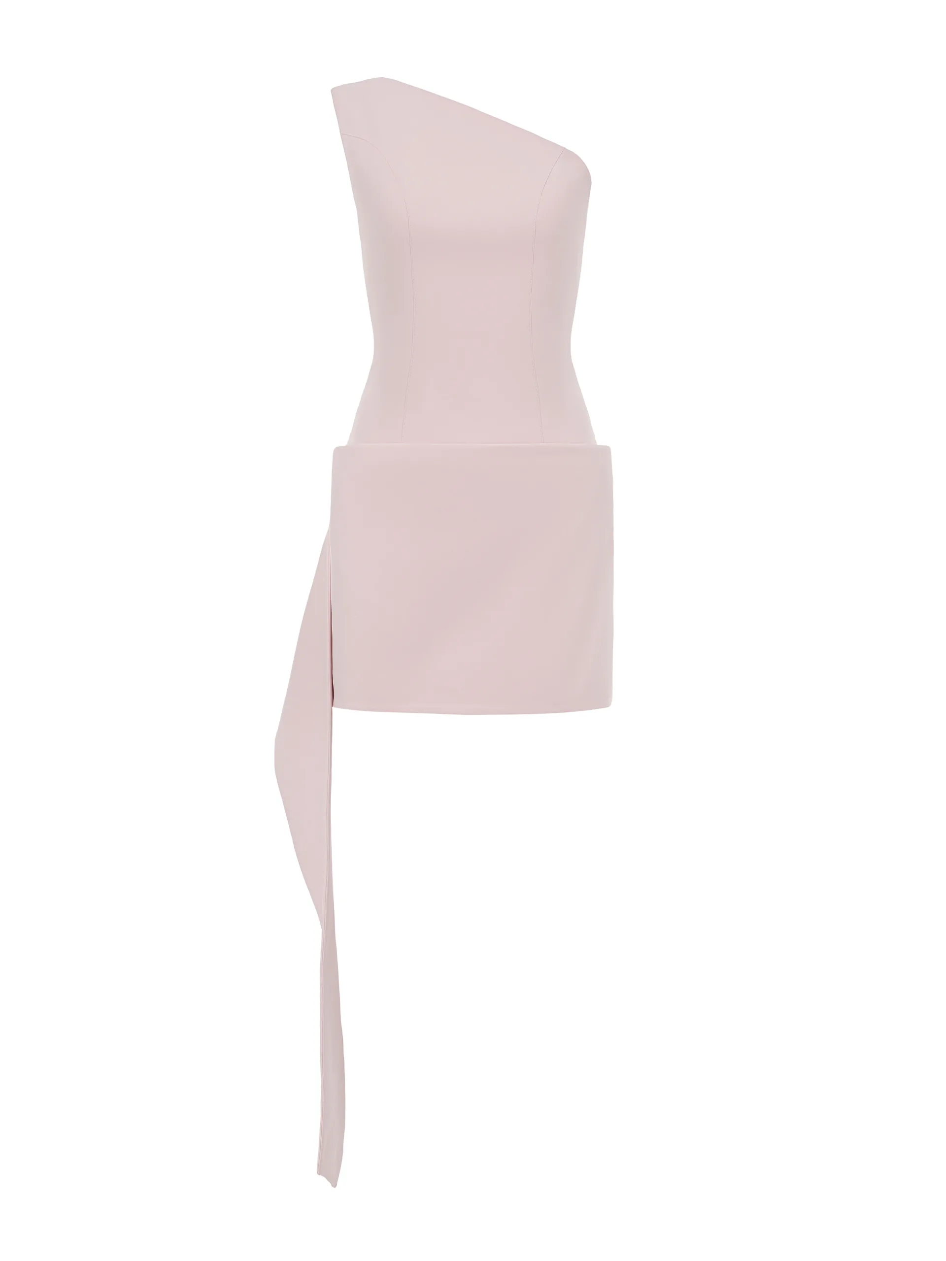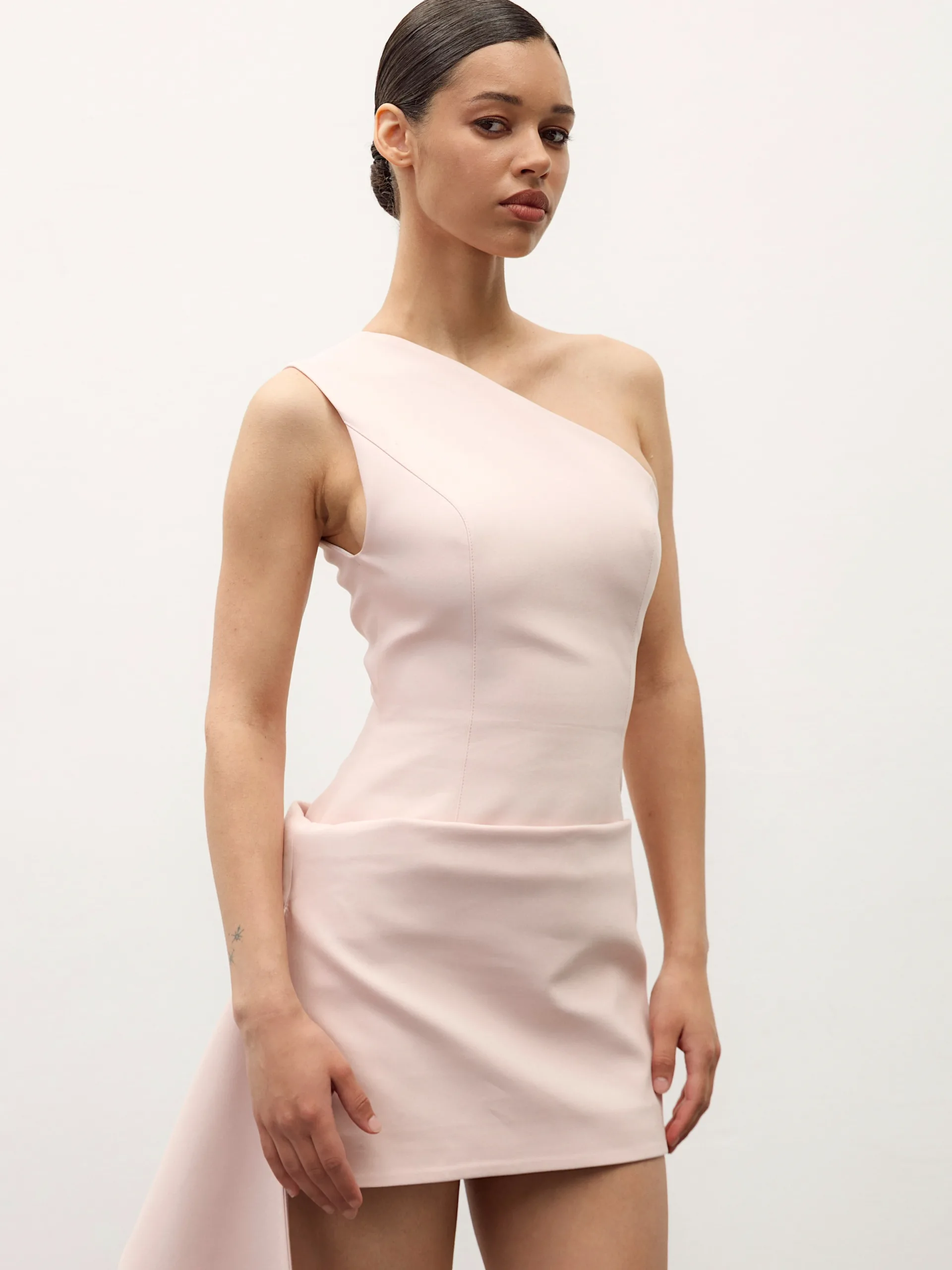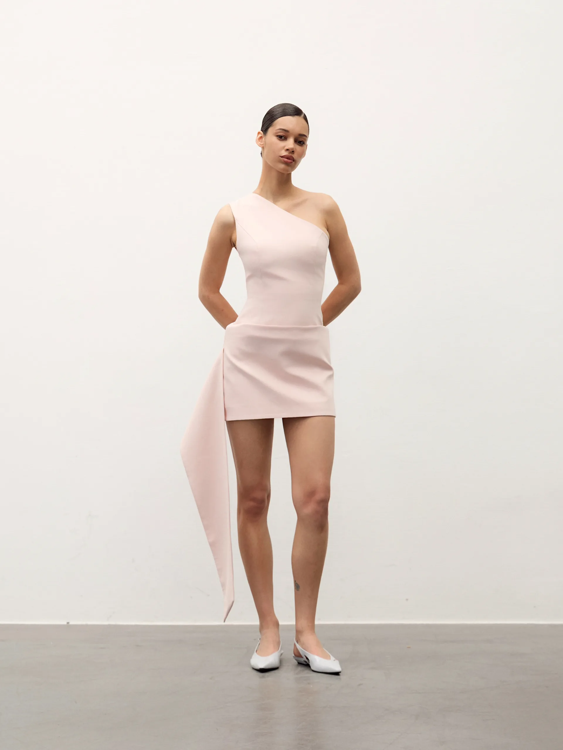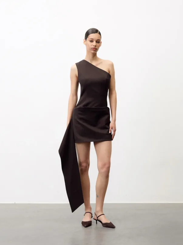 This asymmetrical dress is crafted from a dense suit fabric that maintains its shape while remaining comfortable even in warm weather. It is available in two colors: deep chocolate and pale pink. The design features an open shoulder and a built-in train that adds movement, while the miniskirt effect accentuates the hips and highlights the figure. It’s perfect for evenings when you want to look effortlessly stylish.