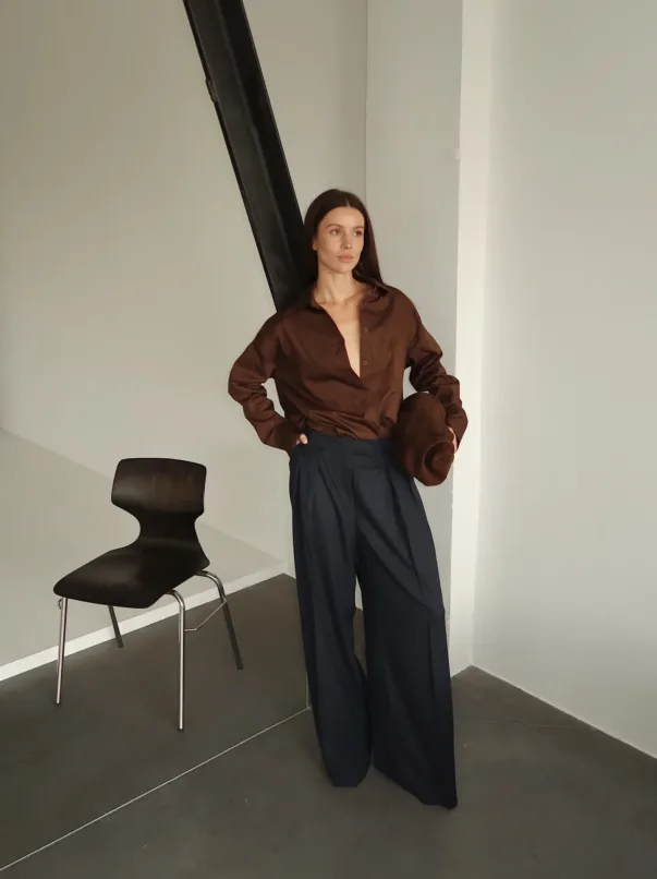 Translucent tencel blouse with an exquisite natural sheen. This lightweight, soft fabric drapes beautifully, highlighting your every movement. Available in three sophisticated shades: grey, black, and purple.