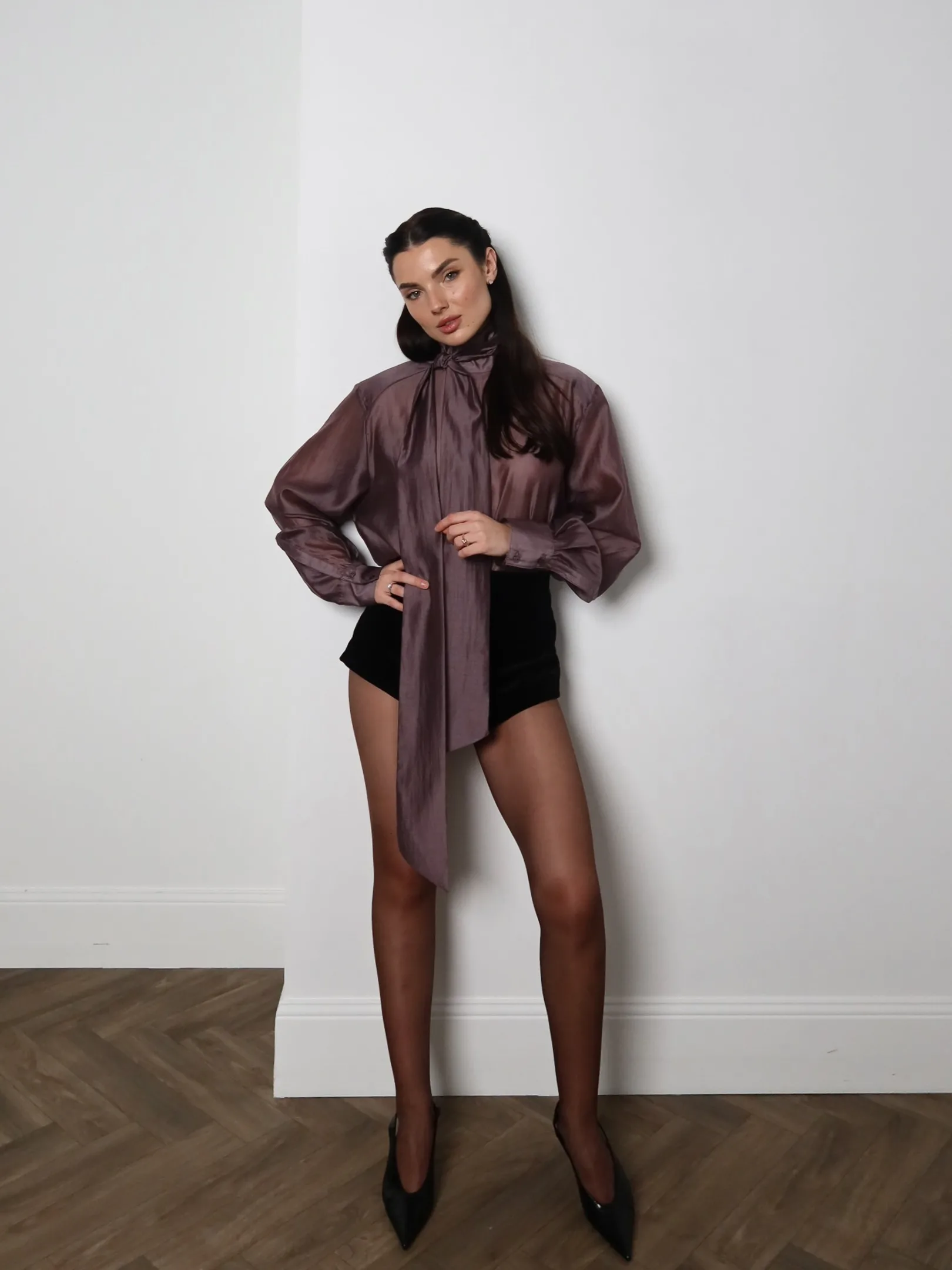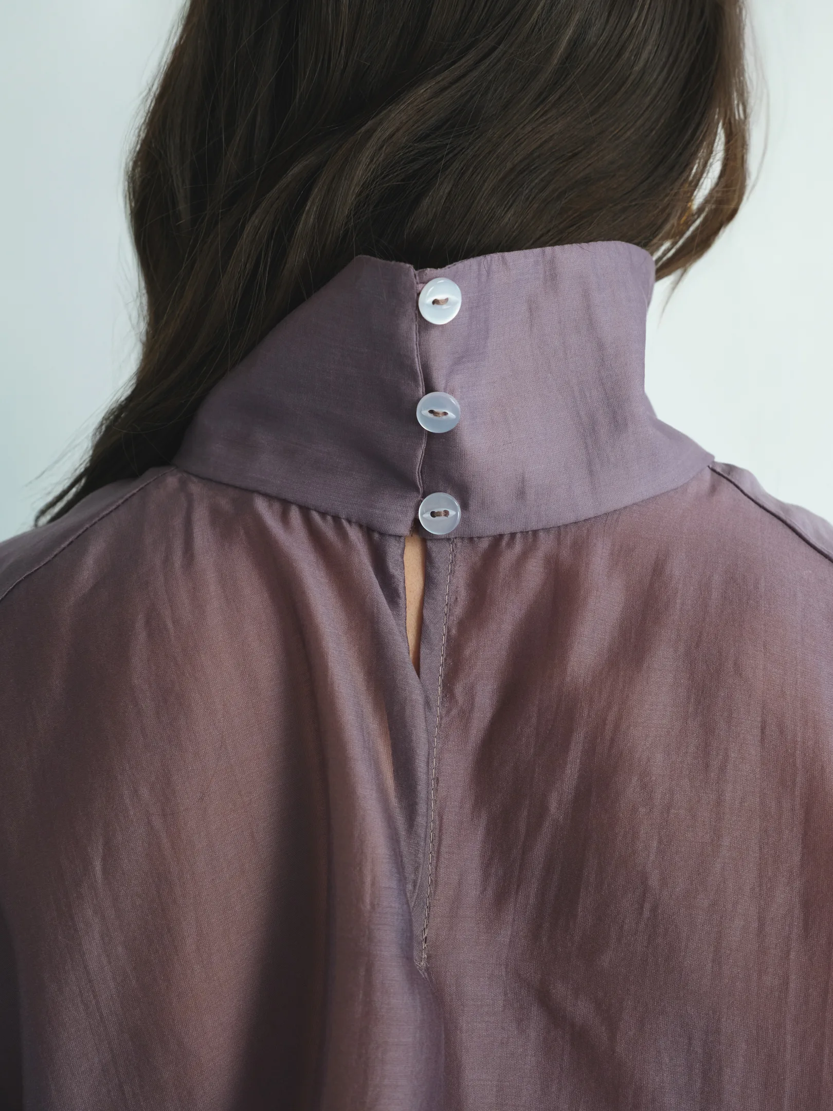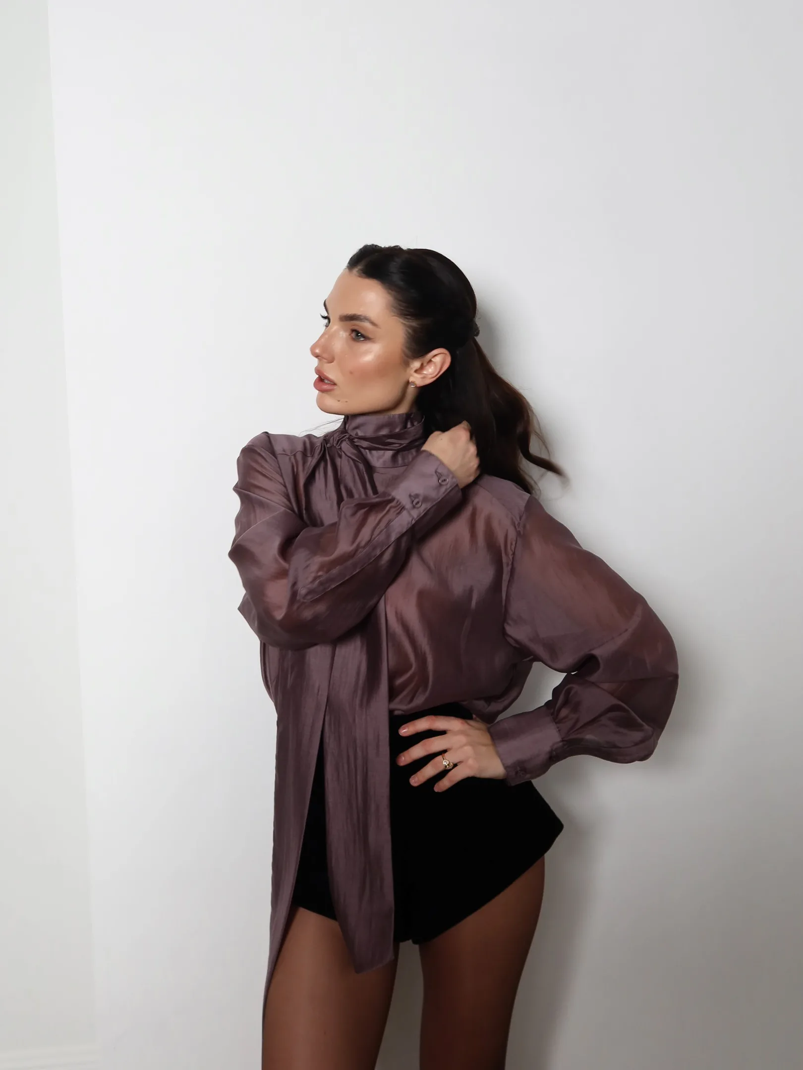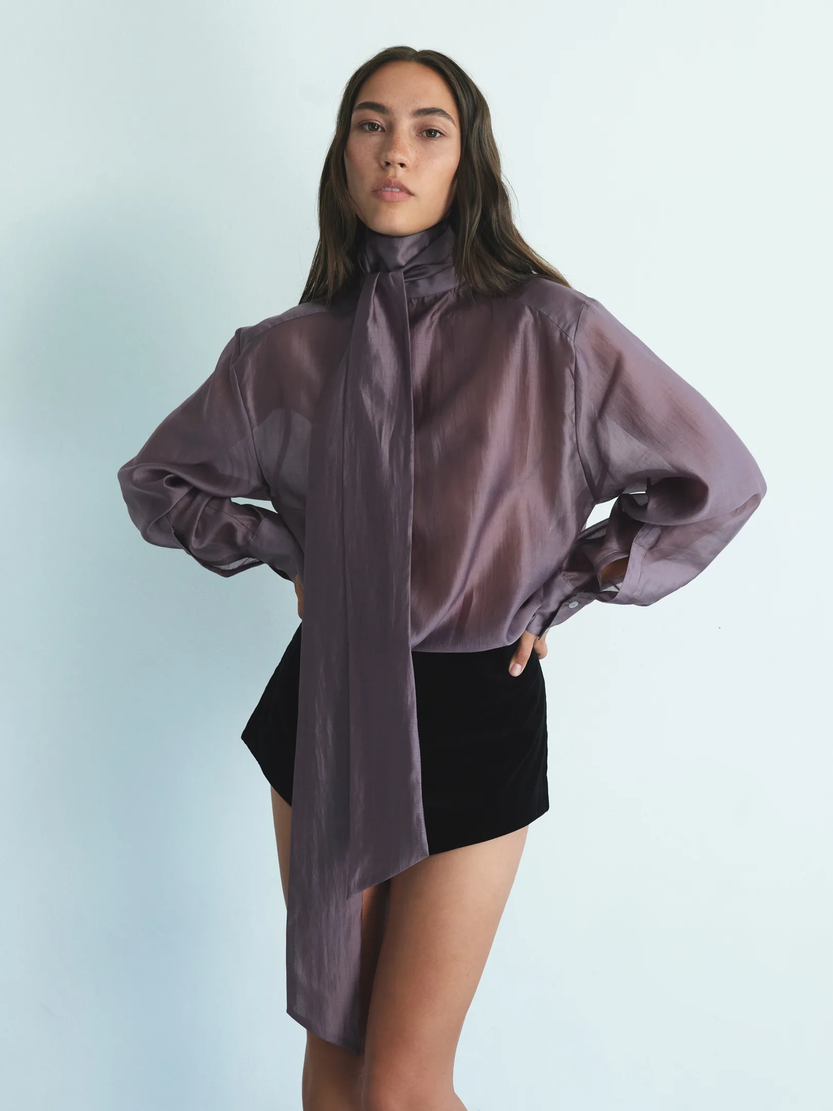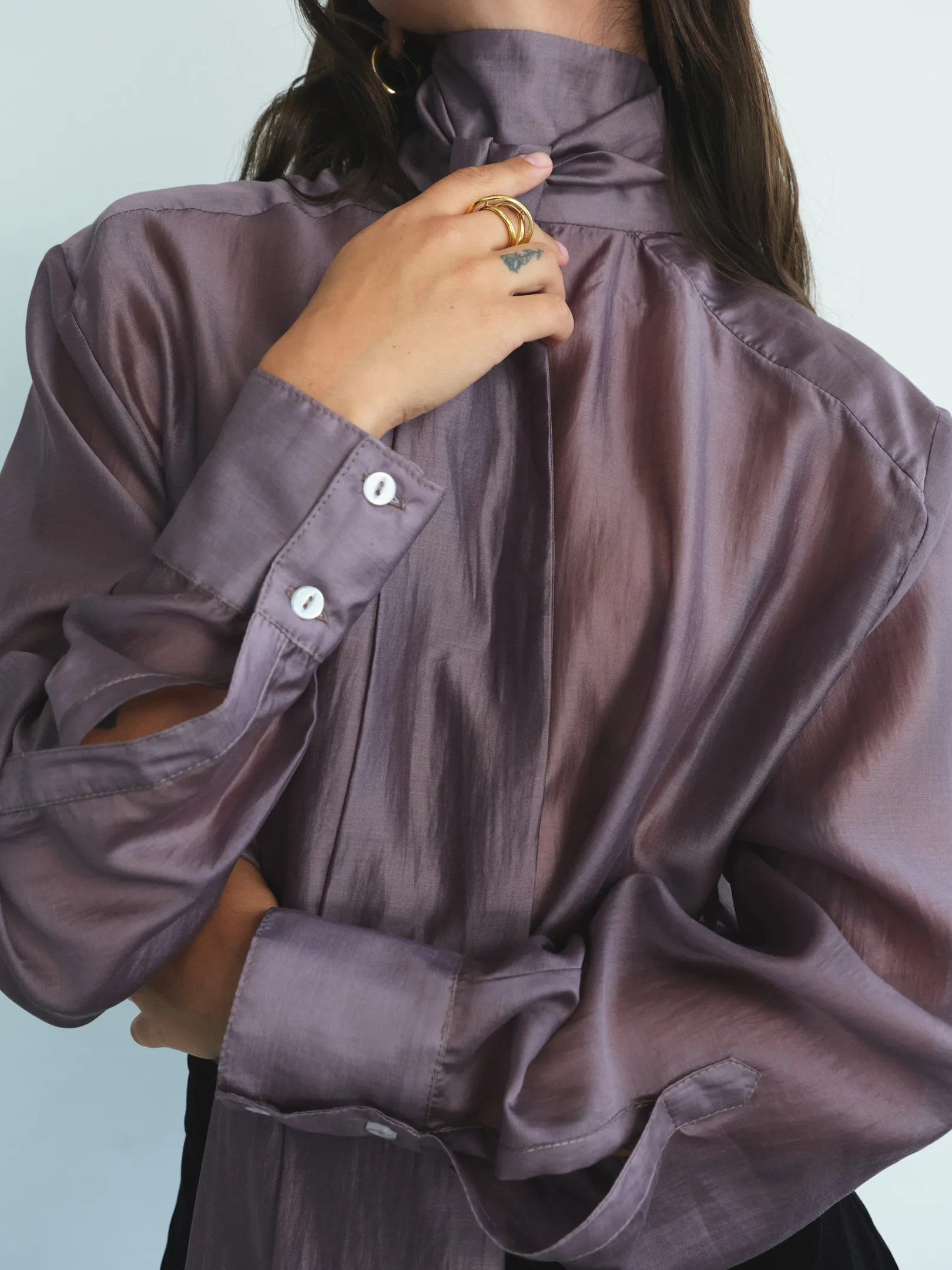 Translucent tencel blouse with an exquisite natural sheen. This lightweight, soft fabric drapes beautifully, highlighting your every movement. Available in three sophisticated shades: grey, black, and purple.