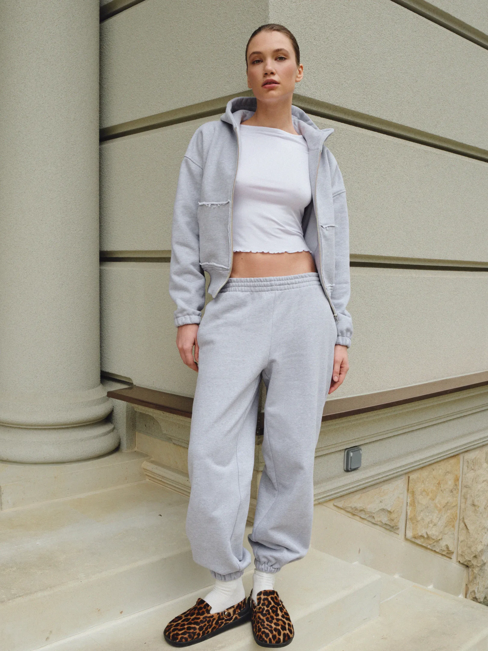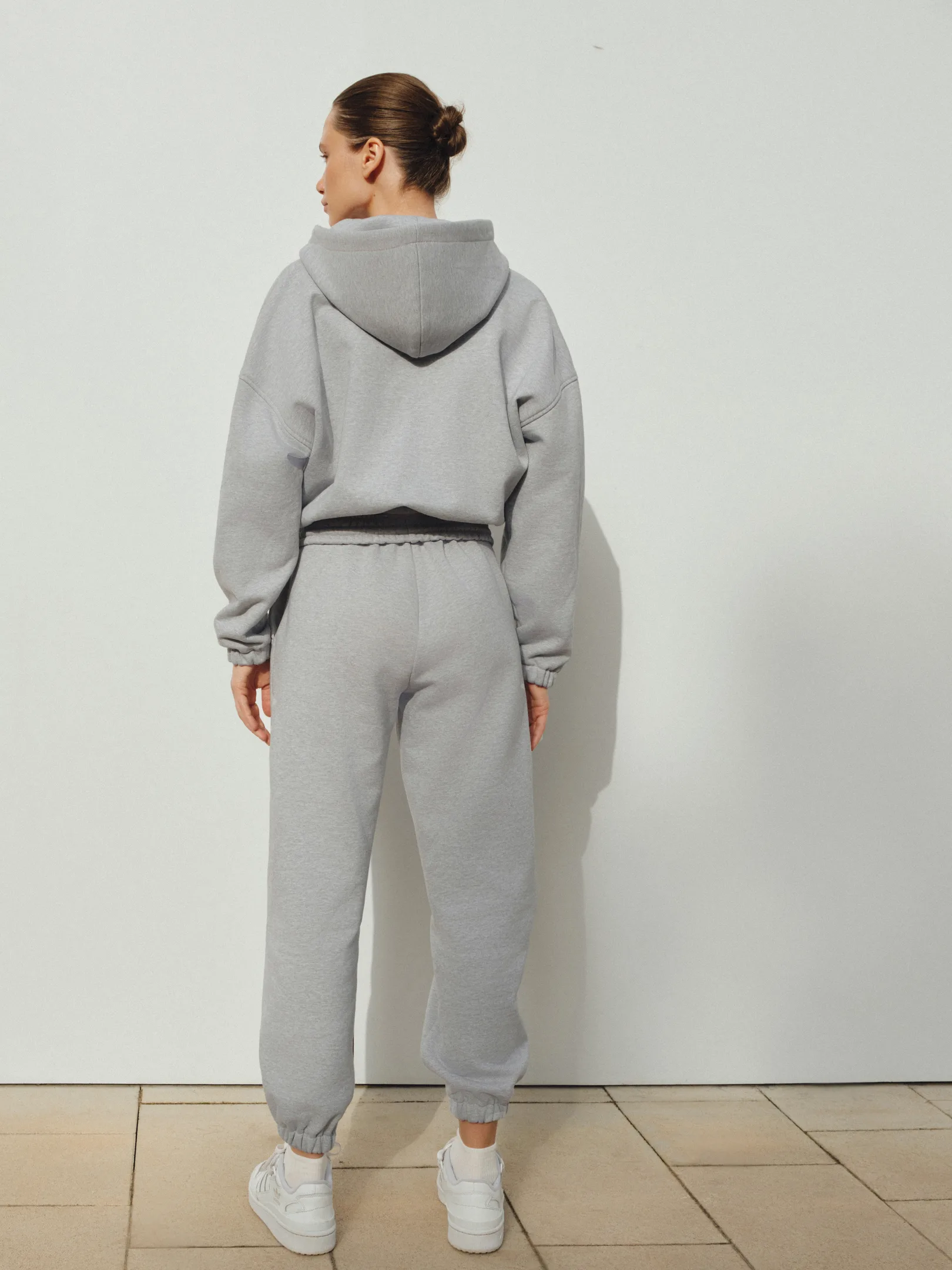 We have designed the perfect tracksuit that comprises joggers and a zip hoodie. Our fabric is made of dense 100% cotton, which we have been searching for a long time. It is specially created for our drop and is a real rarity, especially for melange shades. Often, melange shades are made from secondary raw materials, but our fabric not only has a stylish gray melange color but also does not roll down. This provides durability while maintaining the original look for many washes.