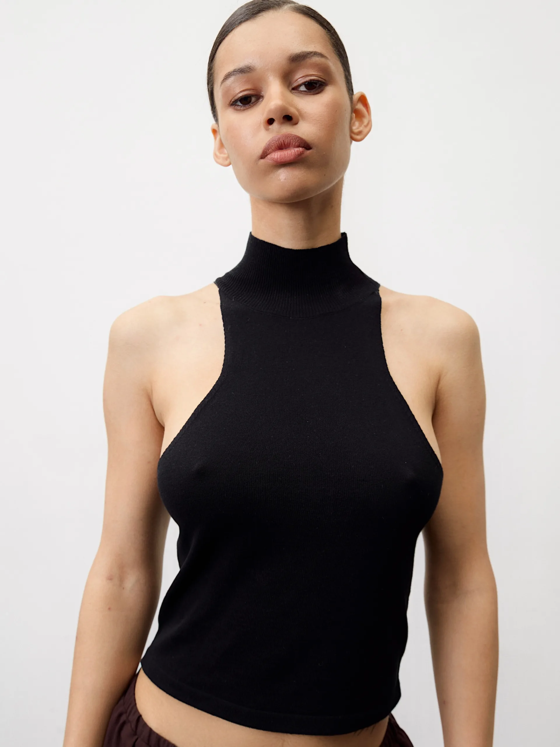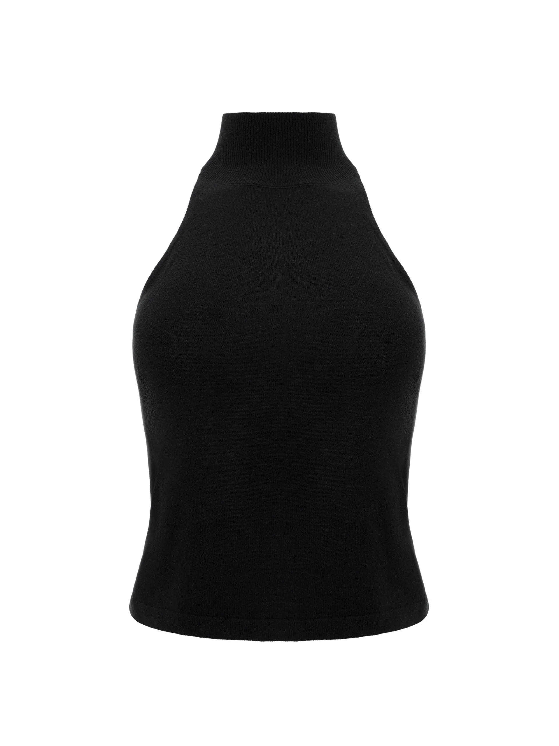 This knitted top is crafted from premium Italian viscose, offering breathability, stretch, and a fit that hugs the body like a second skin. It comes in two colors: deep black and soft pink. The design features open shoulders and a high neckline, striking a balance between elegance and sensuality. It beautifully accentuates the neck, collarbone, and arms, making it a versatile staple for summer outfits. Whether paired with denim, leather, or worn as a standalone statement piece, it serves as a perfect addition to any wardrobe.