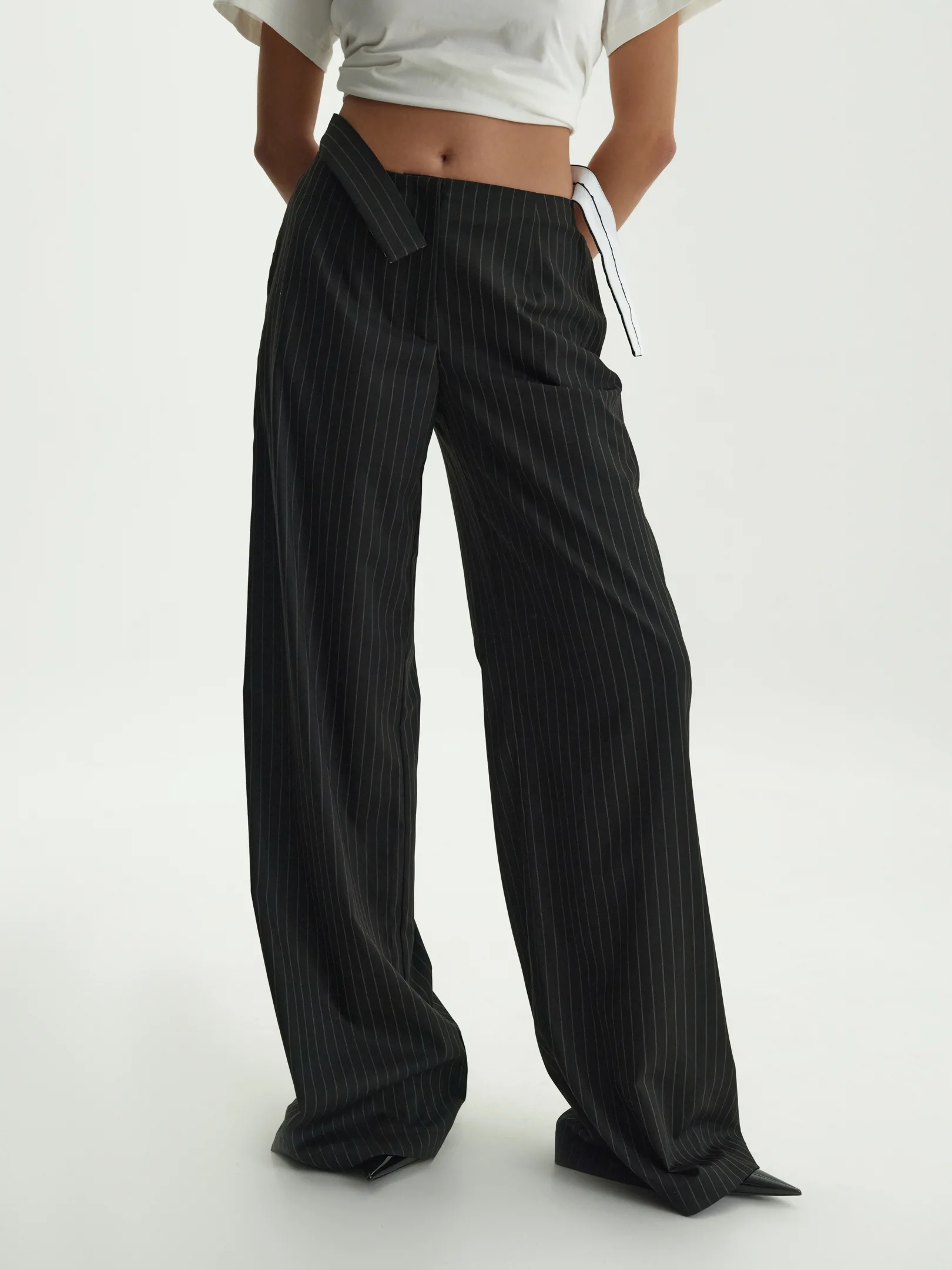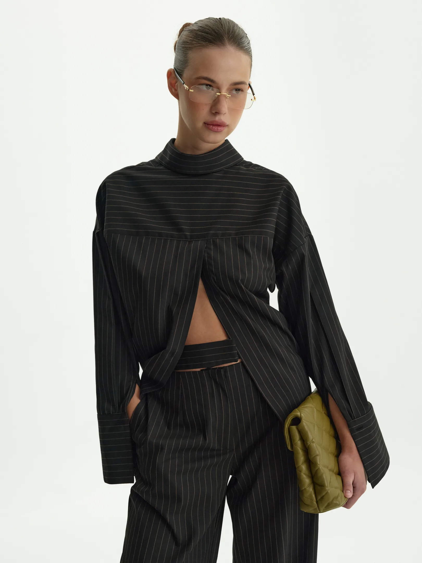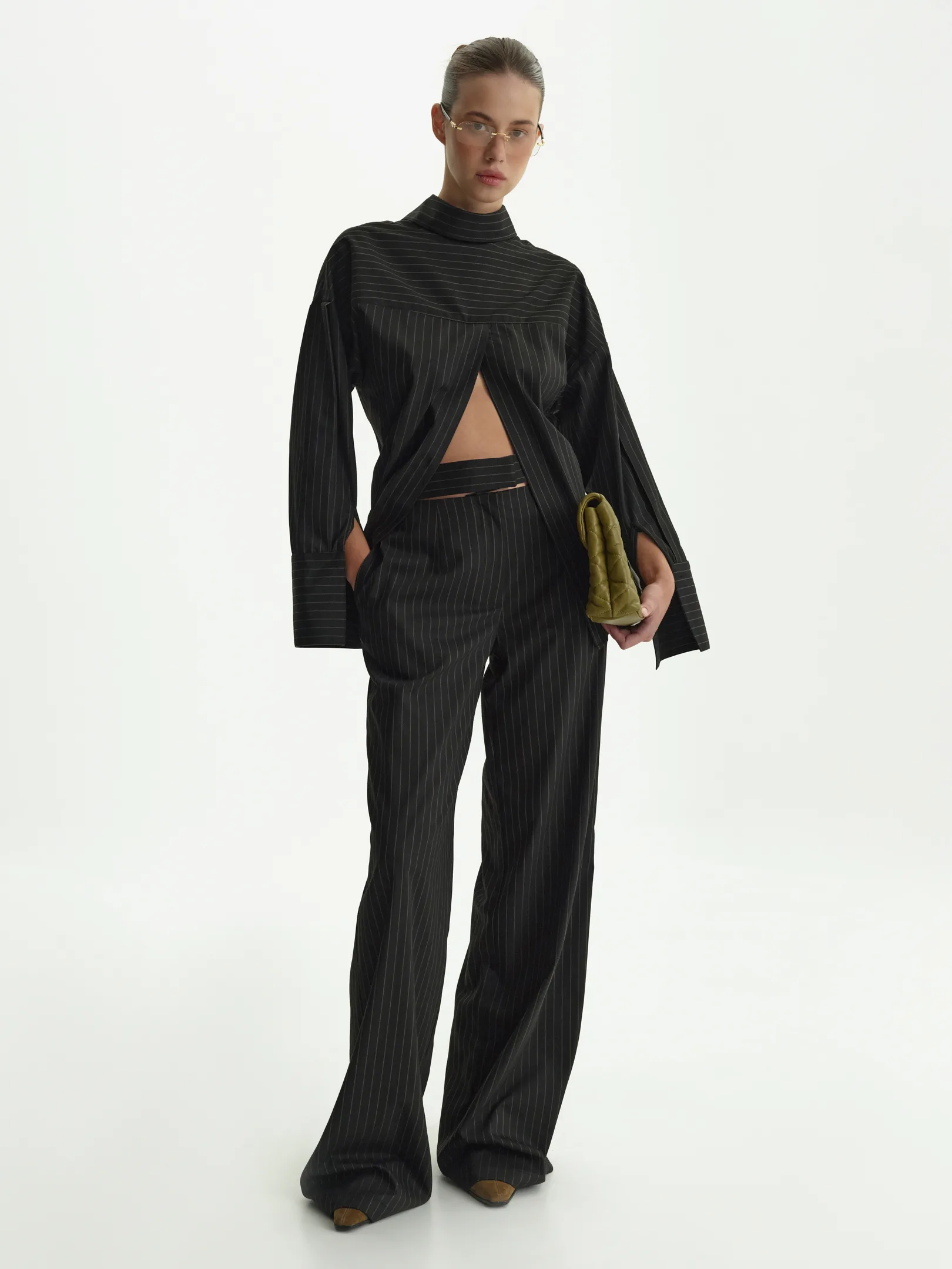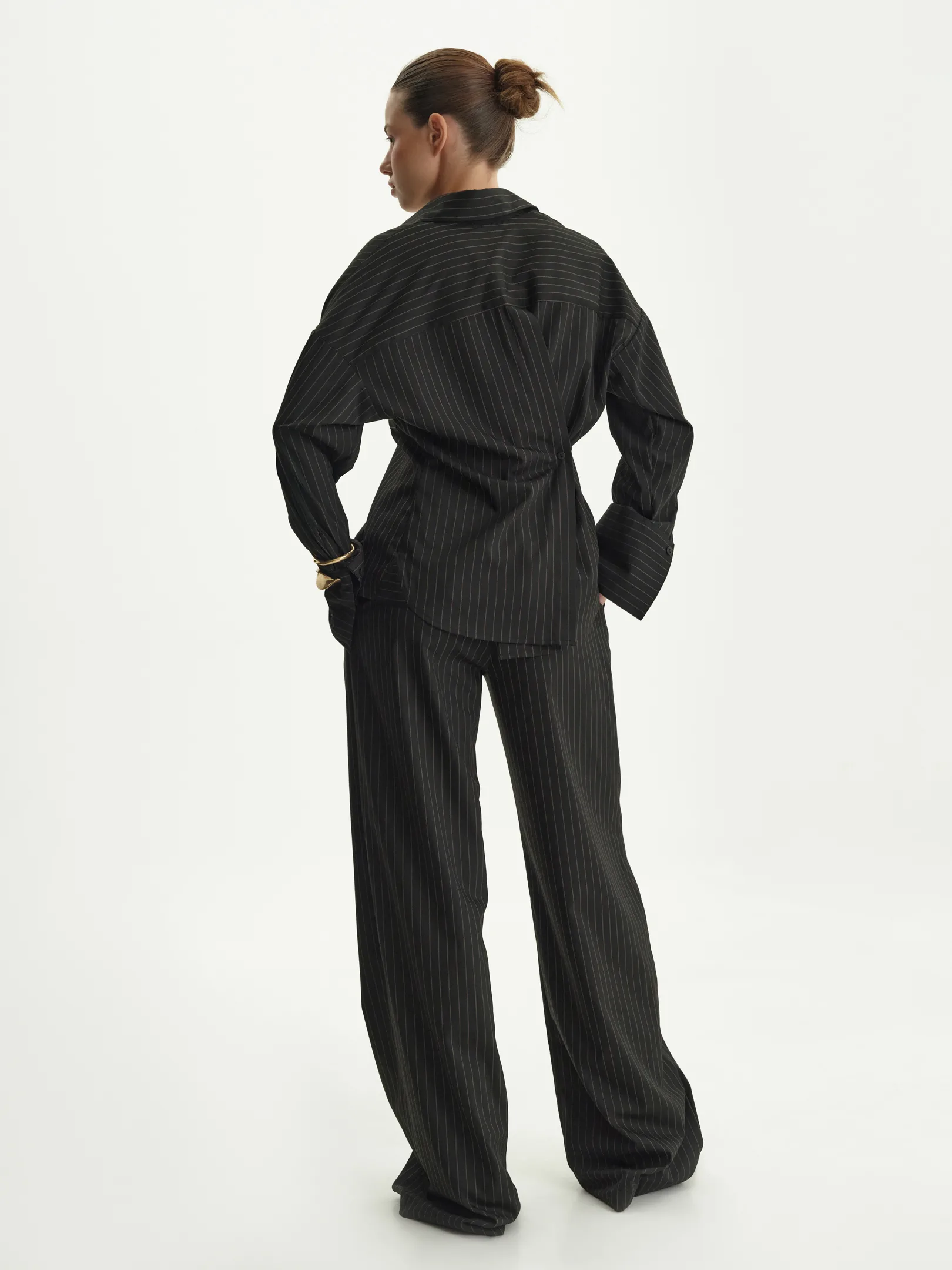 This suit features a loose fit with a subtle striped pattern that easily adapts to various styles. The lightweight silhouette is enhanced by thoughtful details: an asymmetrical cut adds a touch of expressiveness, a belt allows for adjustable fitting, and wide cuffs provide a defined structure.