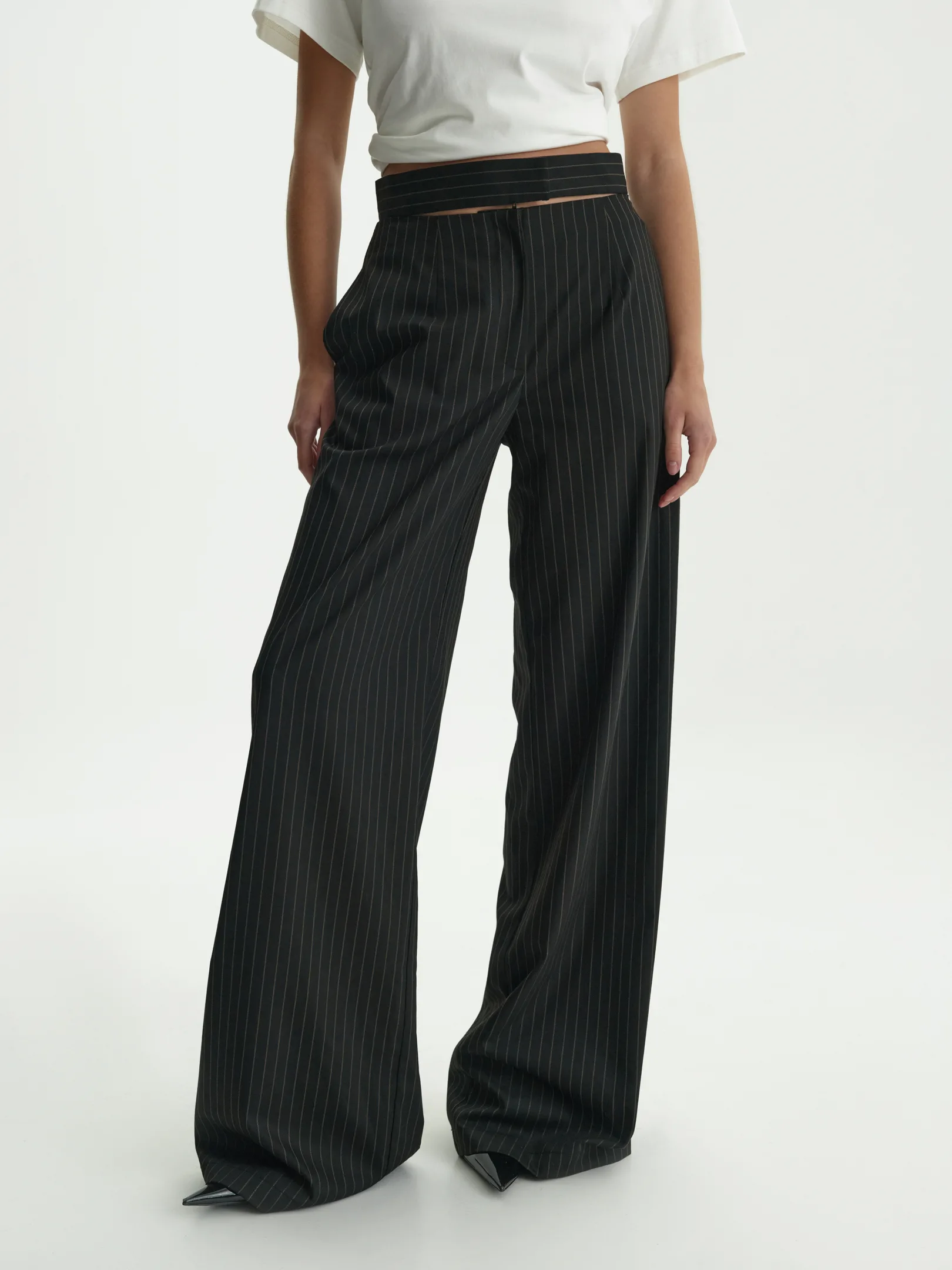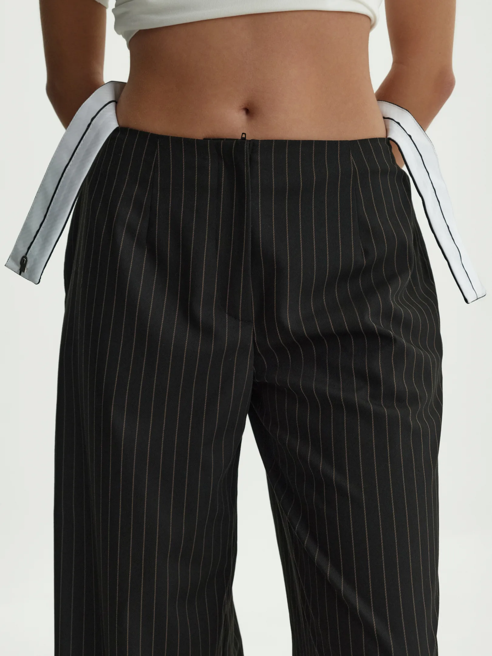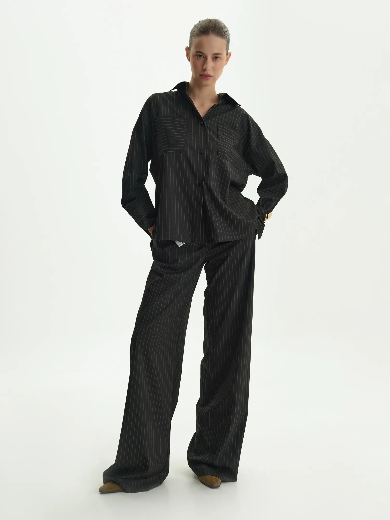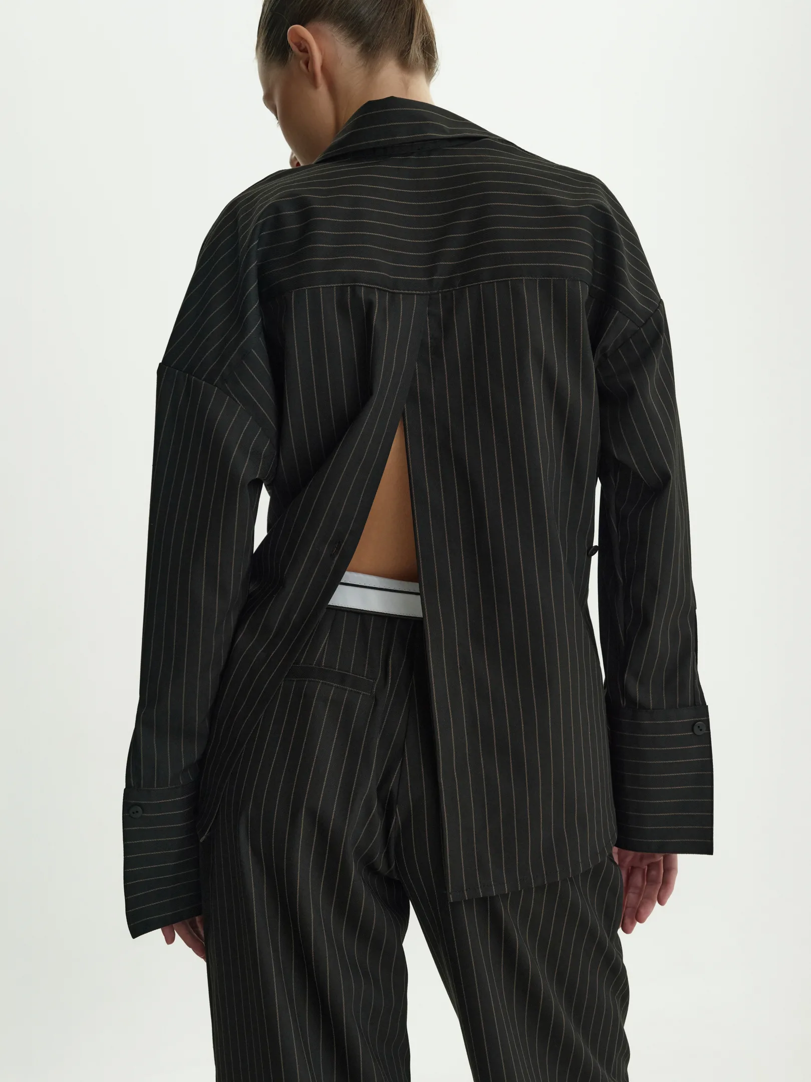 This suit features a loose fit with a subtle striped pattern that easily adapts to various styles. The lightweight silhouette is enhanced by thoughtful details: an asymmetrical cut adds a touch of expressiveness, a belt allows for adjustable fitting, and wide cuffs provide a defined structure.