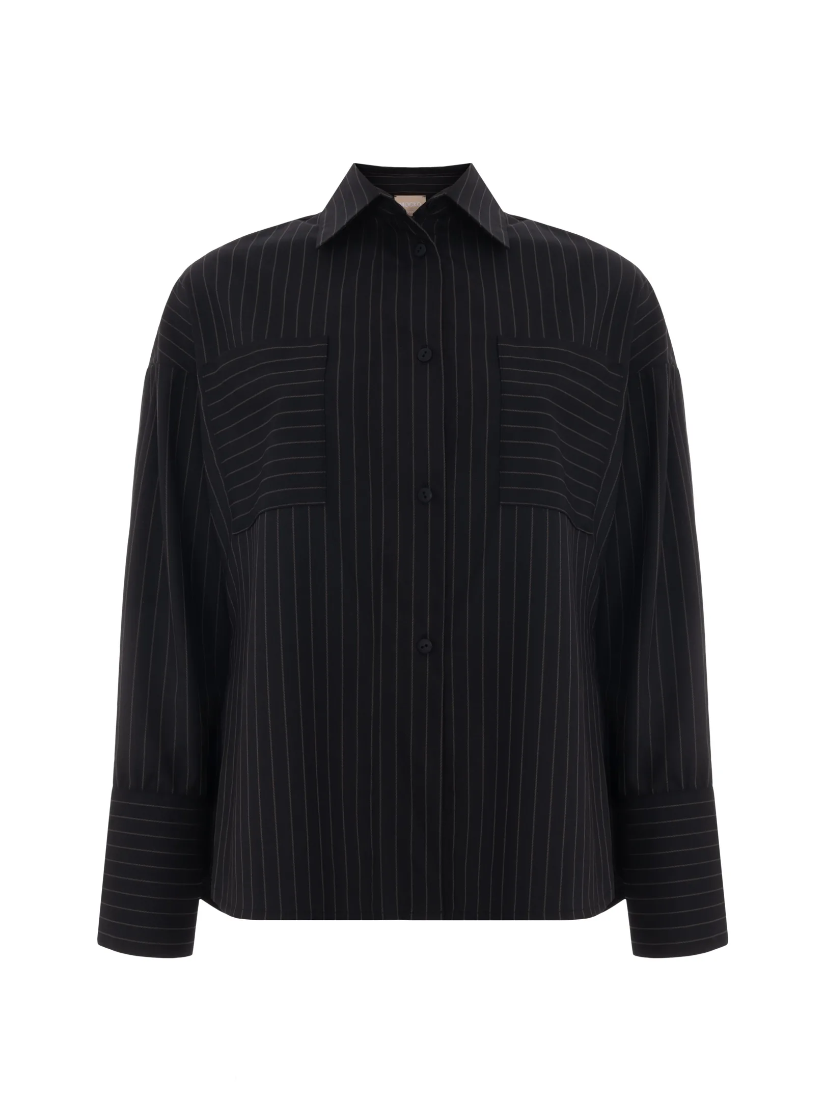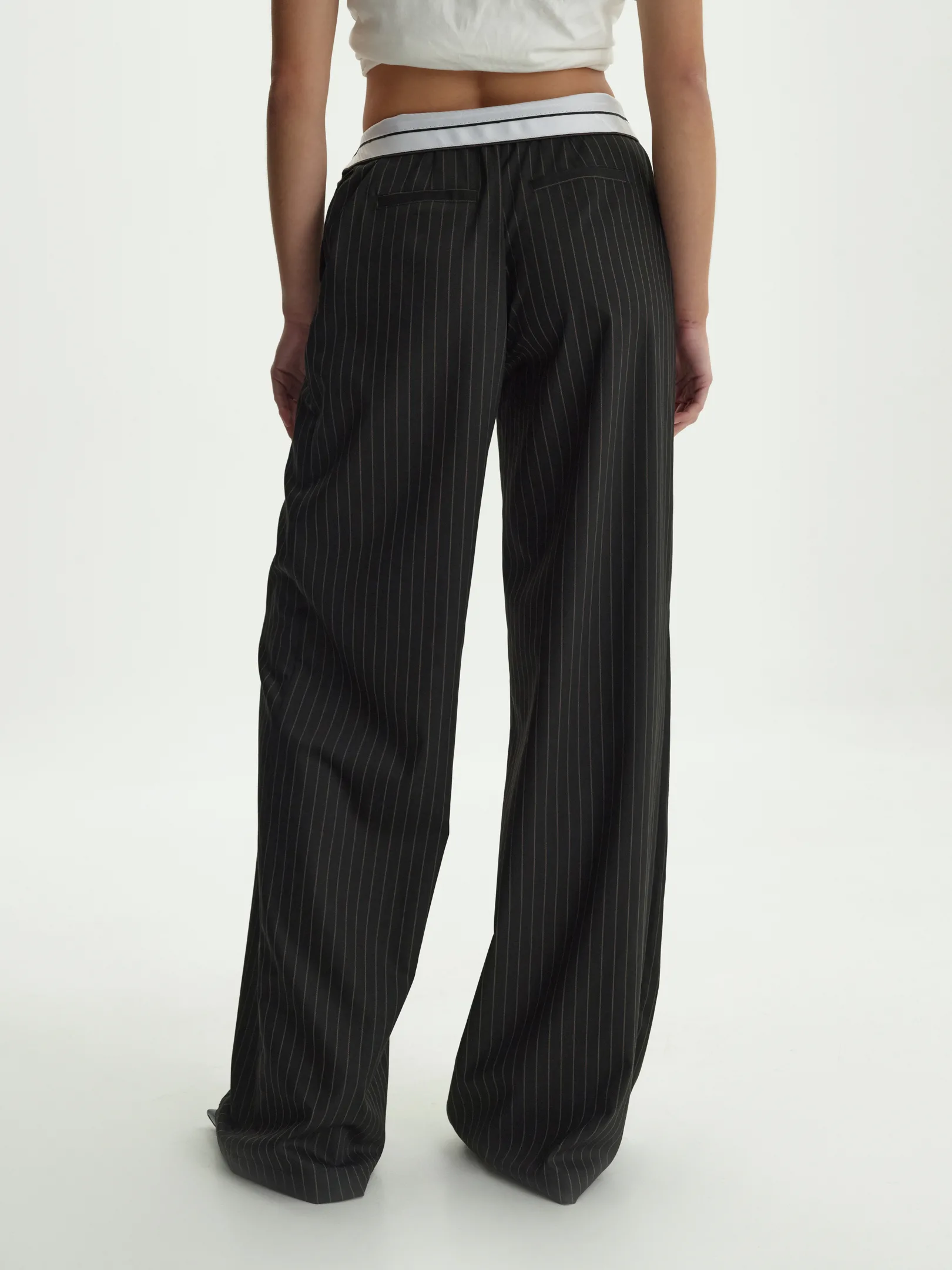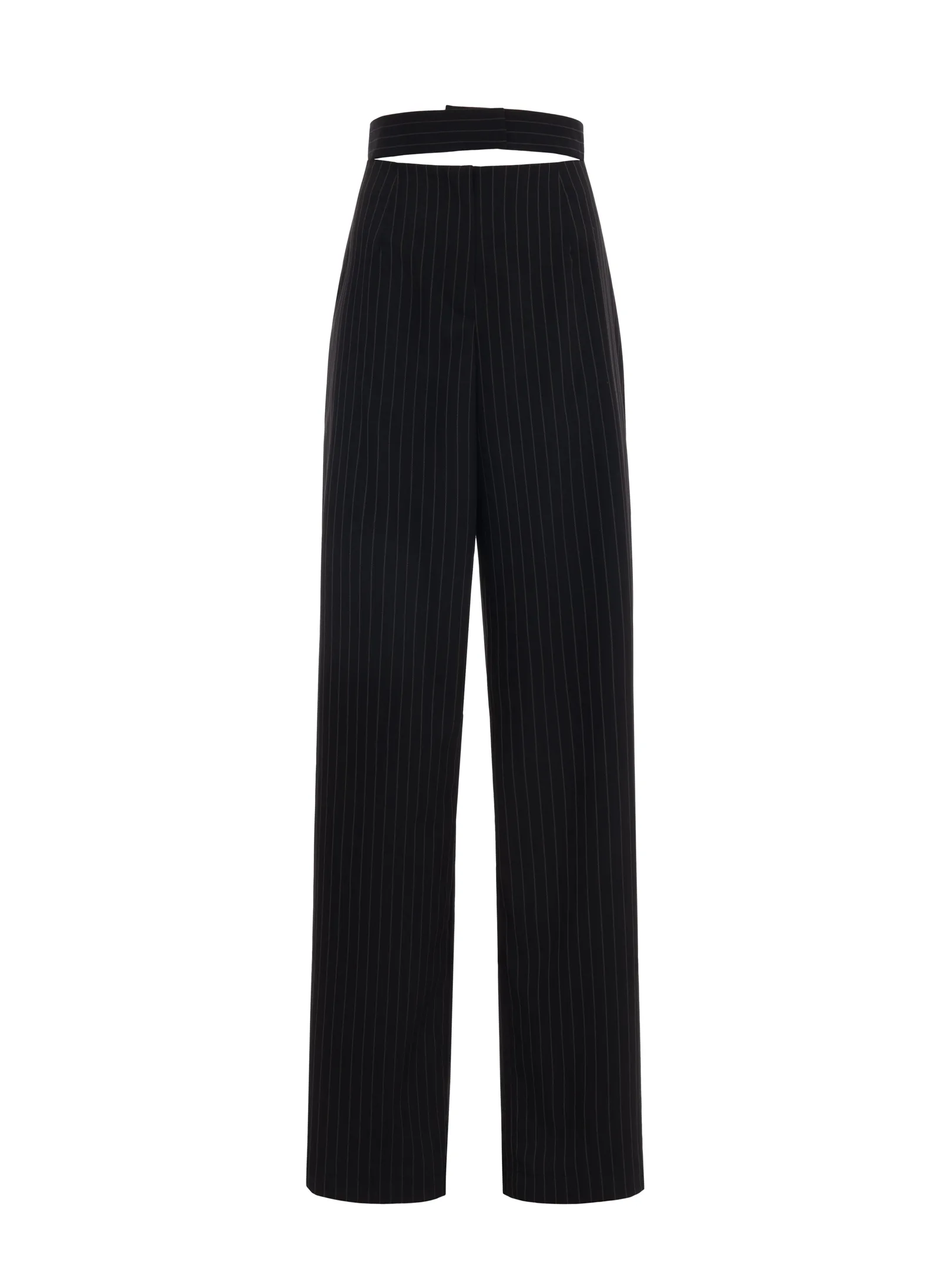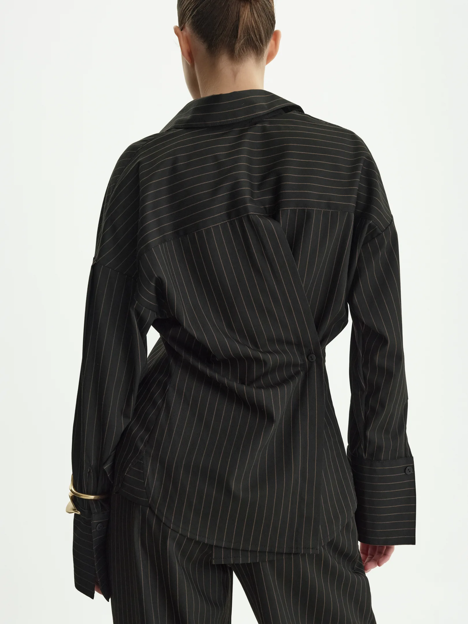This suit features a loose fit with a subtle striped pattern that easily adapts to various styles. The lightweight silhouette is enhanced by thoughtful details: an asymmetrical cut adds a touch of expressiveness, a belt allows for adjustable fitting, and wide cuffs provide a defined structure.