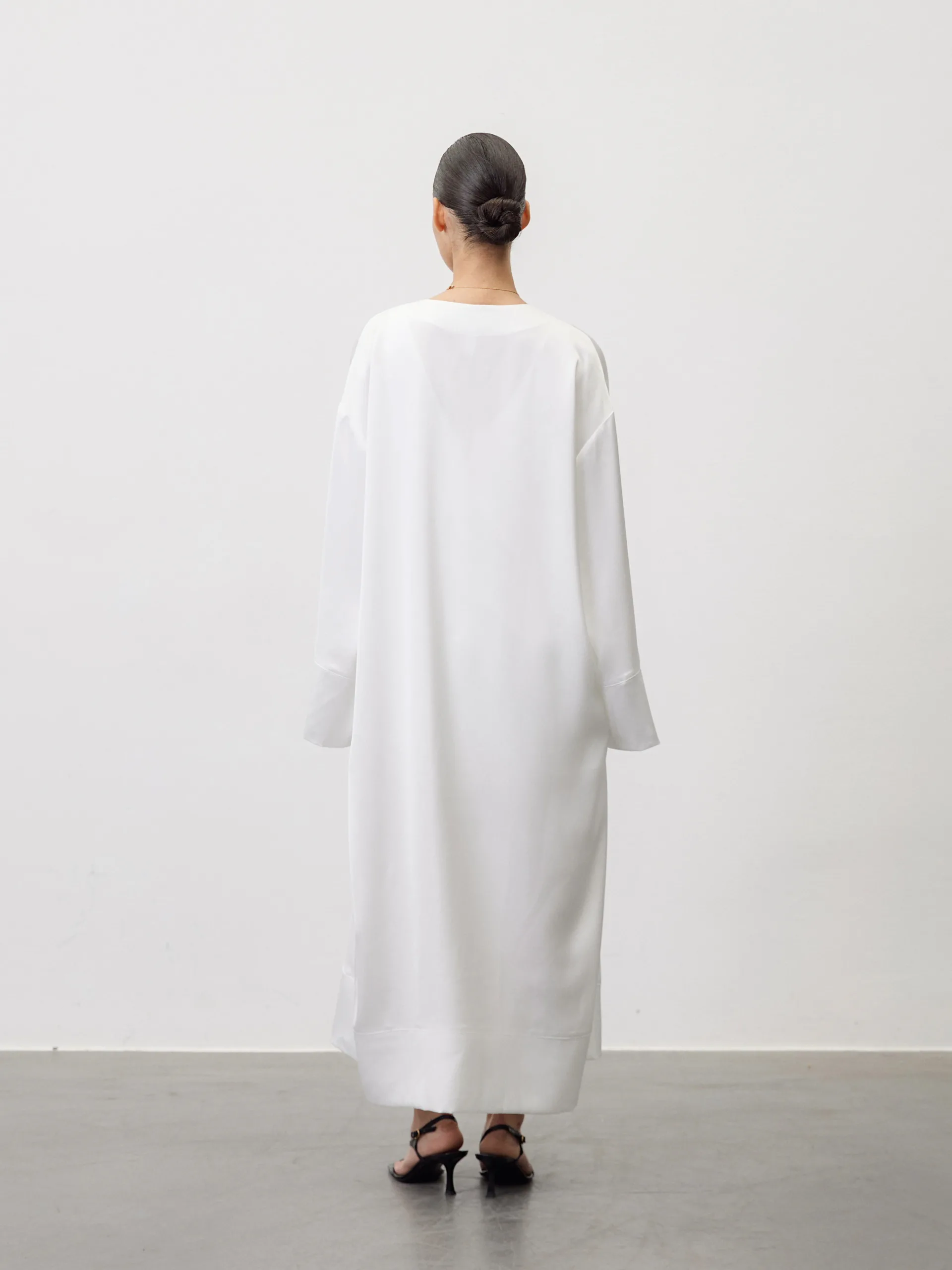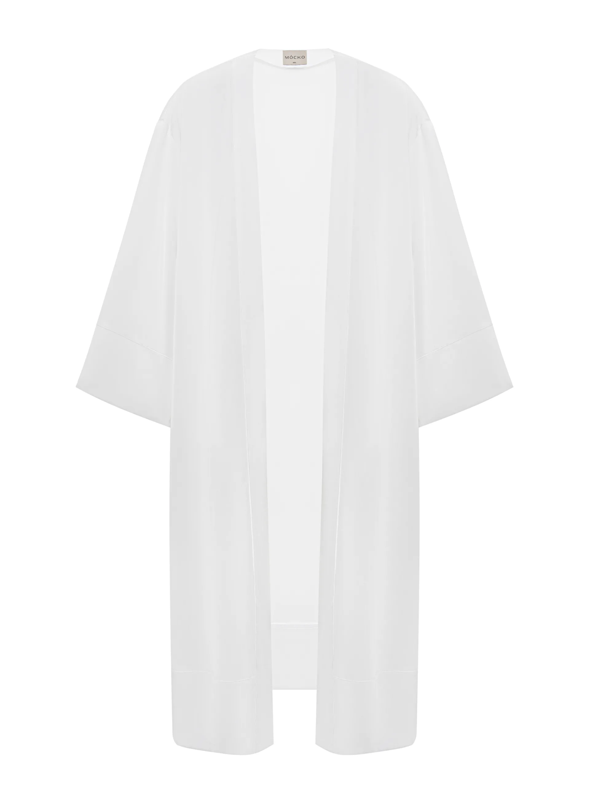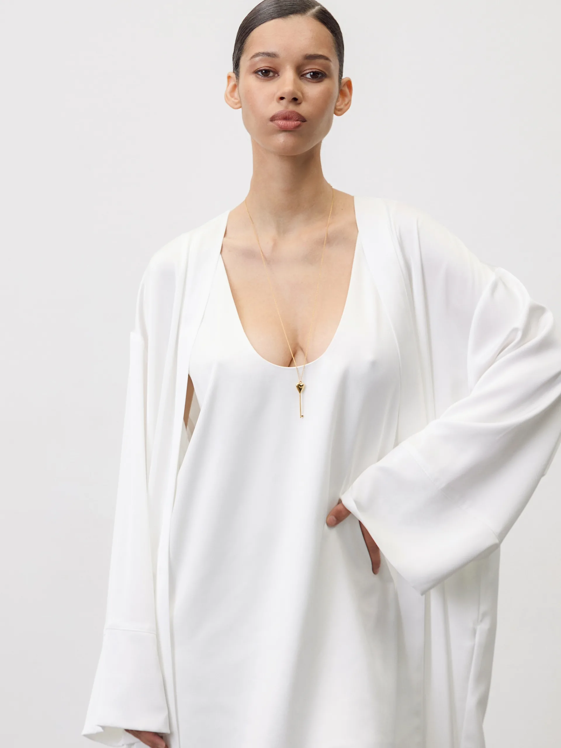 A light satin kimono in a creamy shade embodies the quietude of a summer day. Its loose fit, wide sleeves, and soft fabric create a gentle movement. There is nothing excessive—just a feeling of openness and tranquility. It is designed to be worn in the morning, allowing you to focus on nothing else.