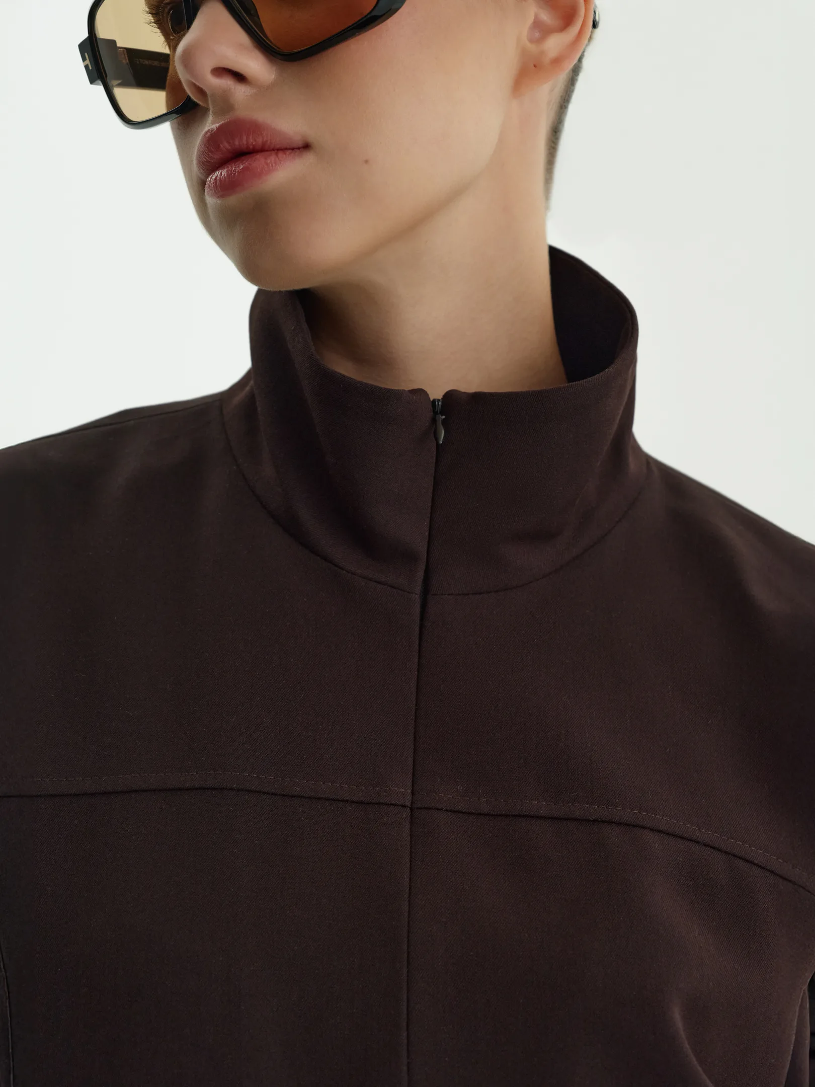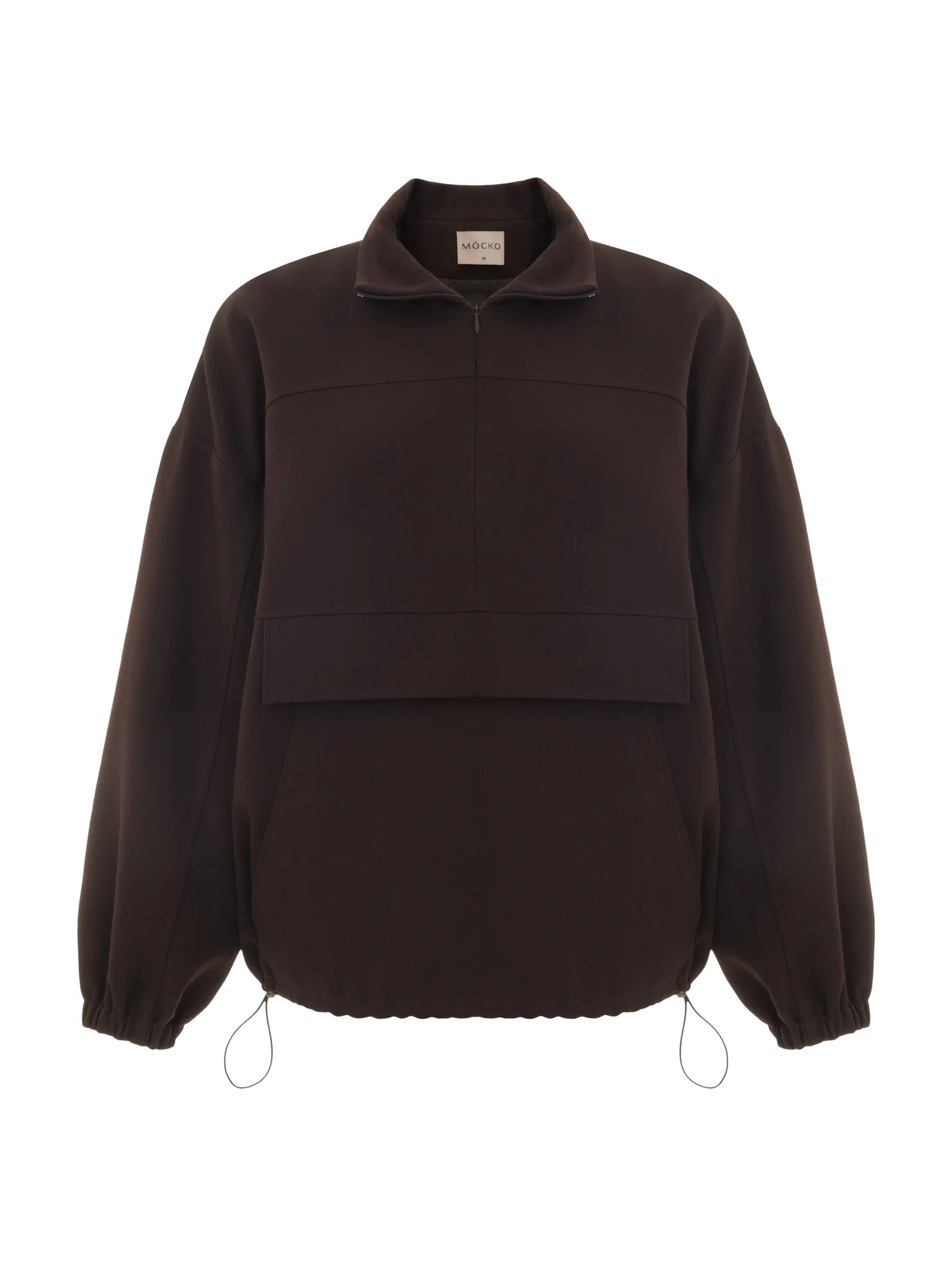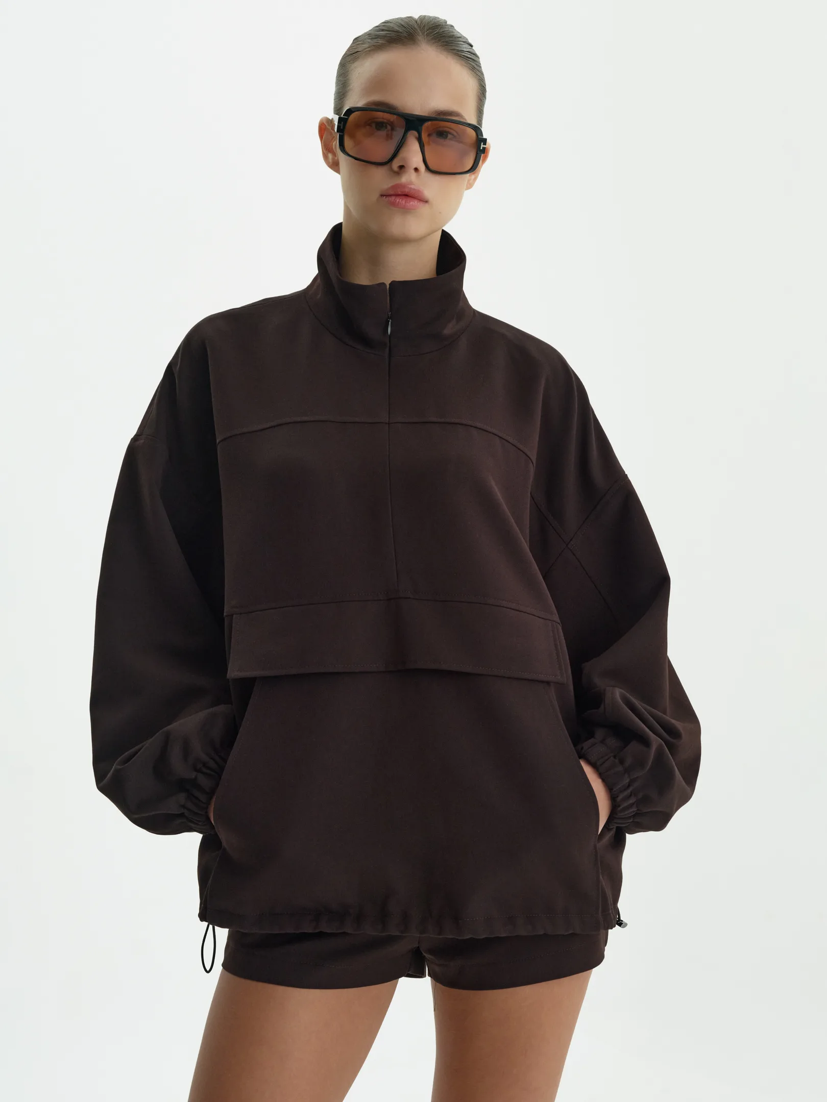 Ця модель у глибокому шоколадному кольорі виглядає лаконічно, але одразу привертає увагу. Вільний крій дає свободу рухів, еластичні манжети забезпечують комфортну посадку. Спереду – містка кишеня, що додає практичності, а внизу – регульована затяжка, завдяки якій можна змінювати силует: залишати його об’ємним або робити більш зібраним.