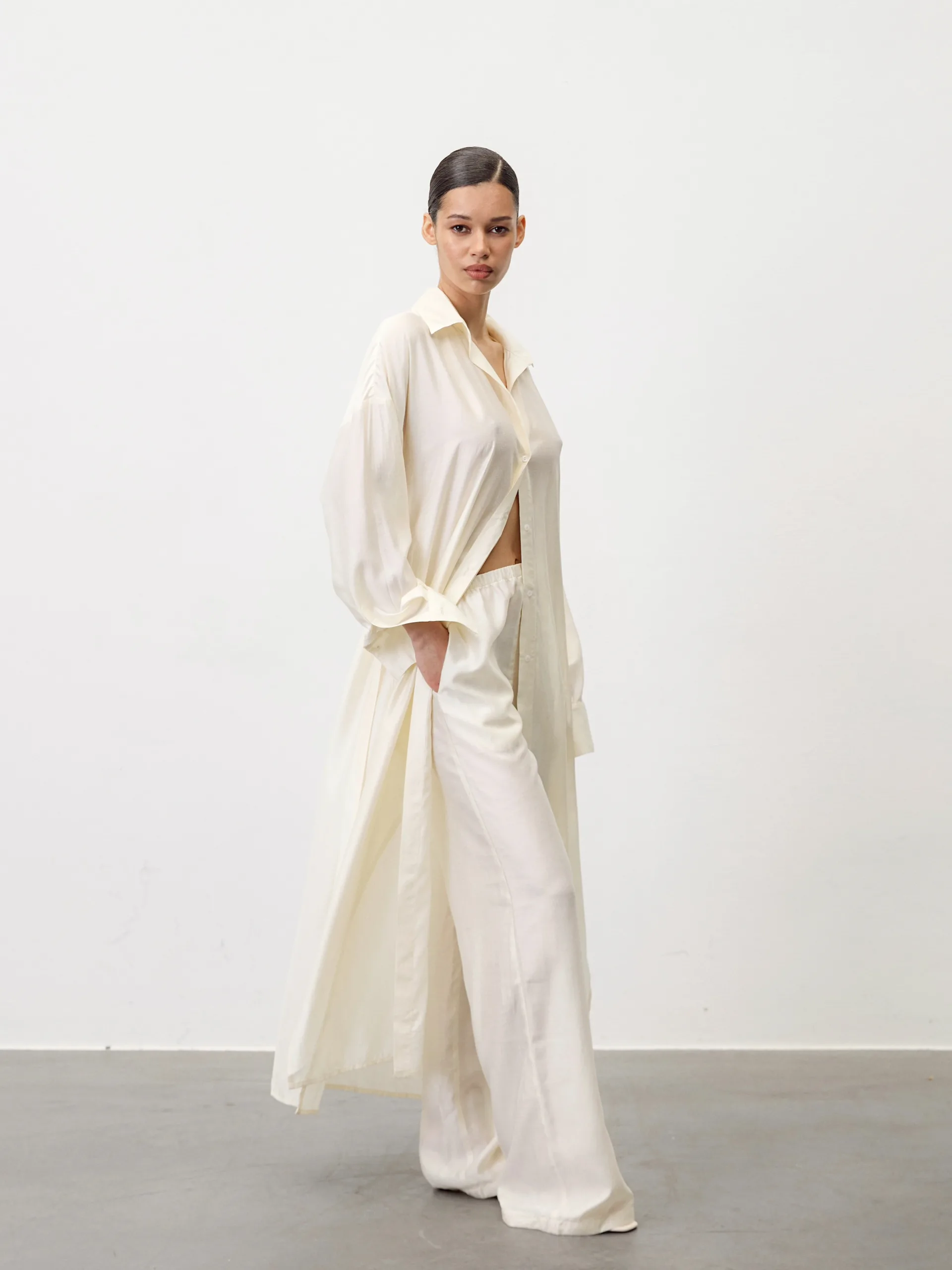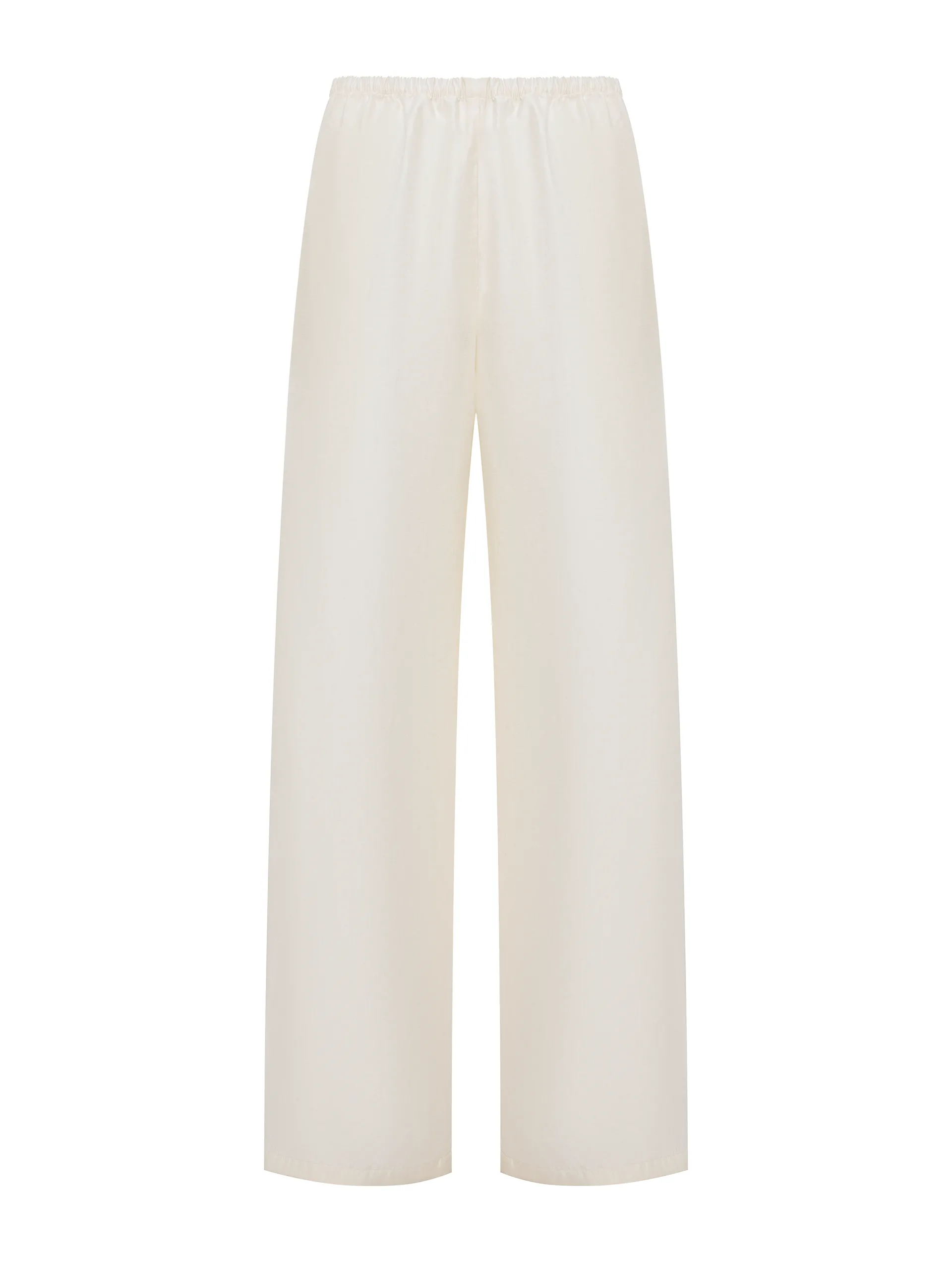 Штани з віскози та льону у ідеальному вершково-лимонному відтінку — легкі, м’які, приємні до тіла. Летюча тканина красиво рухається під час ходи. Вільний крій та еластичний пояс забезпечують комфорт і свободу рухів, а широка штанина красиво лягає в русі. Можна носити як самостійну річ, або вдягати як повноцінний комплект з сорочкою. Ідеально підходить як для пляжних образів поверх купальника, так і для спекотних днів у місті, коли хочеться чогось легкого, але виразного.