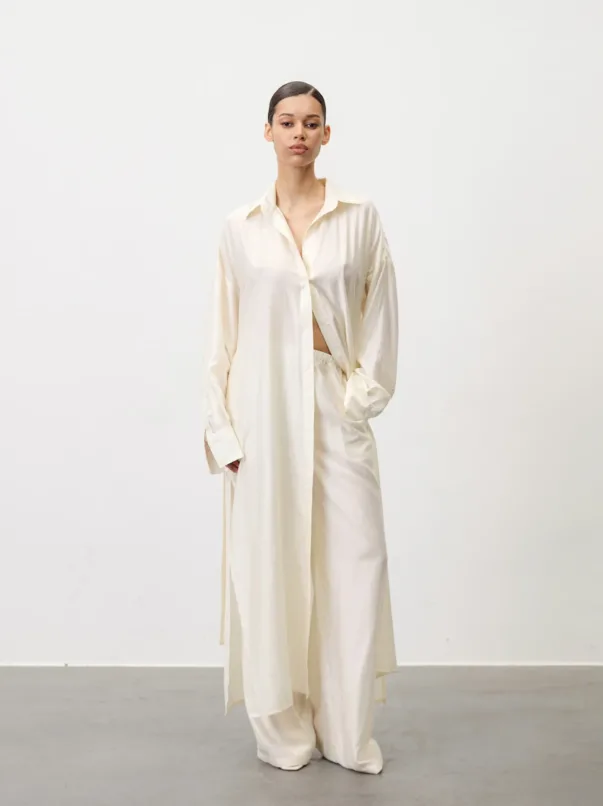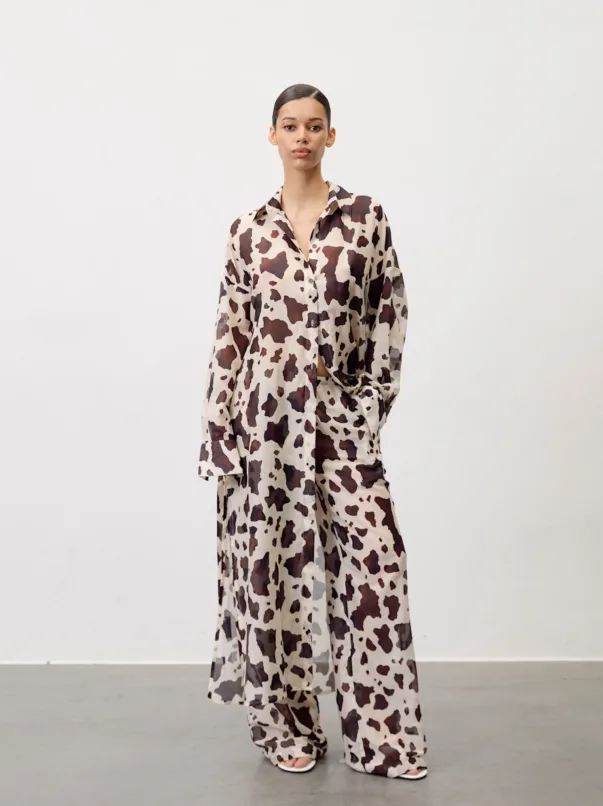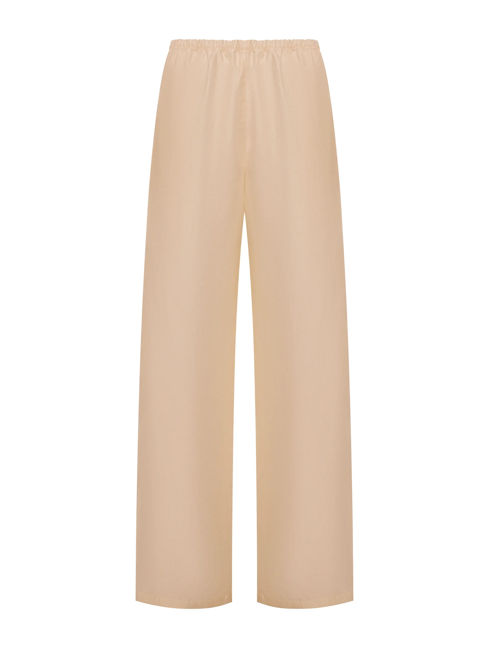 Штани з віскози та льону у ідеальному карамельно-персиковому відтінку — легкі, м’які, приємні до тіла. Летюча тканина красиво рухається під час ходи. Вільний крій та еластичний пояс забезпечують комфорт і свободу рухів, а широка штанина красиво лягає в русі. Можна носити як самостійну річ, або вдягати як повноцінний комплект з сорочкою. Ідеально підходить як для пляжних образів поверх купальника, так і для спекотних днів у місті, коли хочеться чогось легкого, але виразного.