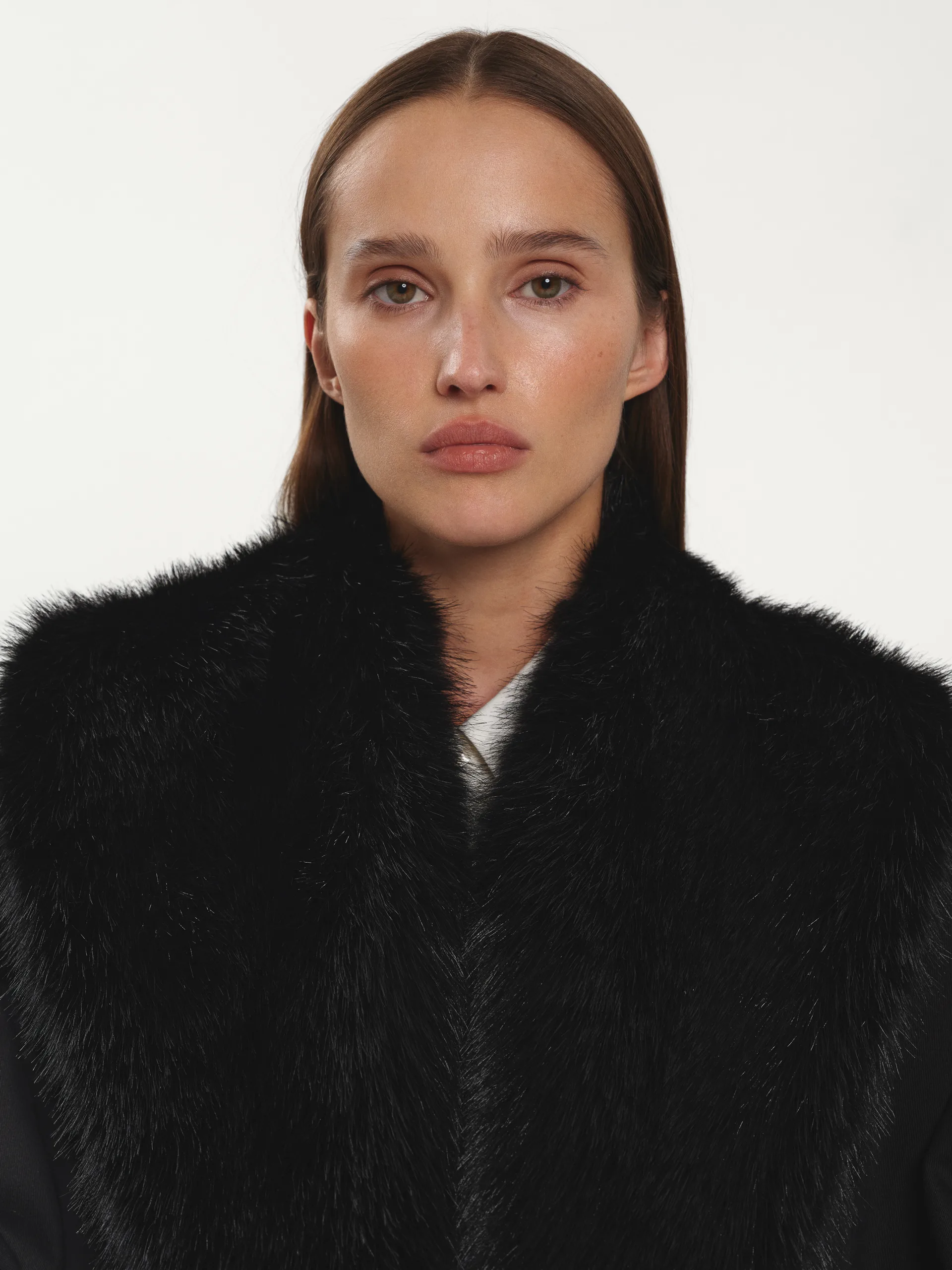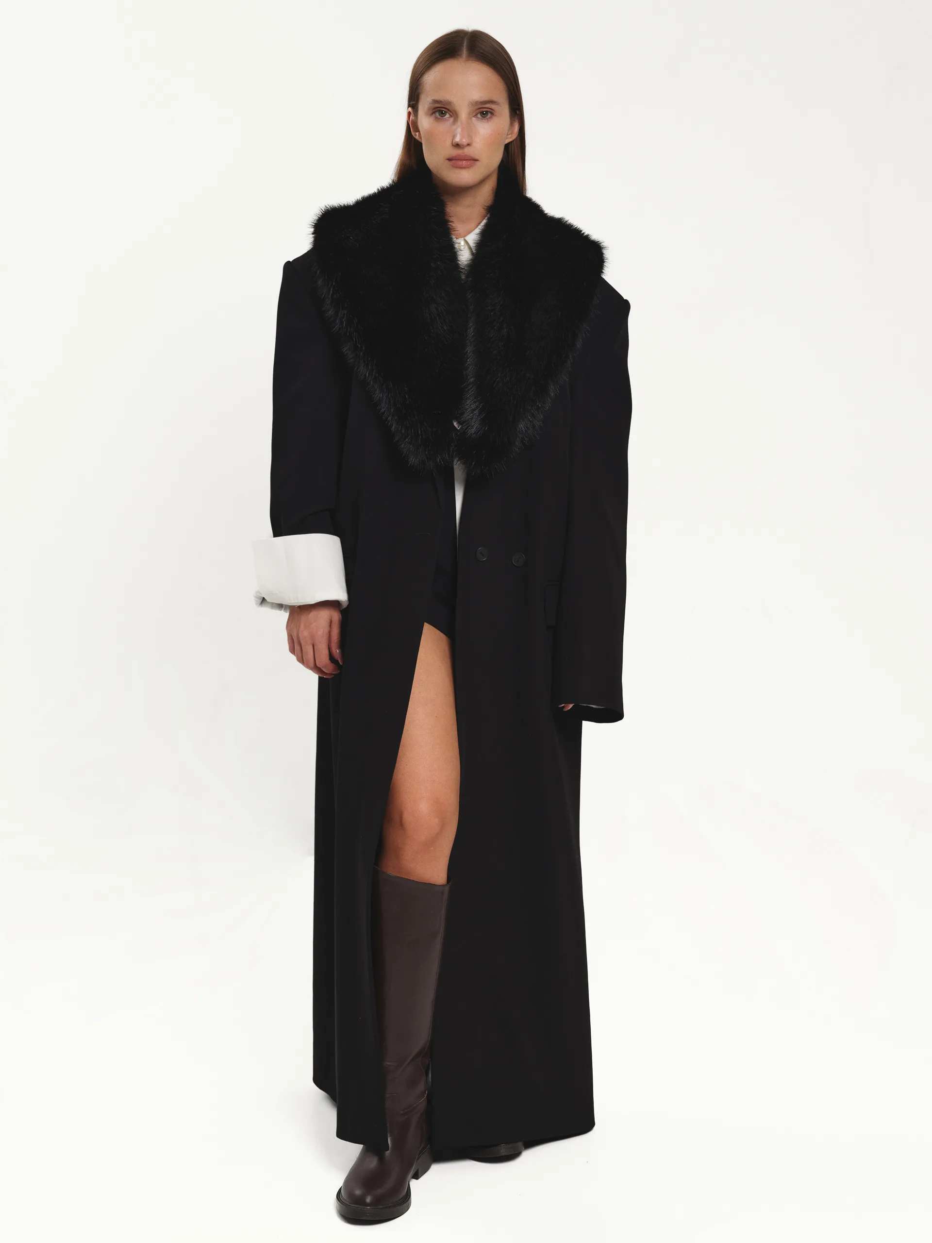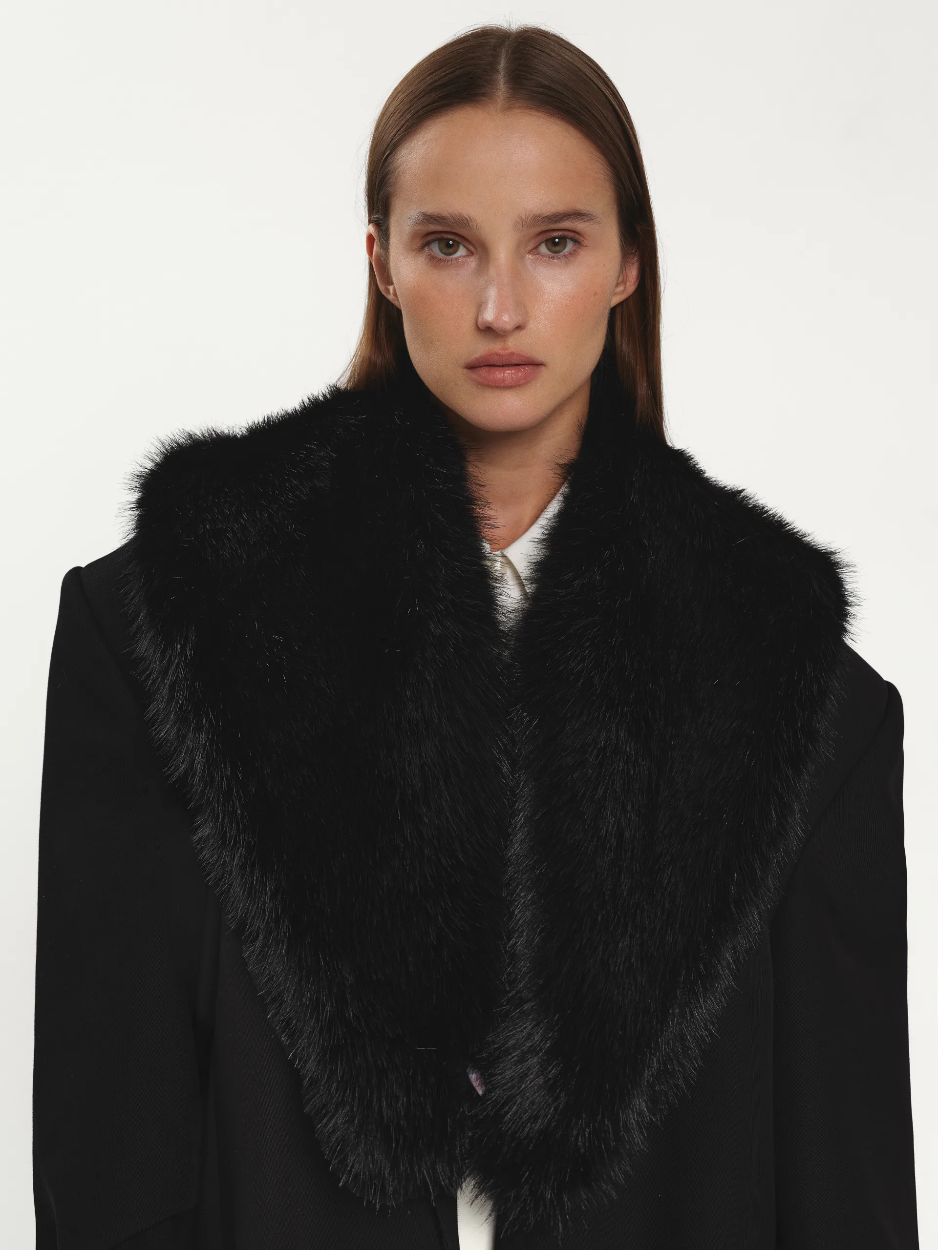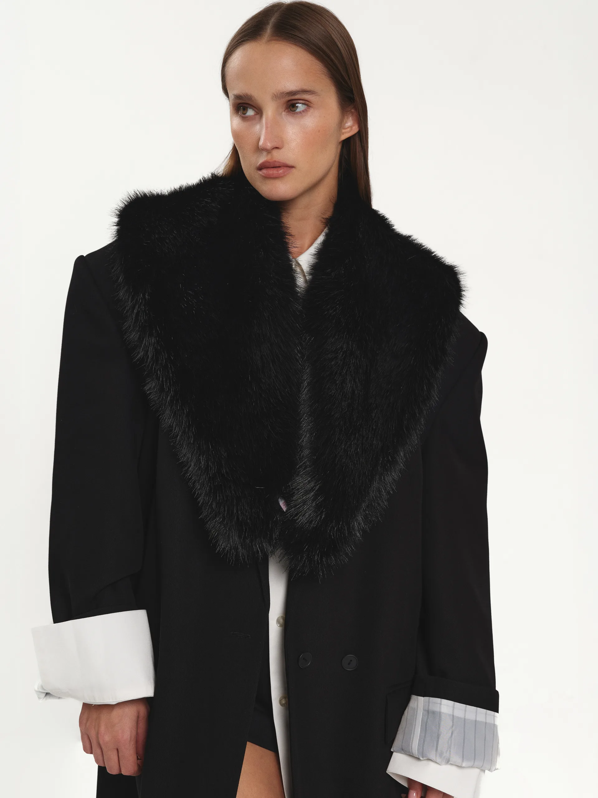 Комір з екохутра у глибокому чорному кольорі — стильний аксесуар і теплий акцент до будь-якого образу. Пасує до пальт, жакетів чи светрів, додаючи їм об’єму й м’якості. Легкий, затишний і універсальний — деталь, що робить навіть найпростішу комбінацію цікавою.