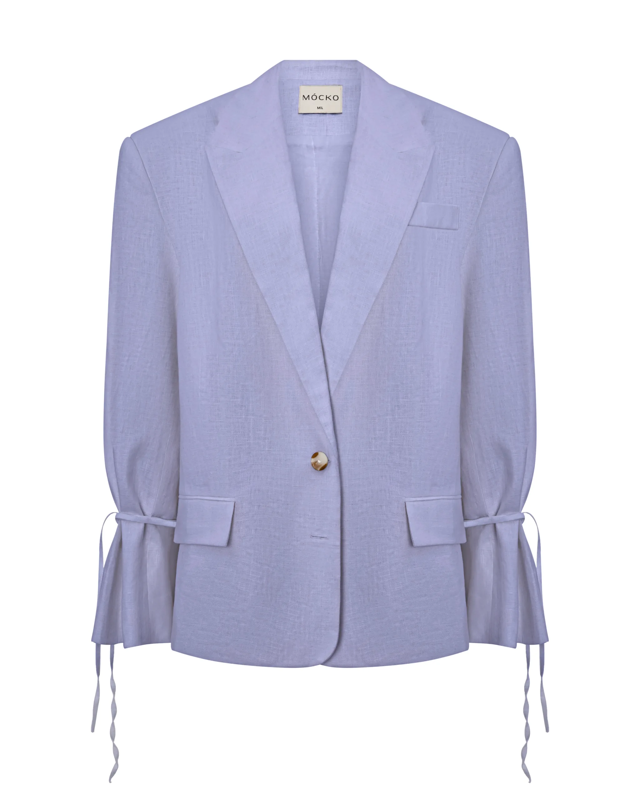 Жакет із льону, який тримає форму, але залишається легким і комфортним навіть у спеку. Вільний крій створює розслаблений силует і дозволяє легко комбінувати з іншими речами, а щільний лляний матеріал додає відчуття структури. Усередині — м’яка підкладка з бавовни та віскози. На рукавах жакета є зав’язки, які можна носити зав’язаними або вільними — вони додають образу легкості й романтики. Чудово виглядає як