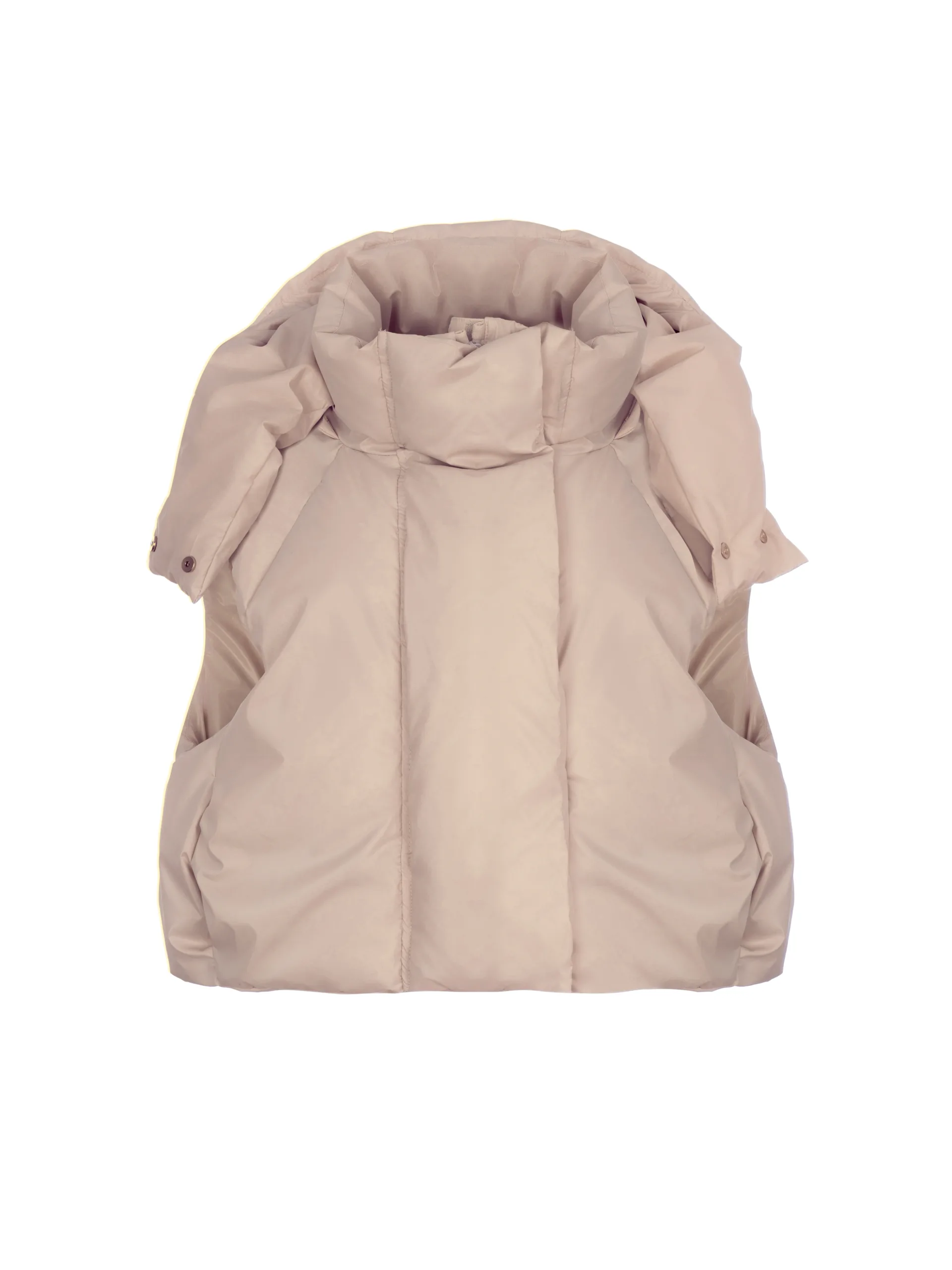 Пуховий жилет, лаконічний та легкий. Широкі пройми та вільний силует дозволяють носити його з товстим светром або худі. Ми вибрали для нього плащову тканину, яка захистить від крапель дощу. Застібається на замок та защіпки, а також має капюшон, який можна зняти.