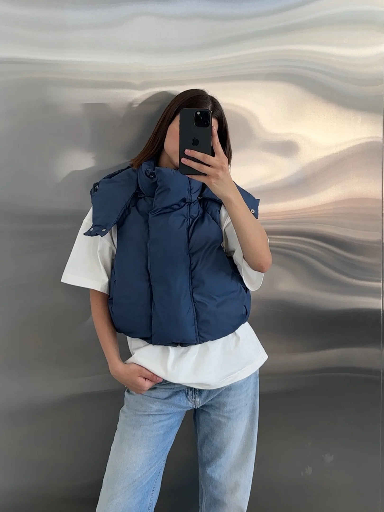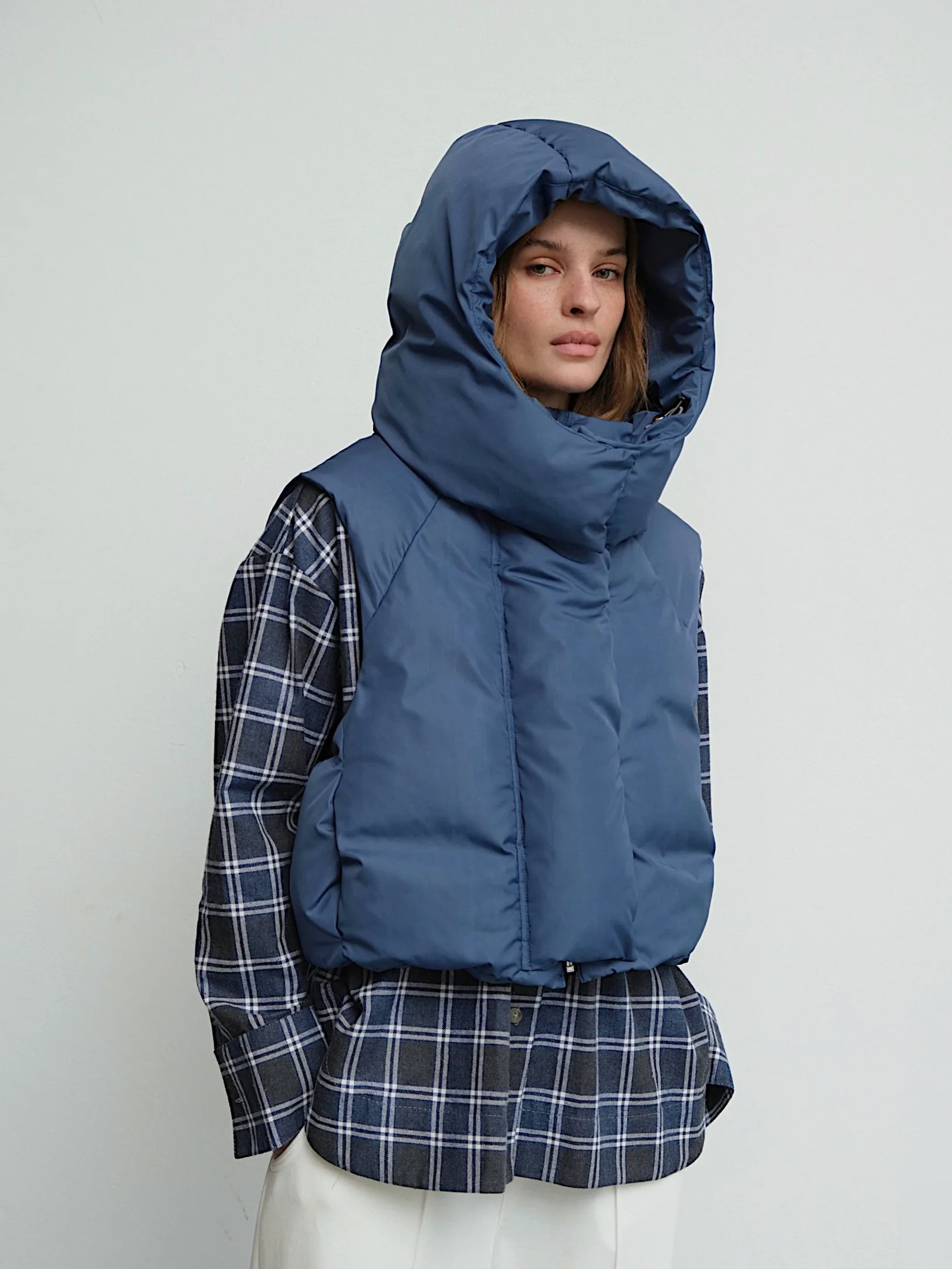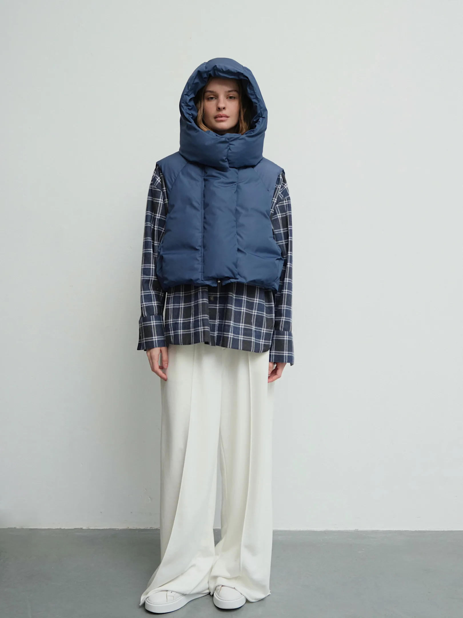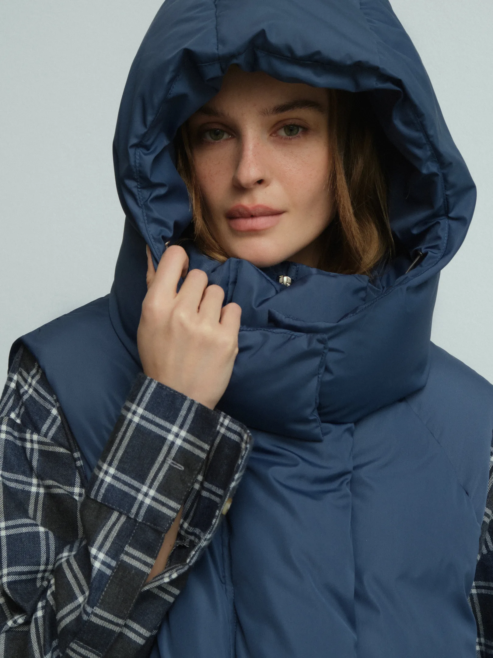 Пуховий жилет, лаконічний та легкий. Широкі пройми та вільний силует дозволяють носити його з товстим светром або худі. Ми вибрали для нього плащову тканину, яка захистить від крапель дощу. Застібається на замок та защіпки, а також має капюшон, який можна зняти.