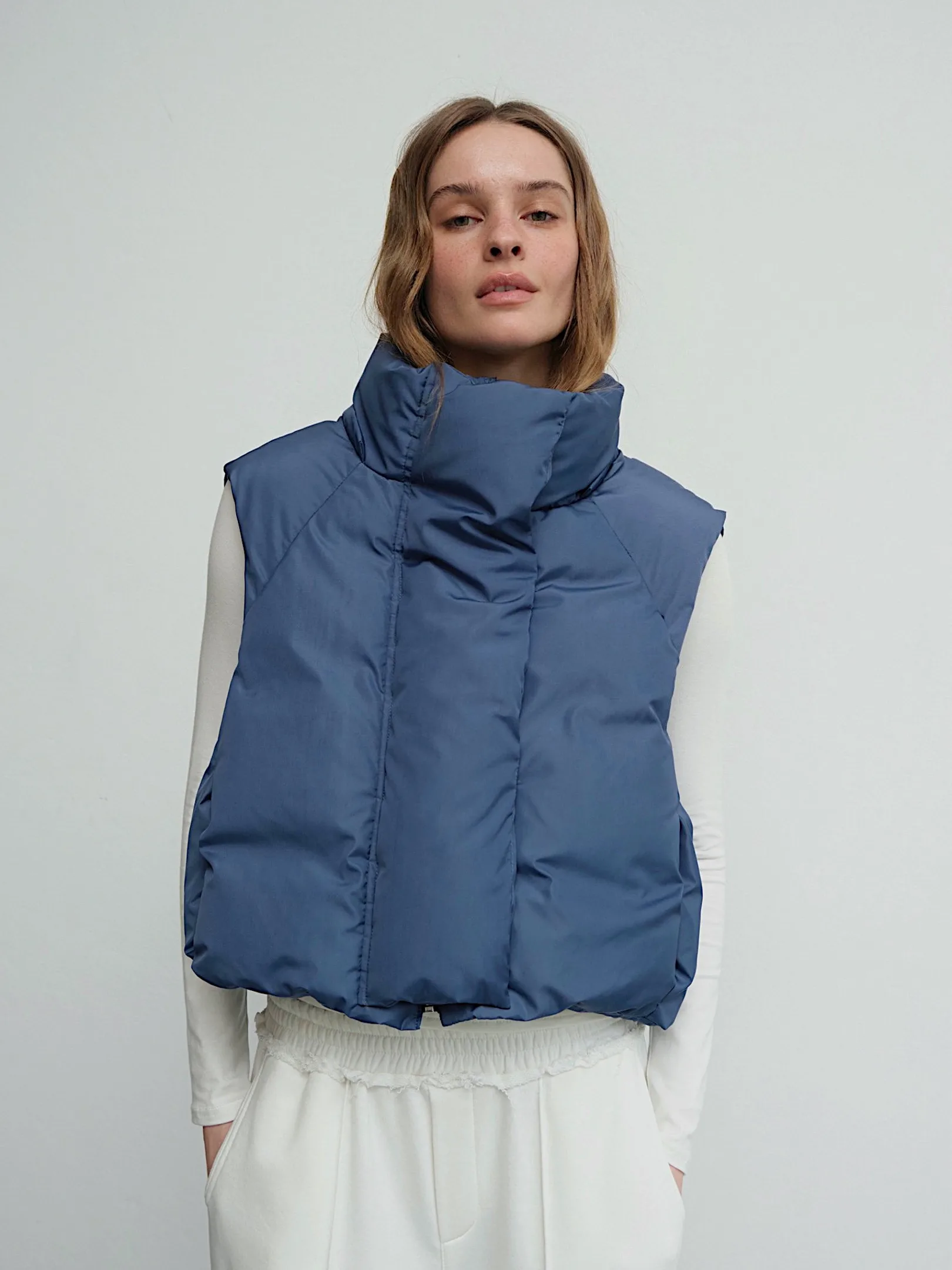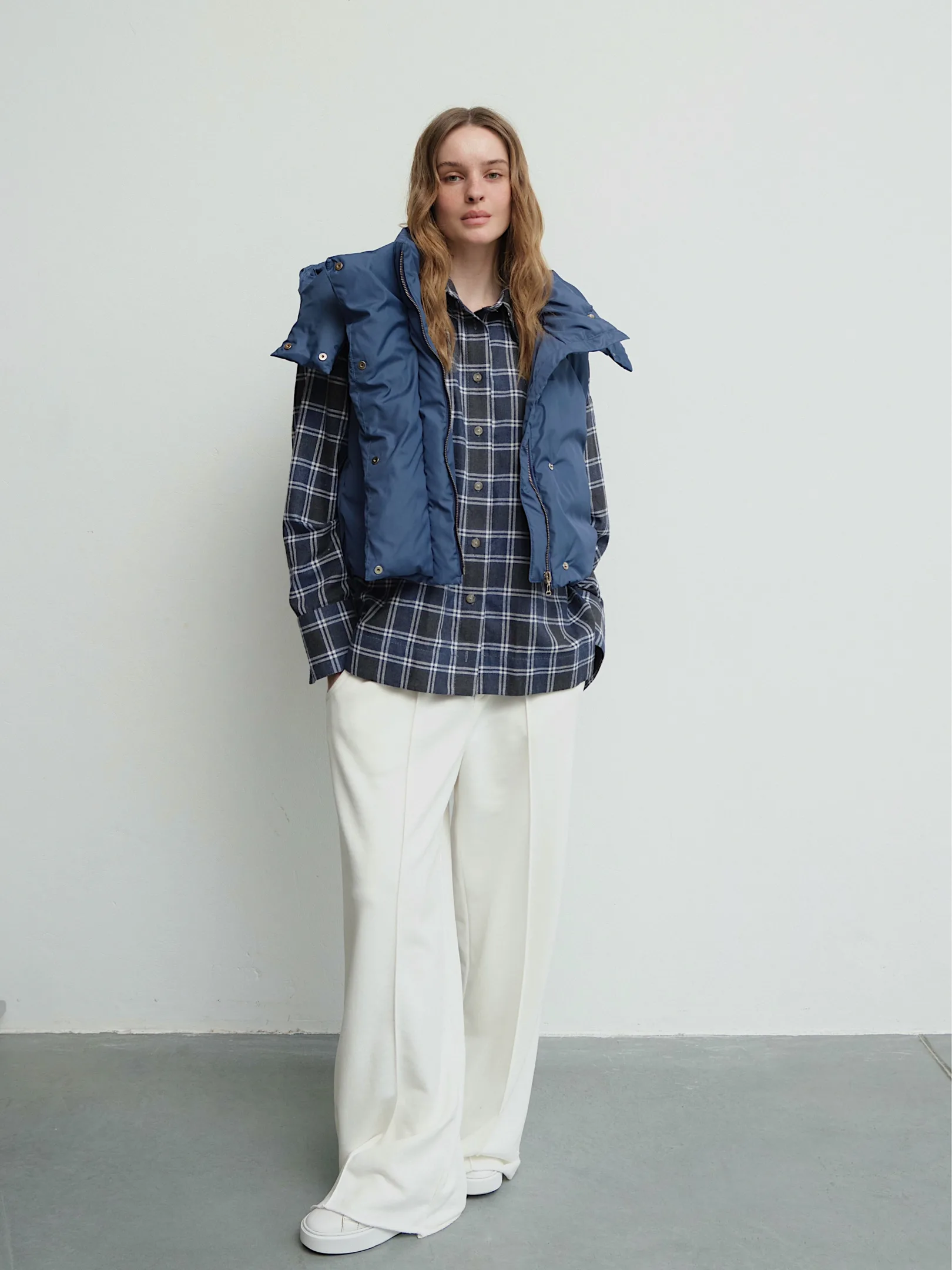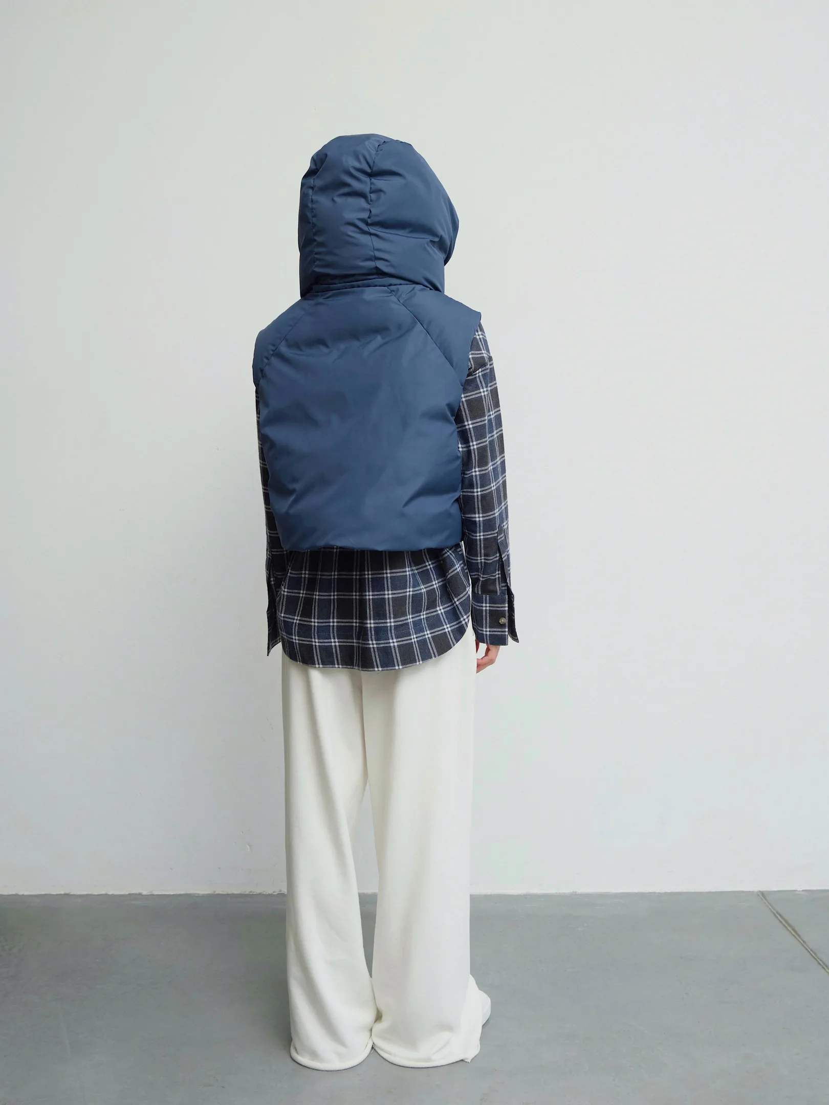 Пуховий жилет, лаконічний та легкий. Широкі пройми та вільний силует дозволяють носити його з товстим светром або худі. Ми вибрали для нього плащову тканину, яка захистить від крапель дощу. Застібається на замок та защіпки, а також має капюшон, який можна зняти.