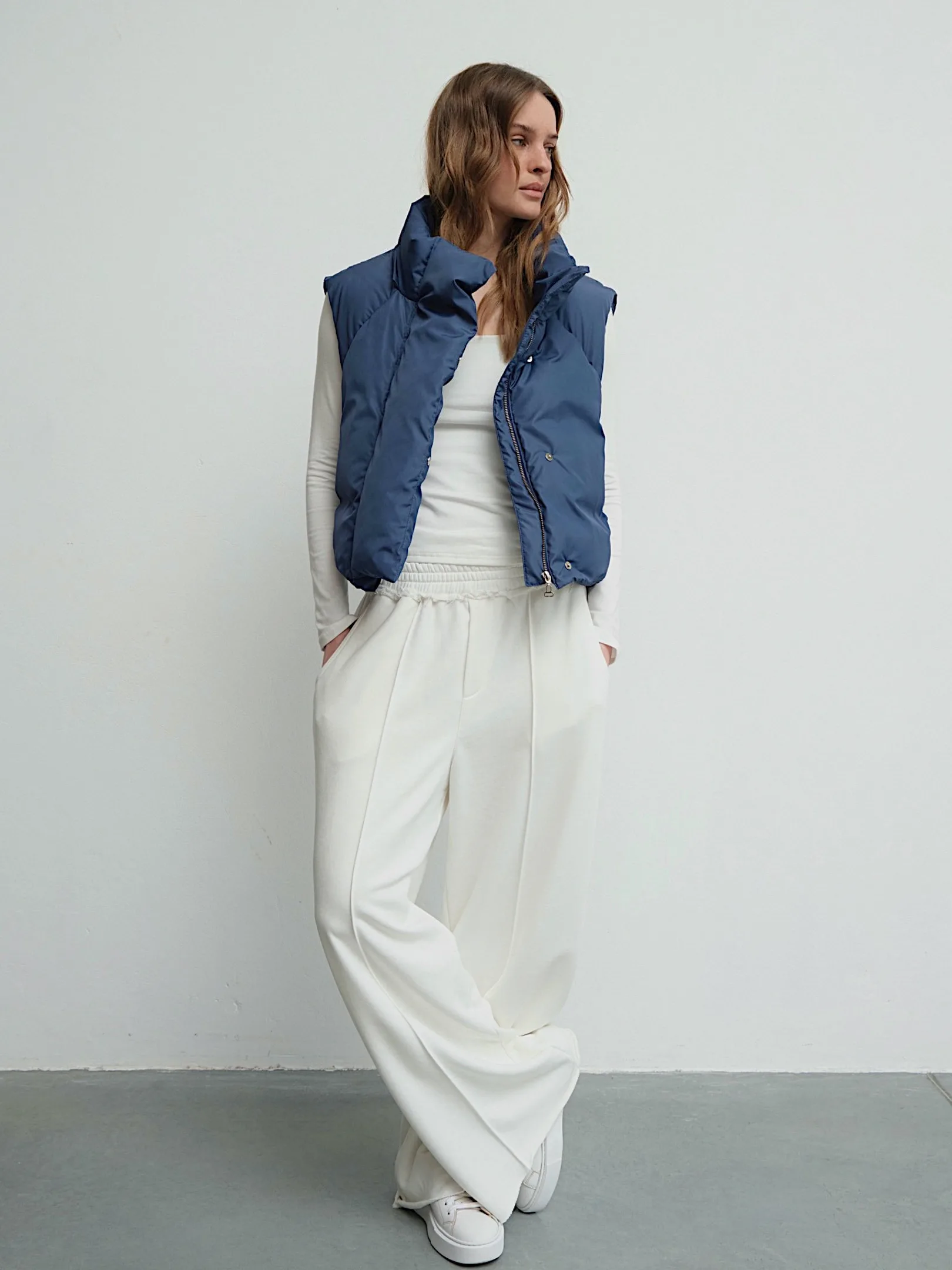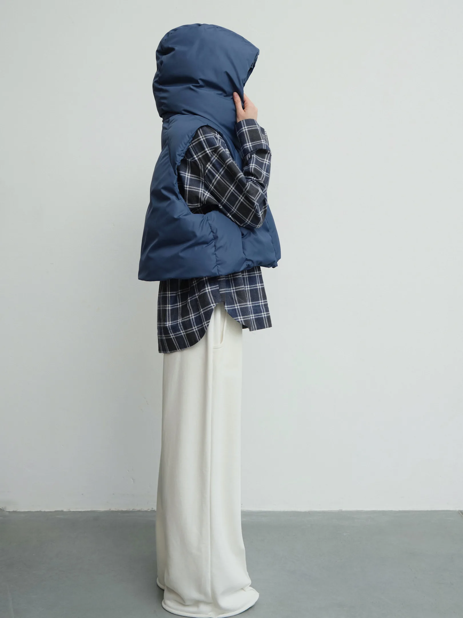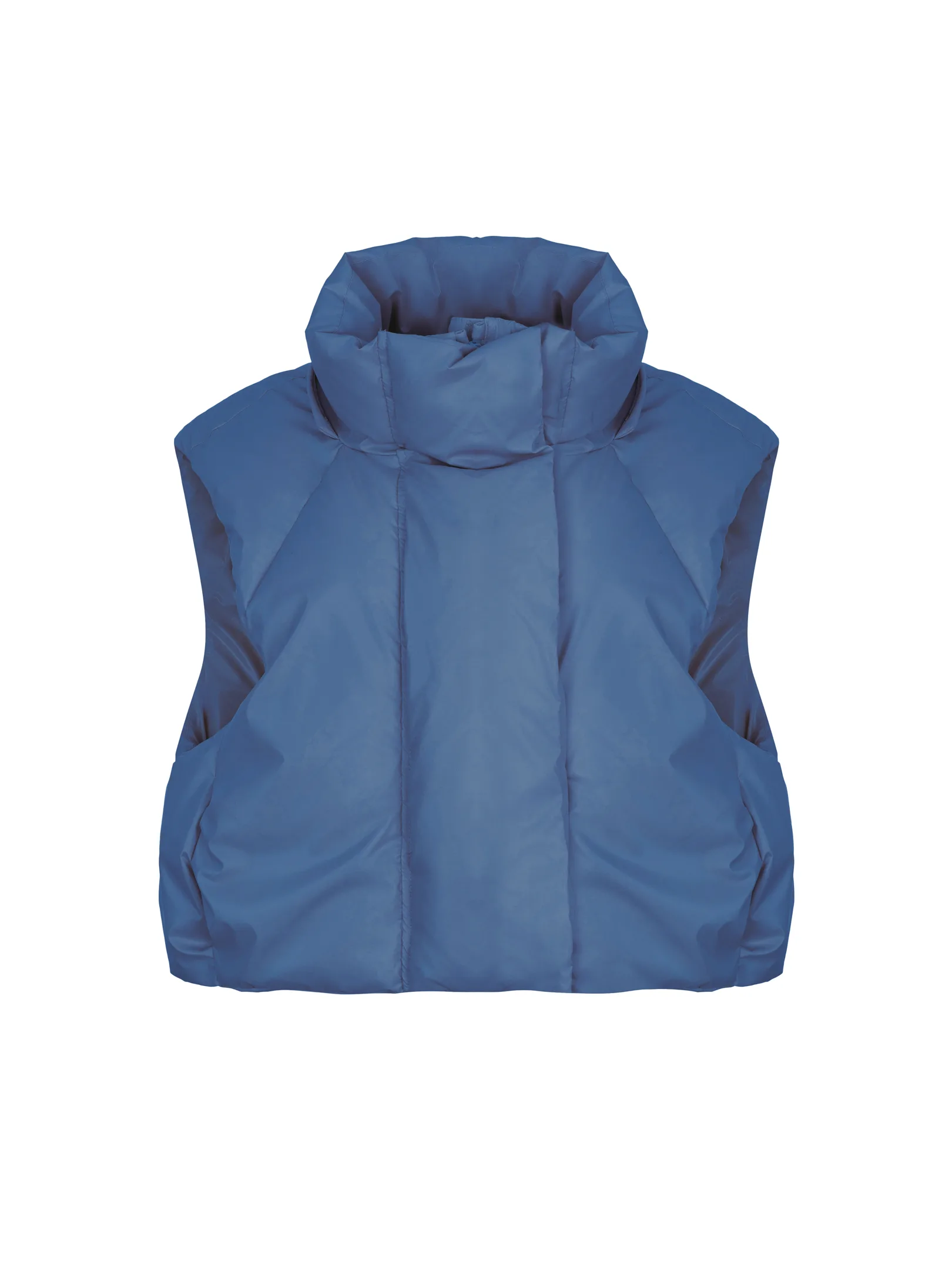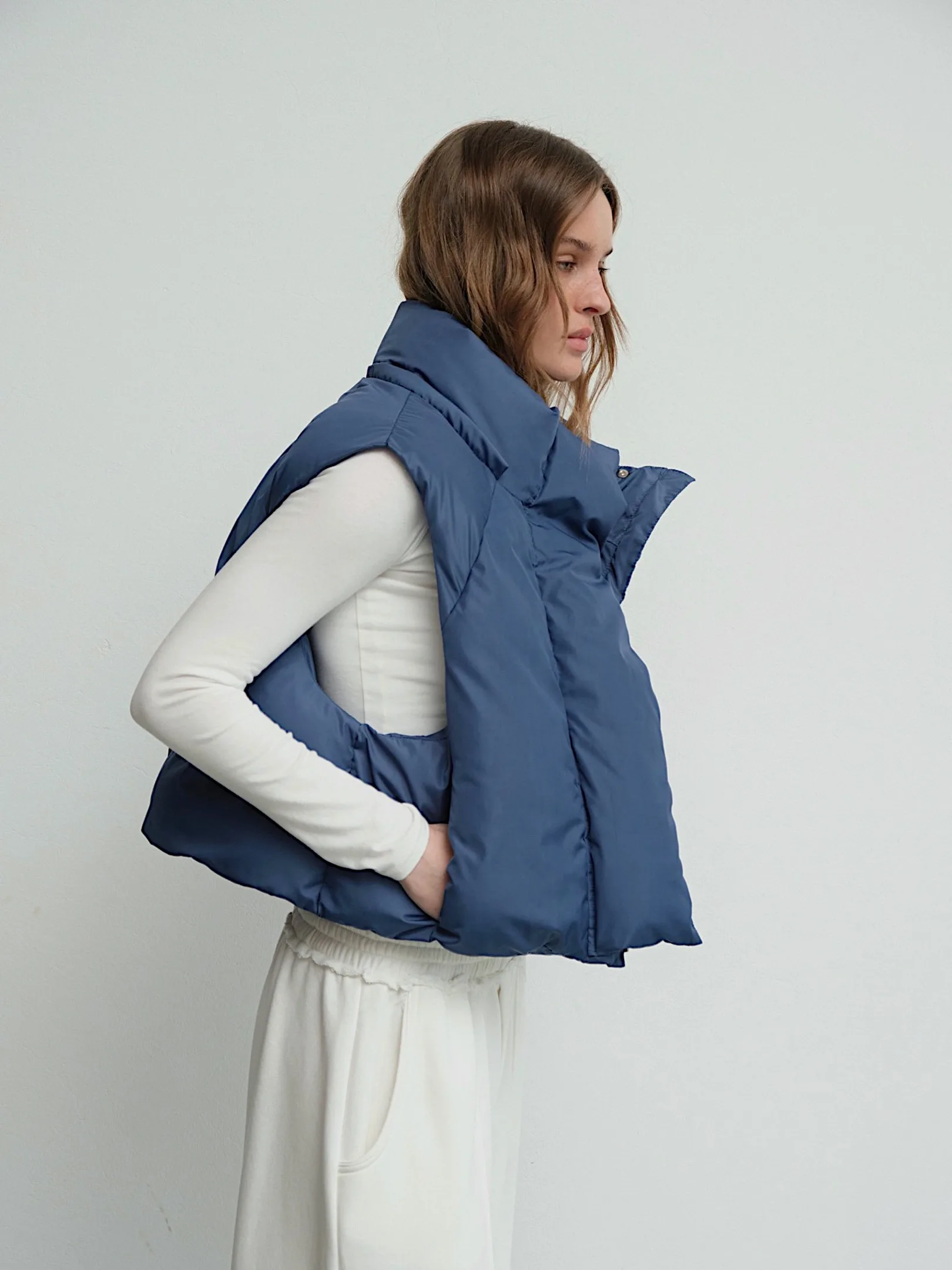 Пуховий жилет, лаконічний та легкий. Широкі пройми та вільний силует дозволяють носити його з товстим светром або худі. Ми вибрали для нього плащову тканину, яка захистить від крапель дощу. Застібається на замок та защіпки, а також має капюшон, який можна зняти.