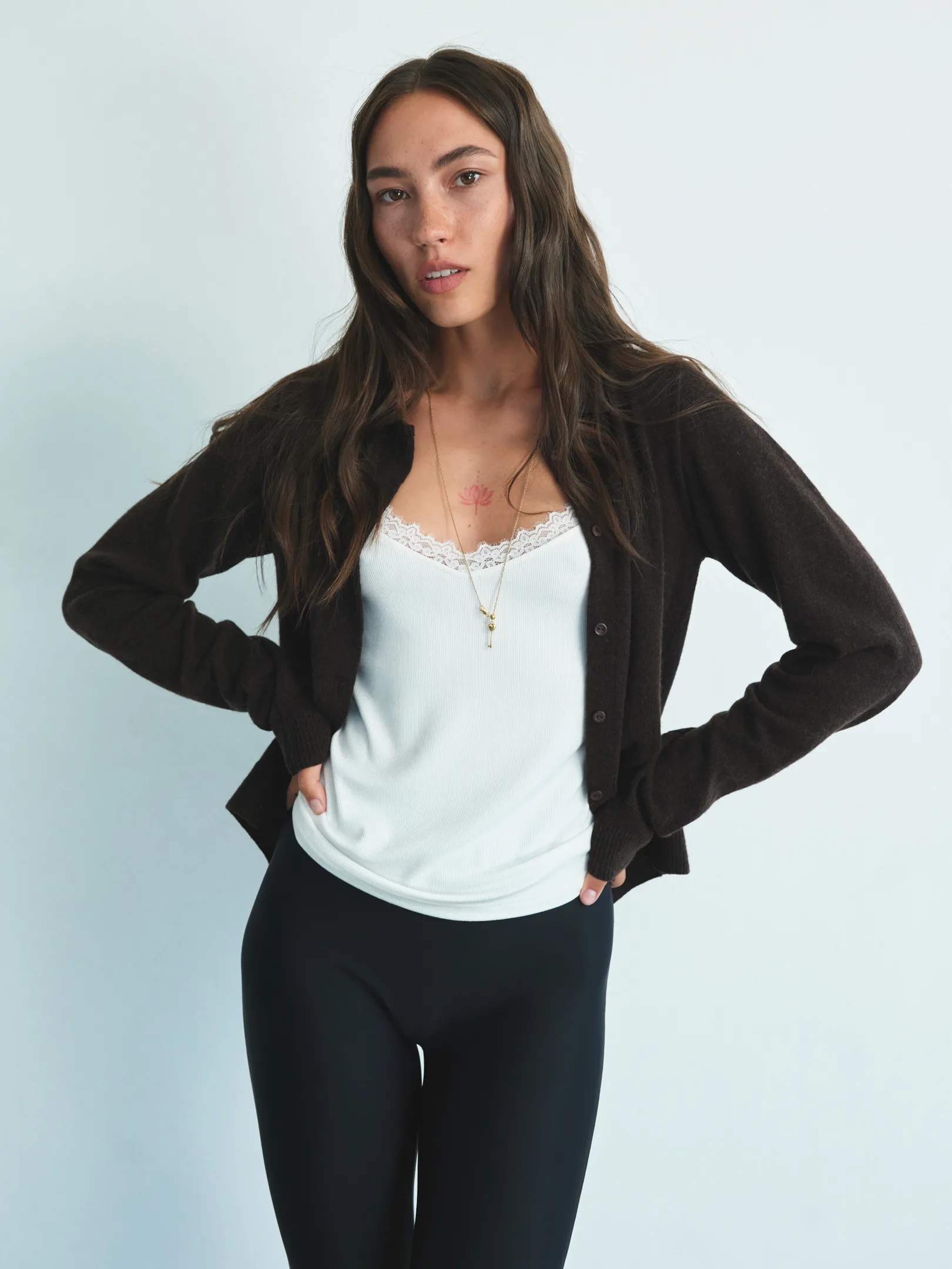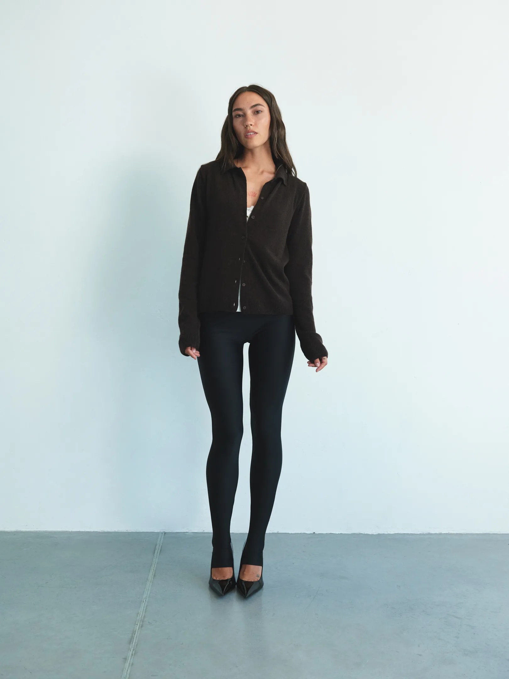 Чорні легінси з еластичної тканини, м’яко облягають тіло та підкреслюють форму. Нейлон у складі додає матеріалу легкого м’якого блиску й гладкості, завдяки чому тканина виглядає акуратно та залишається практичною — до неї нічого не чіпляється.