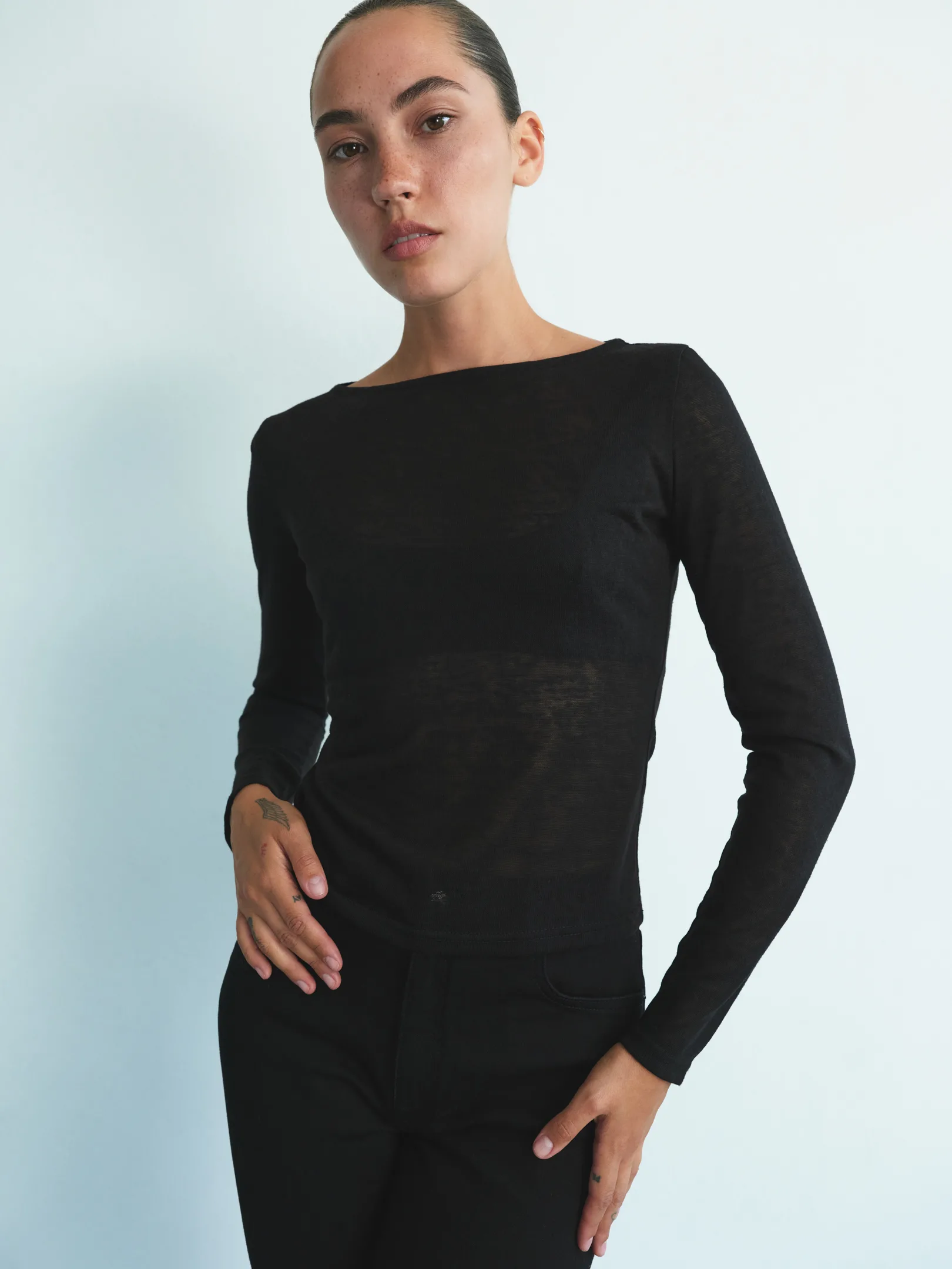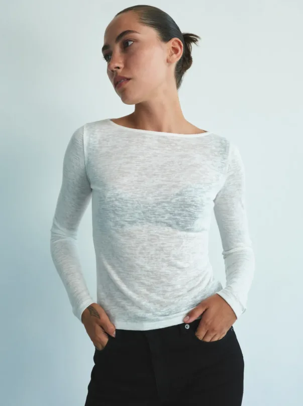 Базовий вкорочений напівпрозорий лонгслів, доступний у двох кольорах — чорному та молочному. Легка напівпрозора тканина відкриває багато варіантів для стилізації: його можна носити самостійно, комбінувати з топом чи бюстгальтером, або створювати багатошарові образи. Лонгслів гарно працює як нижній шар під светр, жакет чи тренч, додаючи образу глибини.