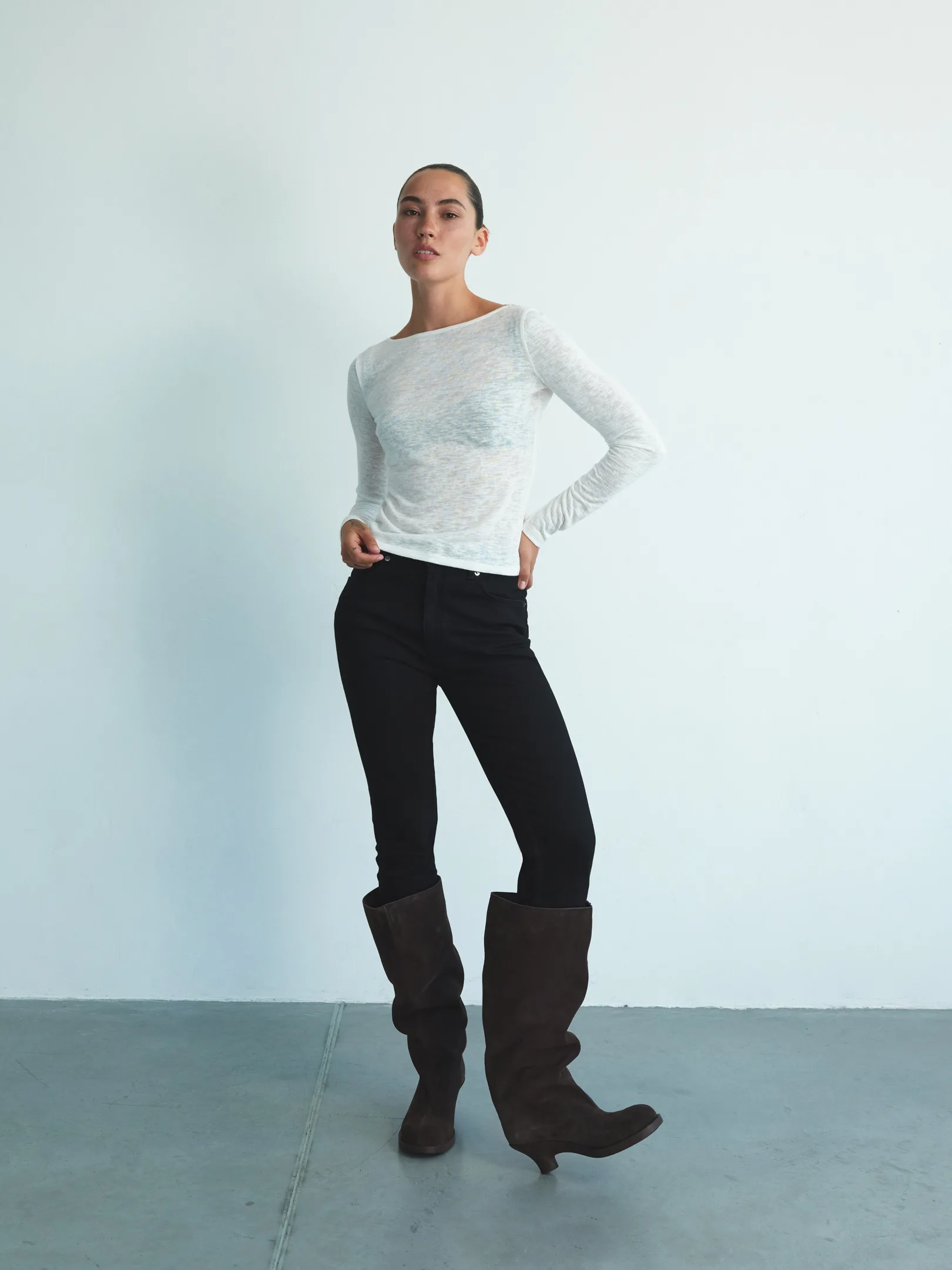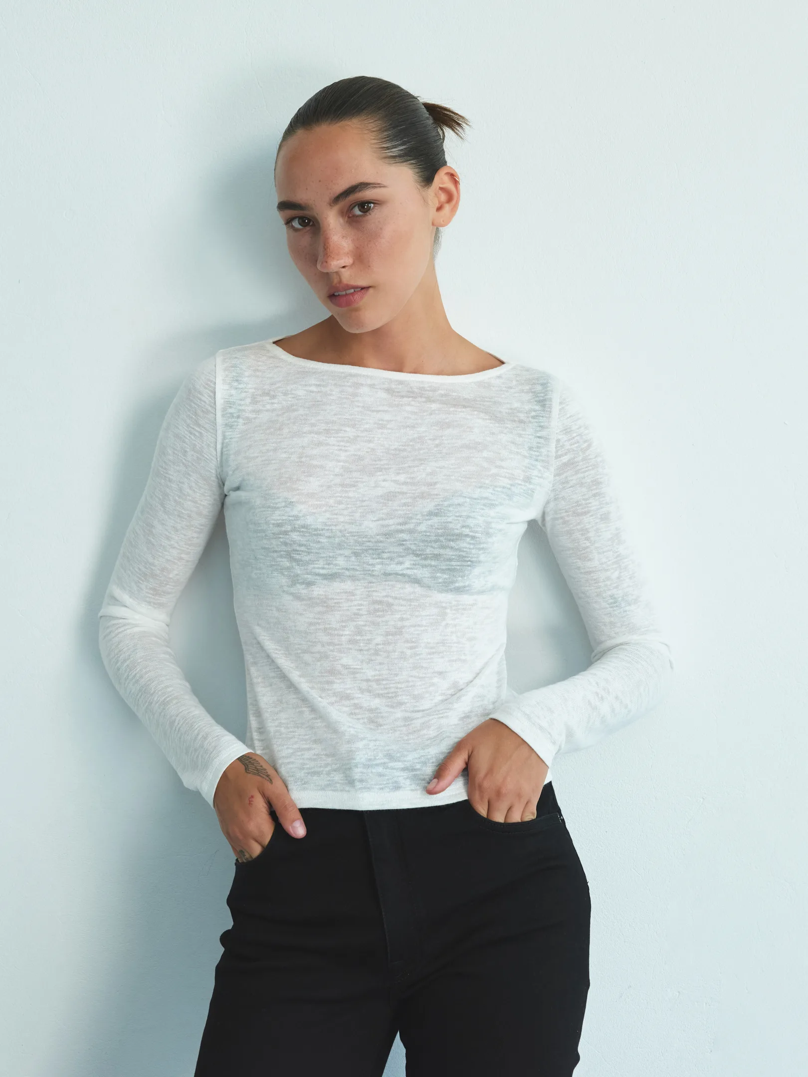 Базовий вкорочений напівпрозорий лонгслів, доступний у двох кольорах — чорному та молочному. Легка напівпрозора тканина відкриває багато варіантів для стилізації: його можна носити самостійно, комбінувати з топом чи бюстгальтером, або створювати багатошарові образи. Лонгслів гарно працює як нижній шар під светр, жакет чи тренч, додаючи образу глибини.