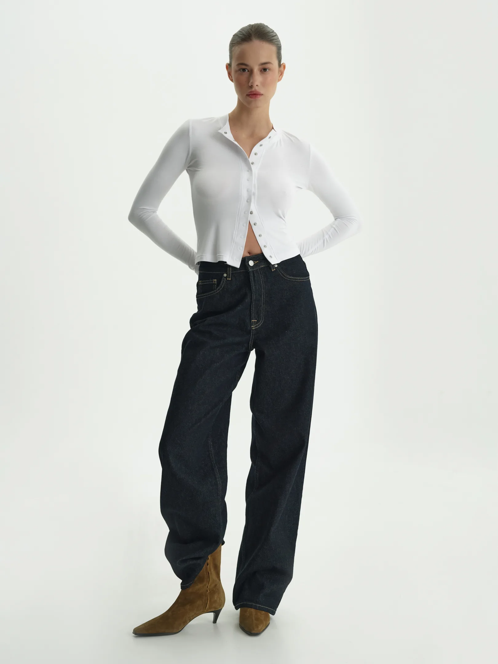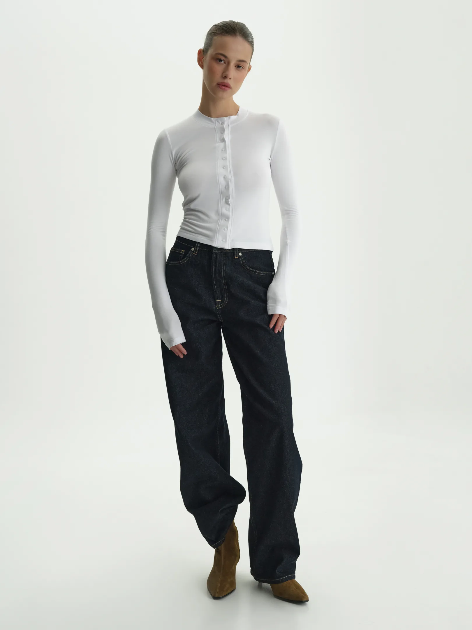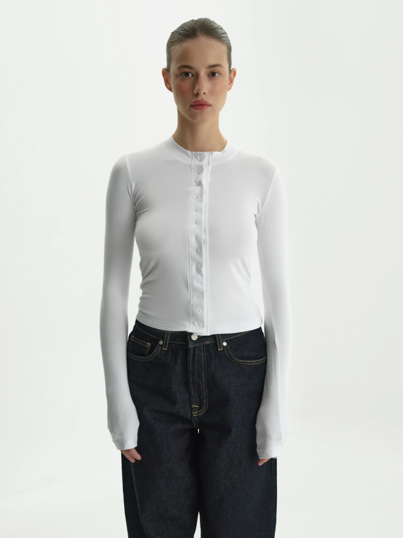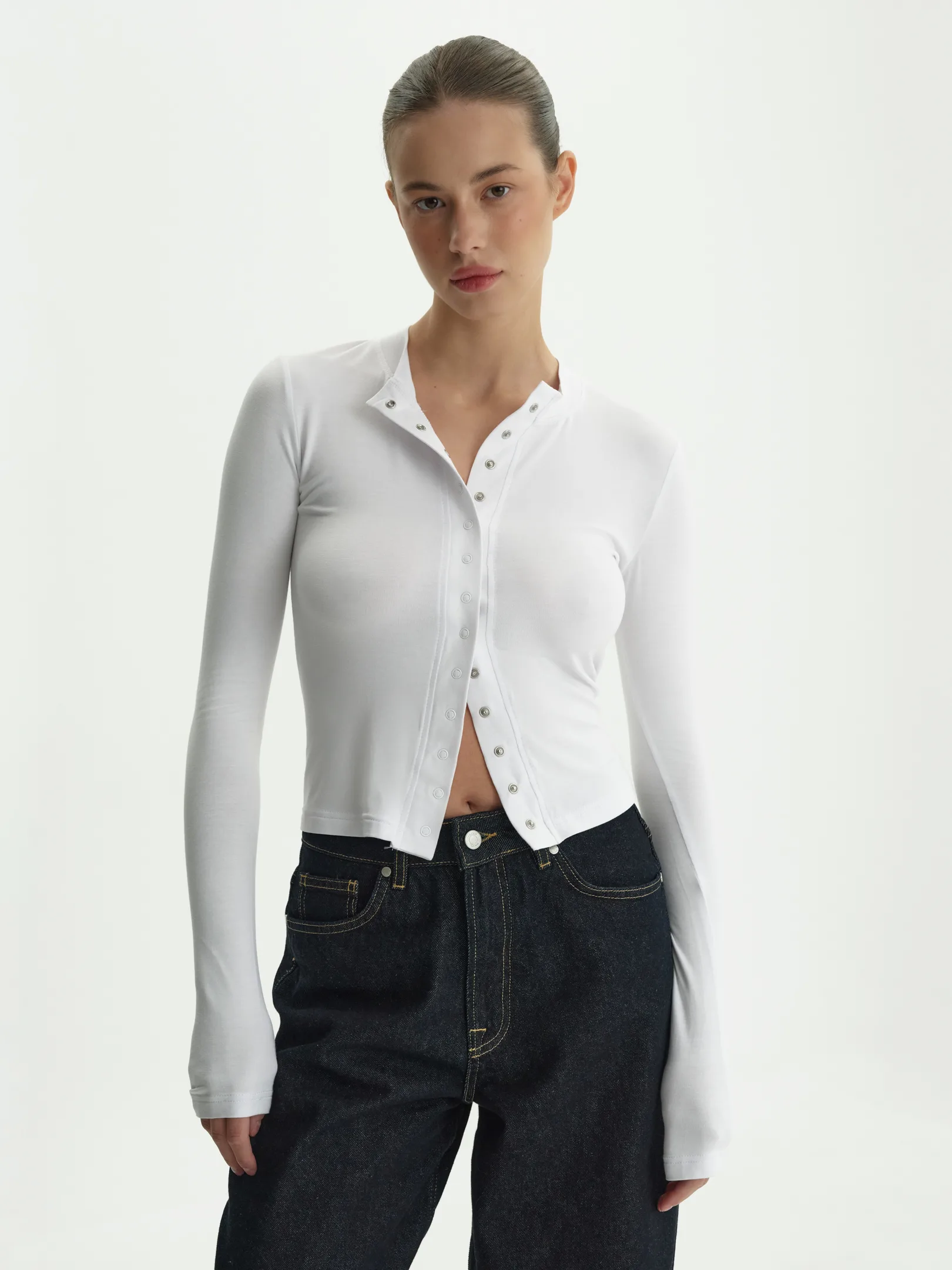 Базовий лонгслів прямого крою на кнопках. Лаконічний силует, комфортна посадка, м’яка приємна до тіла тканина – ідеальна річ для щоденного гардероба. Застібка на кнопки додає варіативності у стилізації: можна носити повністю застібнутим або трохи розстібнути для більш розслабленого вигляду. Представлений у універсальних кольорах – білому, чорному та синьому.