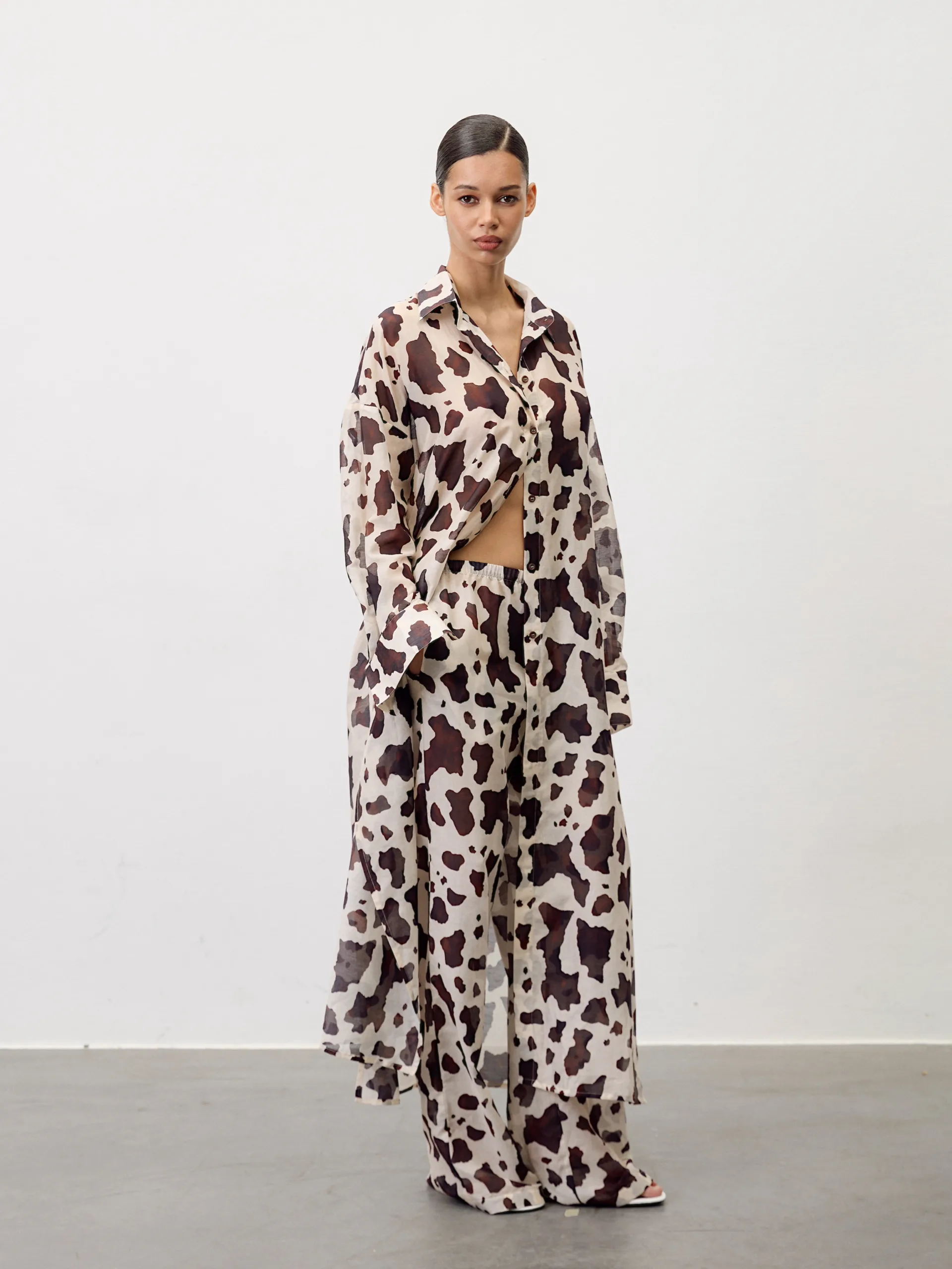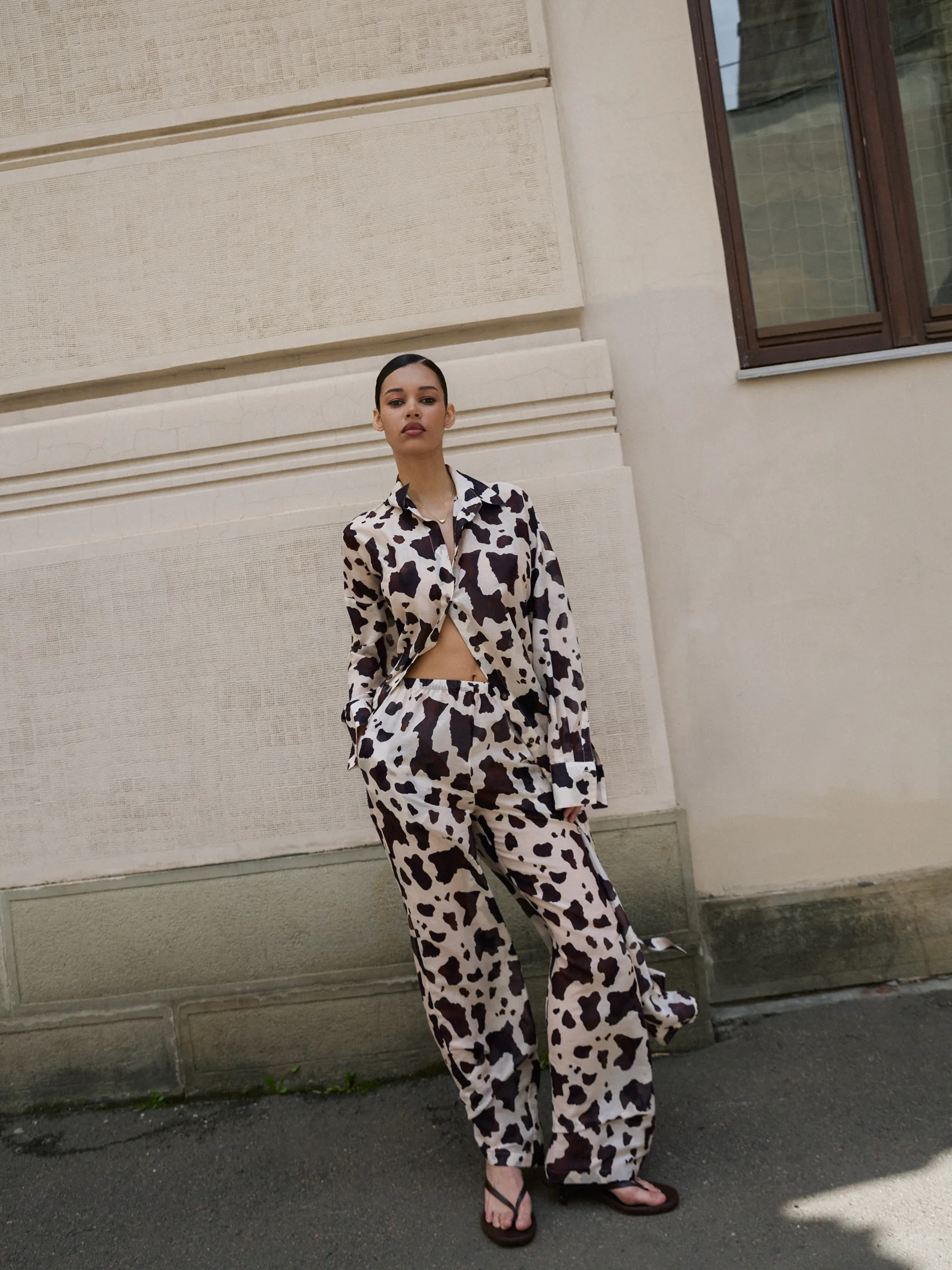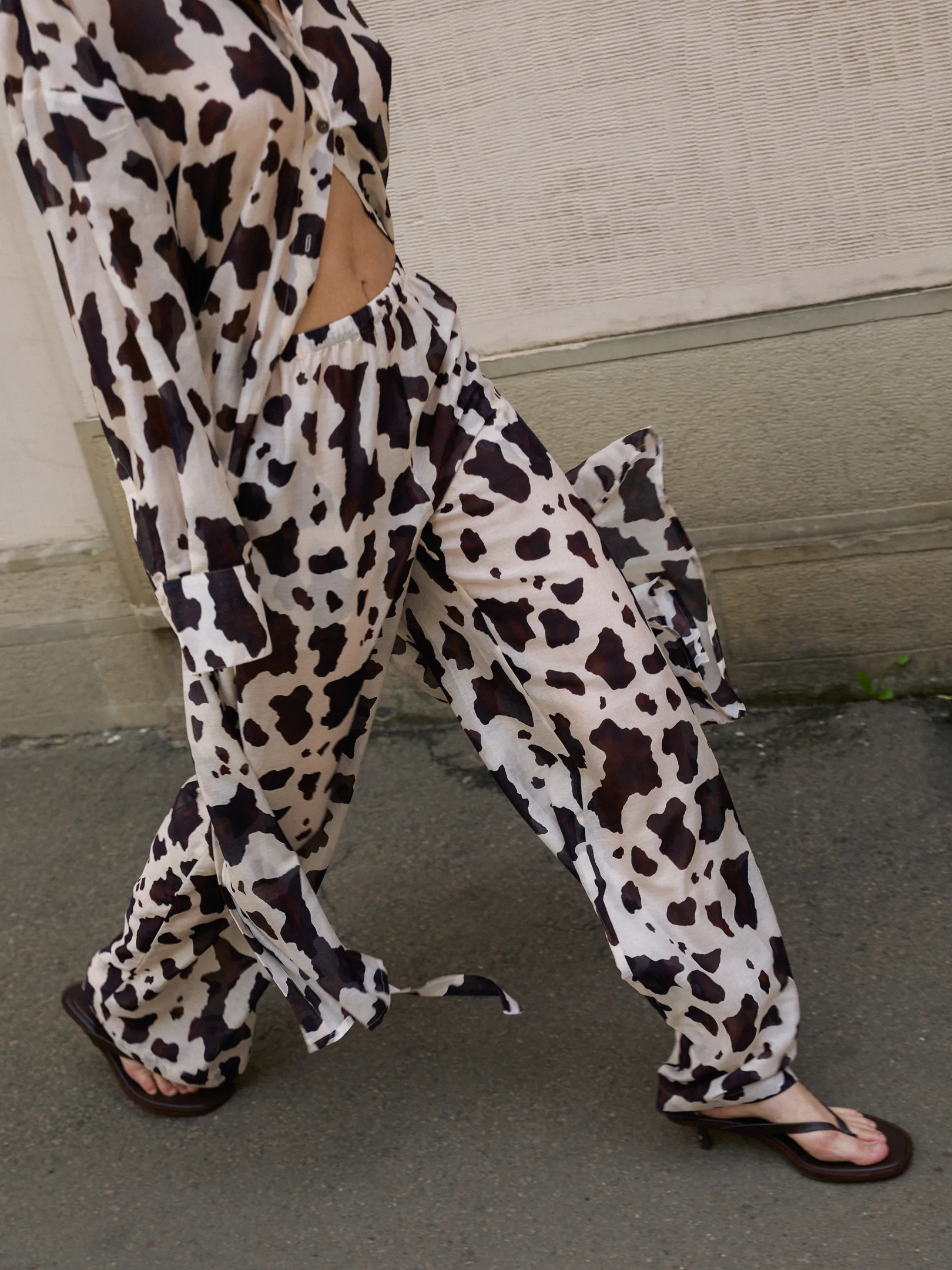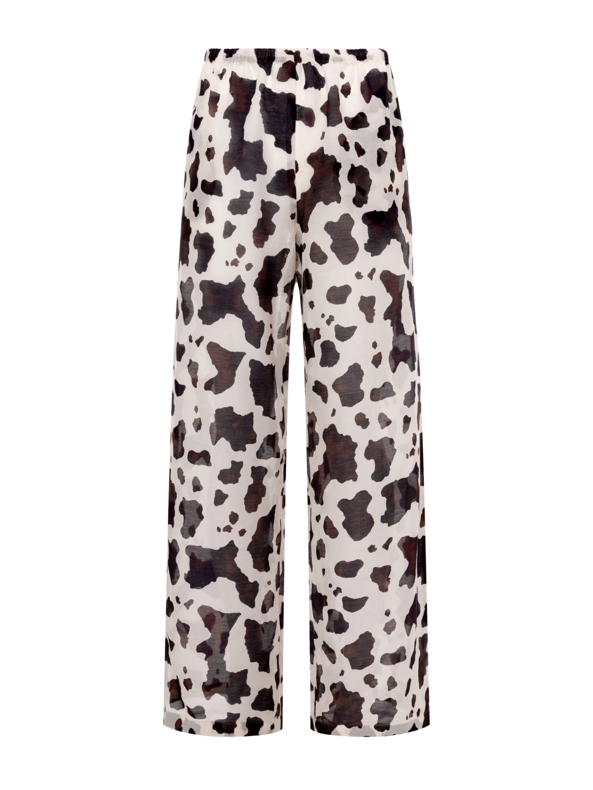 Штани з шовку та бавовни з виразним коров’ячим принтом — легкі, м’які, приємні до тіла. Летюча тканина красиво рухається під час ходи. Вільний крій та еластичний пояс забезпечують комфорт і свободу рухів, а широка штанина красиво лягає в русі. Можна носити як самостійну річ, або вдягати як повноцінний комплект з сорочкою. Ідеально підходить як для пляжних образів поверх купальника, так і для спекотних днів у місті, коли хочеться чогось легкого, але виразного.