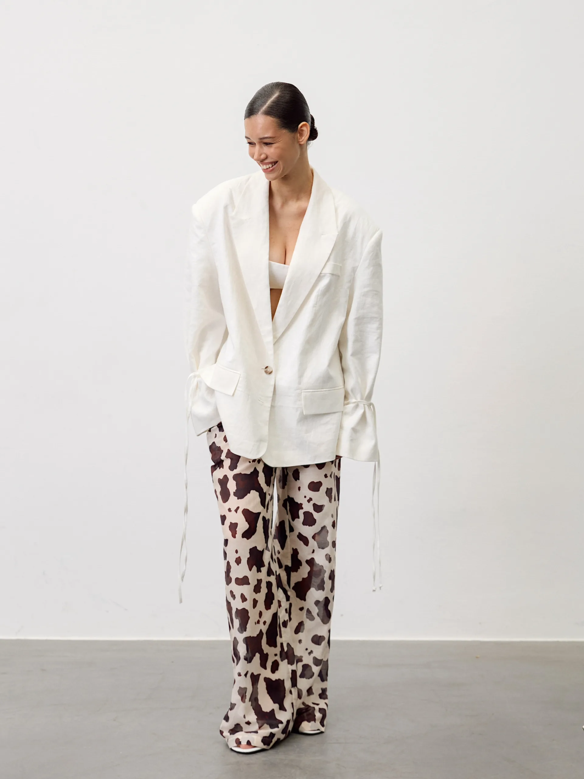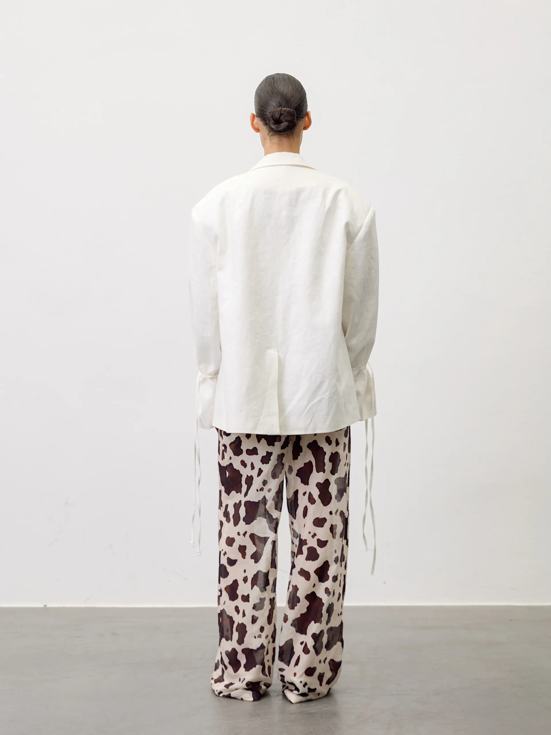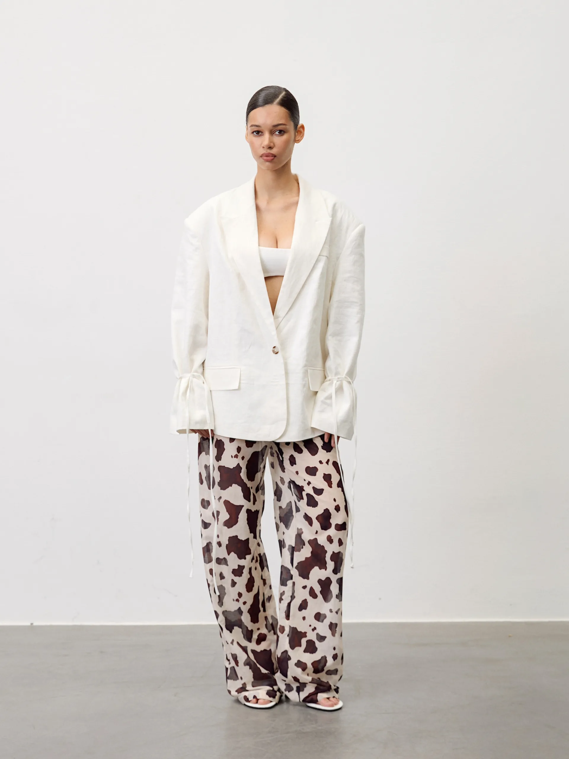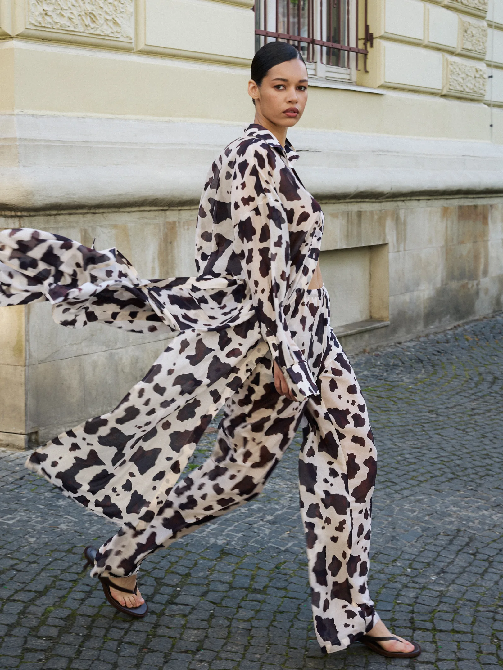 Штани з шовку та бавовни з виразним коров’ячим принтом — легкі, м’які, приємні до тіла. Летюча тканина красиво рухається під час ходи. Вільний крій та еластичний пояс забезпечують комфорт і свободу рухів, а широка штанина красиво лягає в русі. Можна носити як самостійну річ, або вдягати як повноцінний комплект з сорочкою. Ідеально підходить як для пляжних образів поверх купальника, так і для спекотних днів у місті, коли хочеться чогось легкого, але виразного.