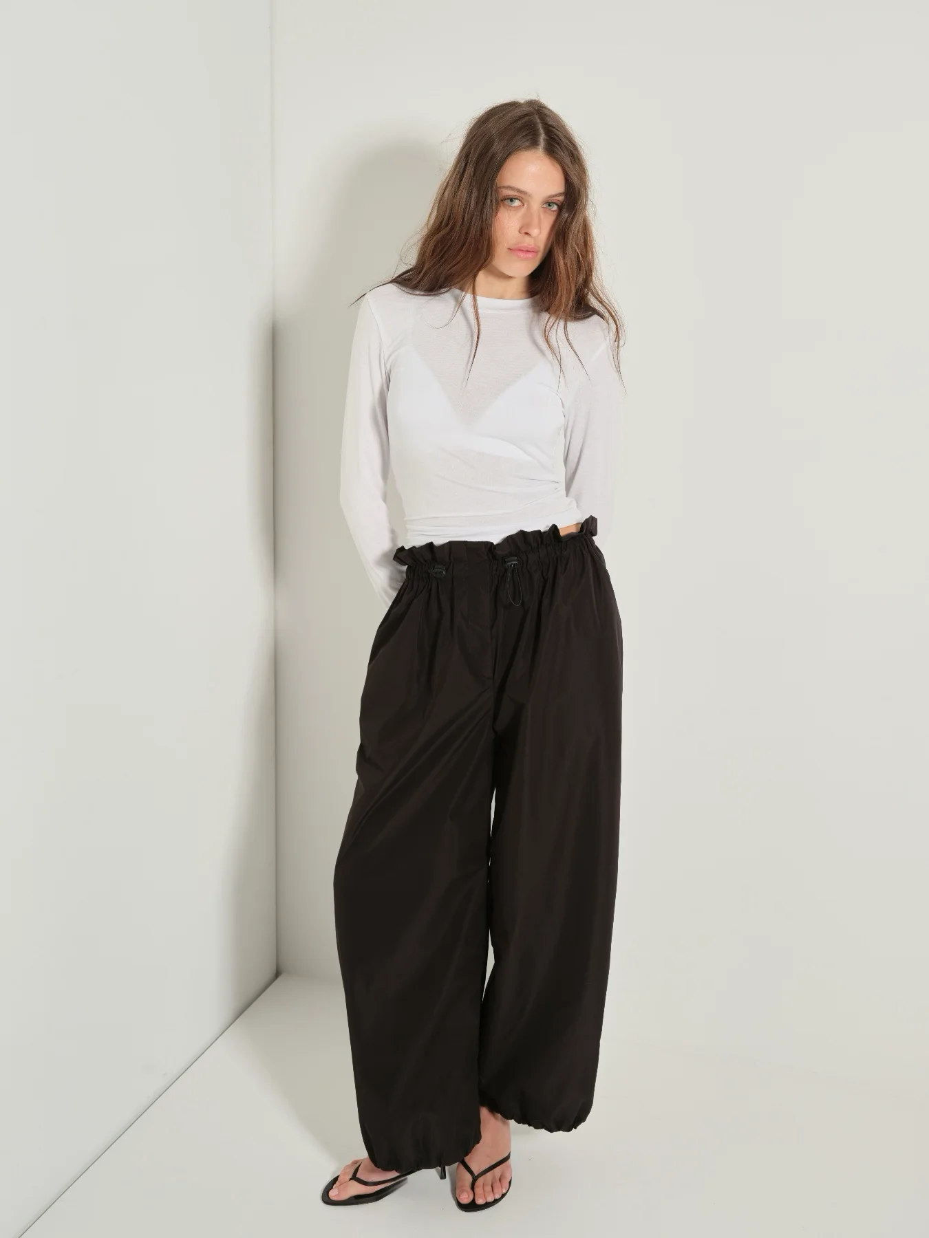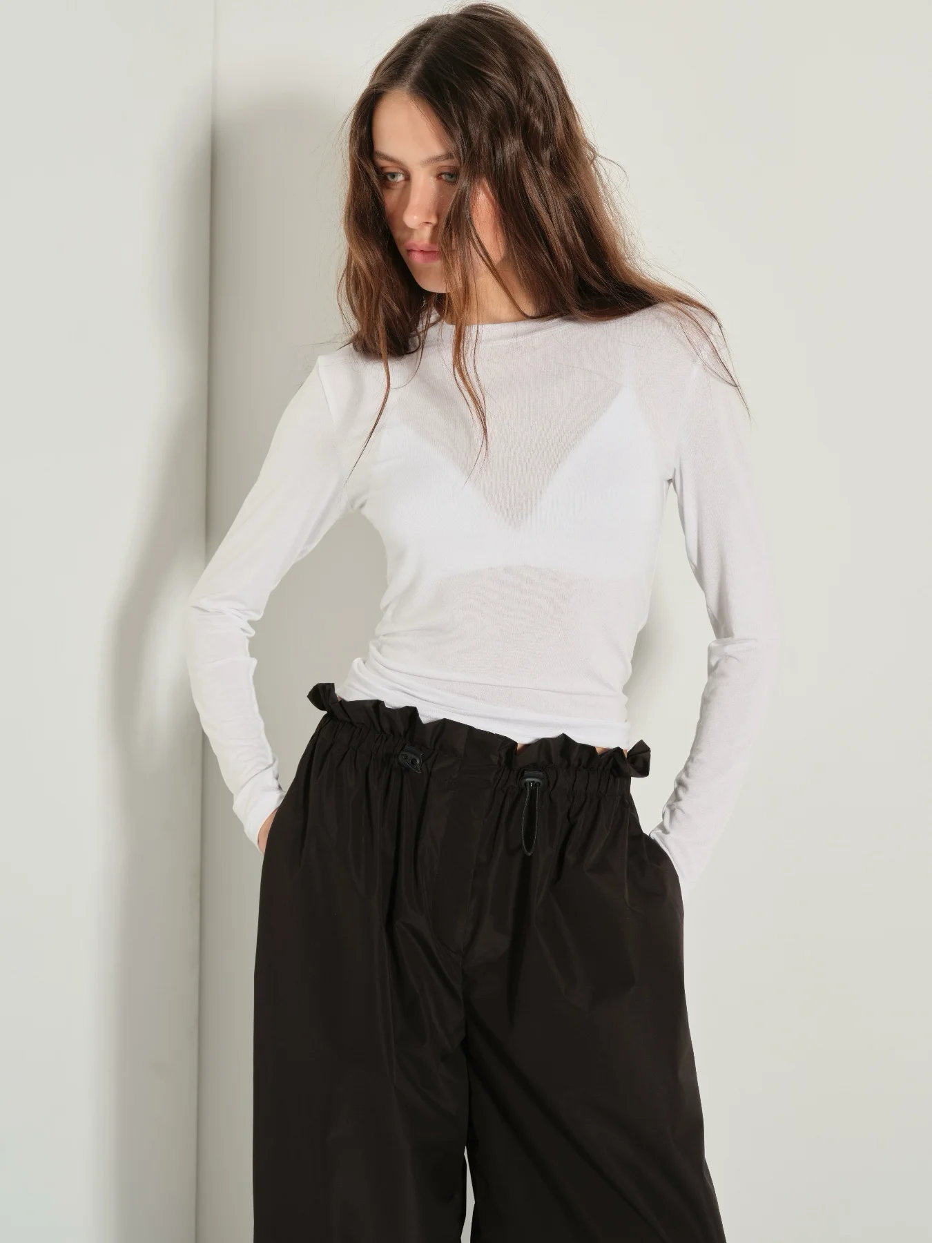 Напівпрозорий лонгслів із легкої еластичної тканини, що м’яко облягає тіло та майже не відчувається на шкірі.