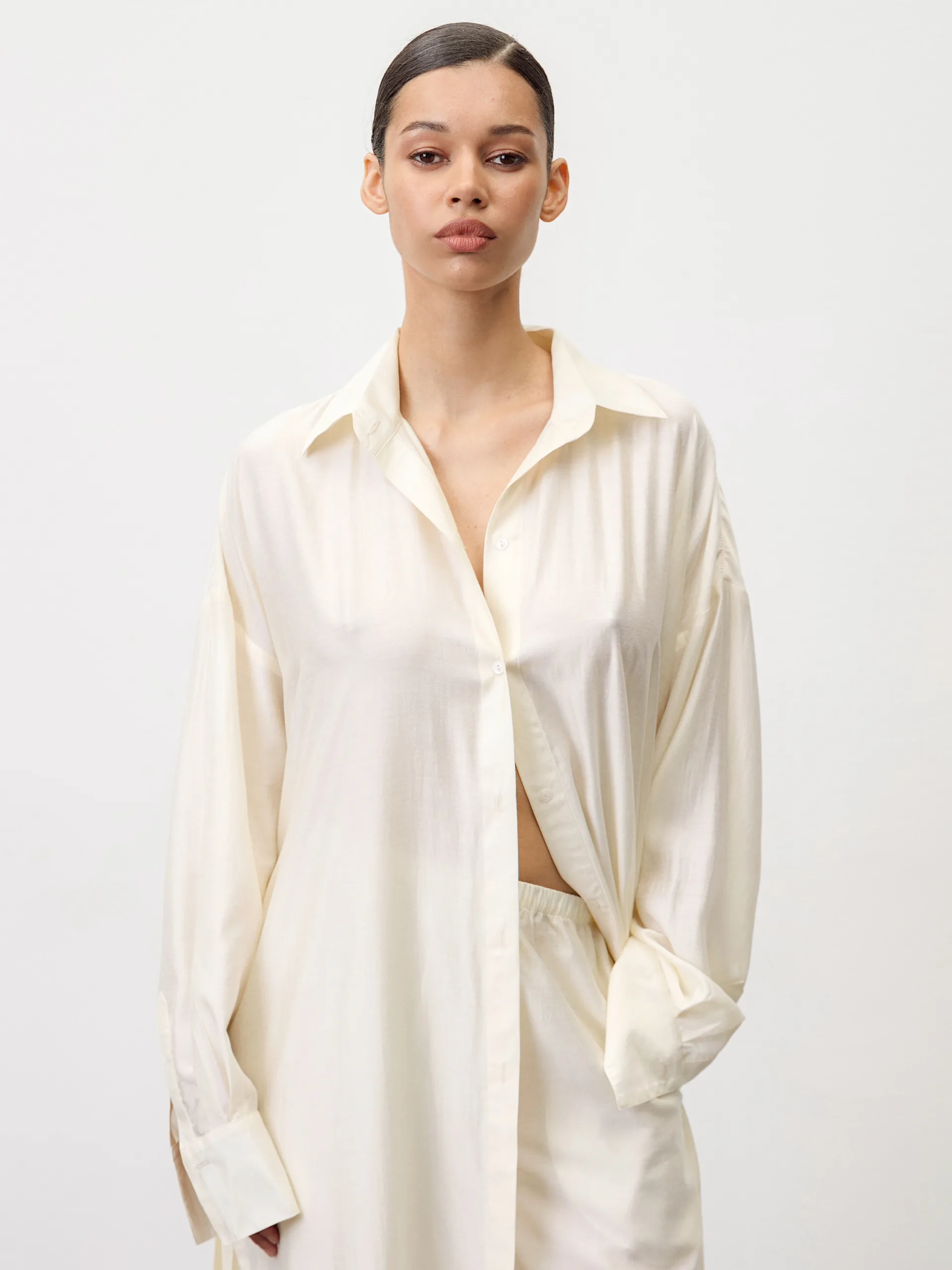 Сорочка з віскози та льону у ідеальному вершково-лимонному відтінку — легка, невагома, приємна до тіла. Летюча тканина красиво рухається під час ходи. Вільний оверсайз крій створює розслаблений силует і дає відчуття простору. Можна носити як самостійну річ, або вдягати як повноцінний комплект зі штанами. Ідеально підходить як для пляжних образів поверх купальника, так і для спекотних днів у місті, коли хочеться чогось легкого, але виразного.