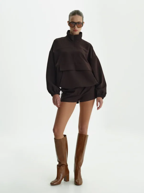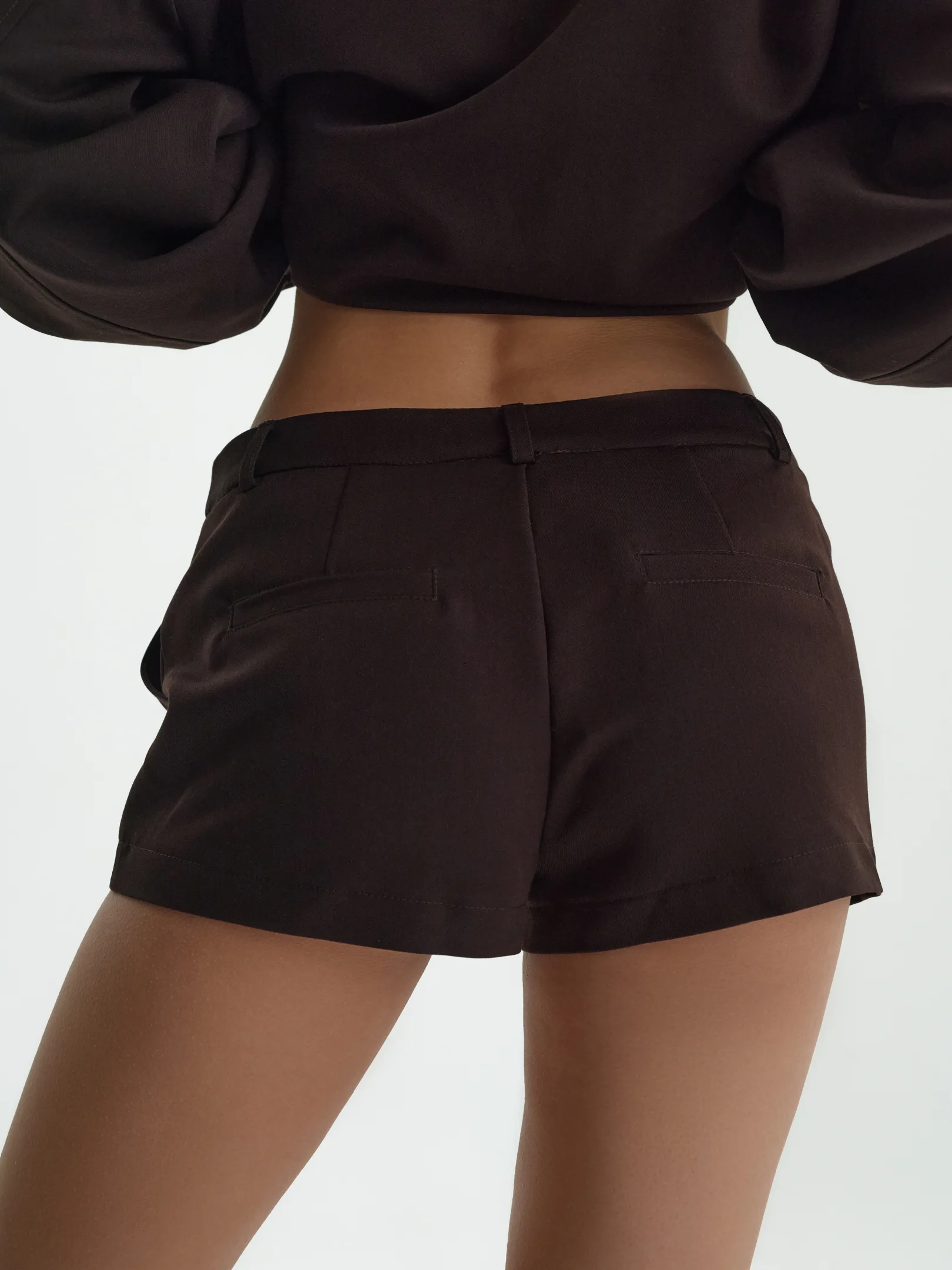 Шоколадні мінішорти, що додають свободи рухам і підкреслюють силует. Лаконічний крій, чисті лінії та правильна довжина. Посадка зручна, пояс із шлейками дозволяє доповнити їх ременем, але й без нього вони виглядають бездоганно.