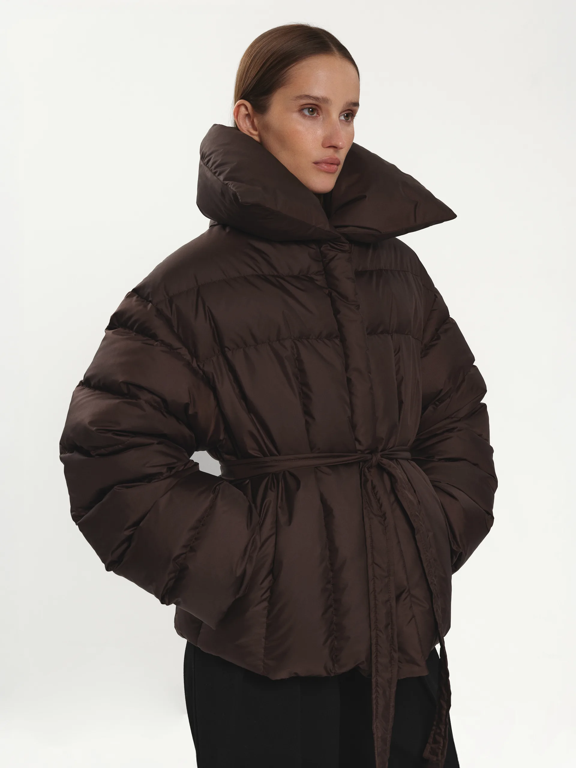 Шоколадна куртка-кімоно з натуральним пухом — тепла, м’яка й затишна, наче обійми. Завдяки наповненню вона легка, але чудово зігріває навіть у холодні дні. Пояс підкреслює талію, а широкий комір формує виразну лінію плечей і додає силуету завершеності.