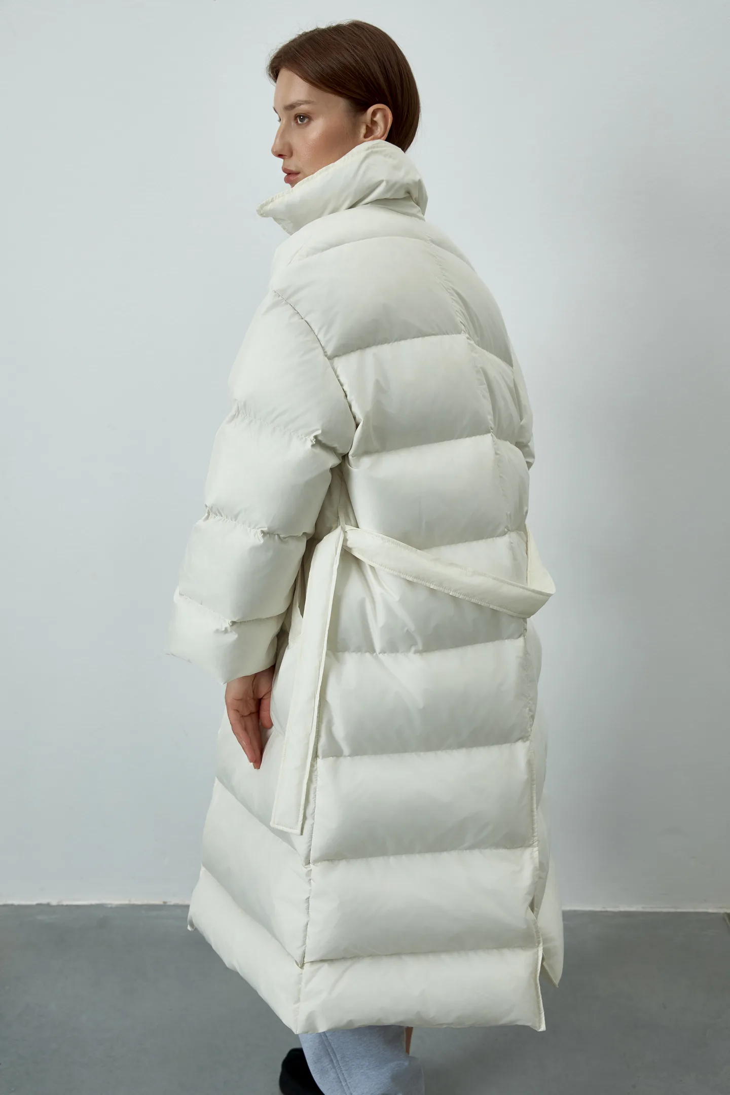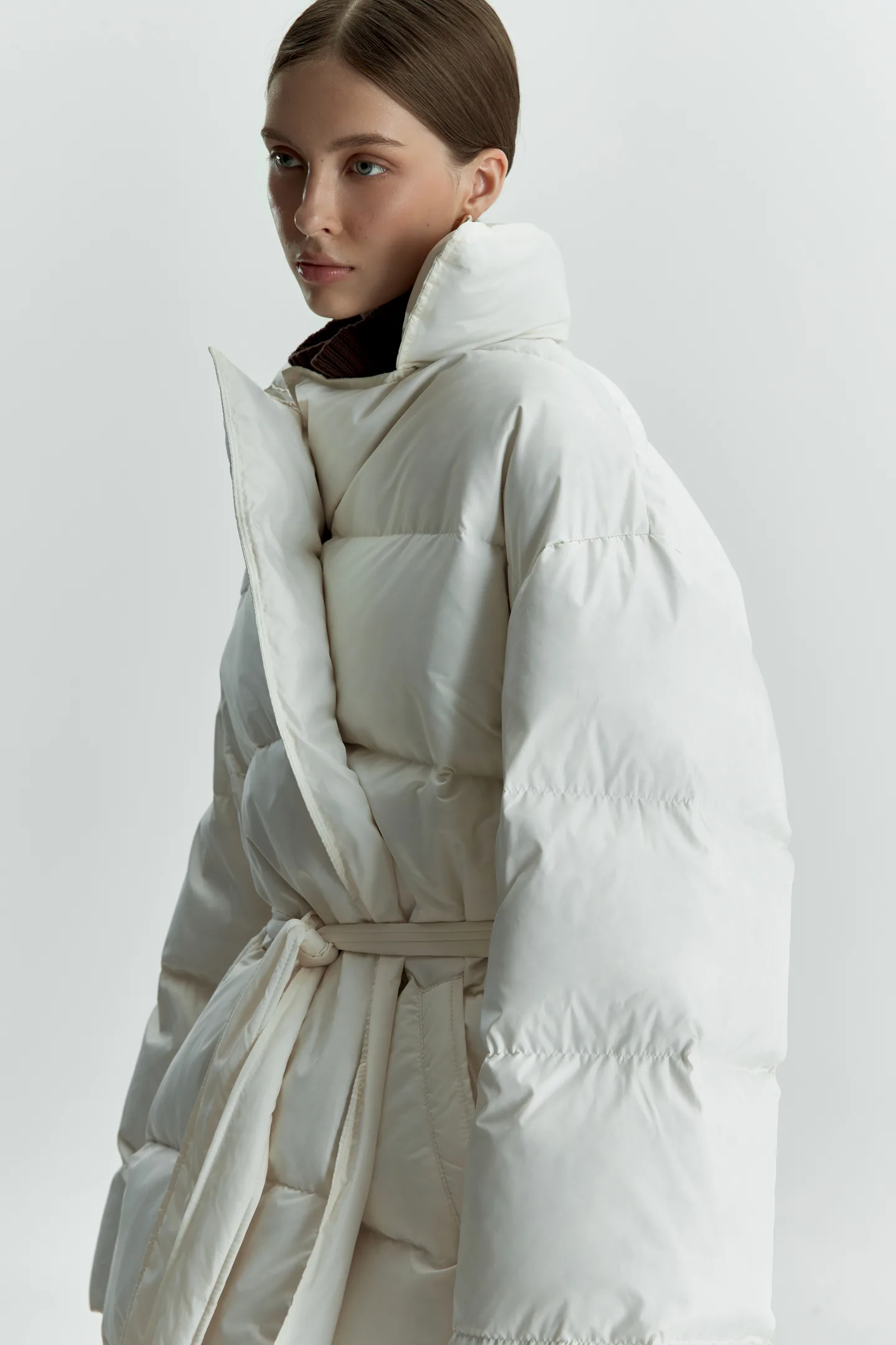 Пуховик має оверсайзний крій, що дозволяє носити під нього вʼязані светри для максимального комфорту. Особливістю моделі є її універсальність: завʼязавши пояс, ви отримуєте жіночний силует, що робить пуховик відмінною альтернативою пальту. Його можна поєднувати з різним взуттям для стильних зимових образів.